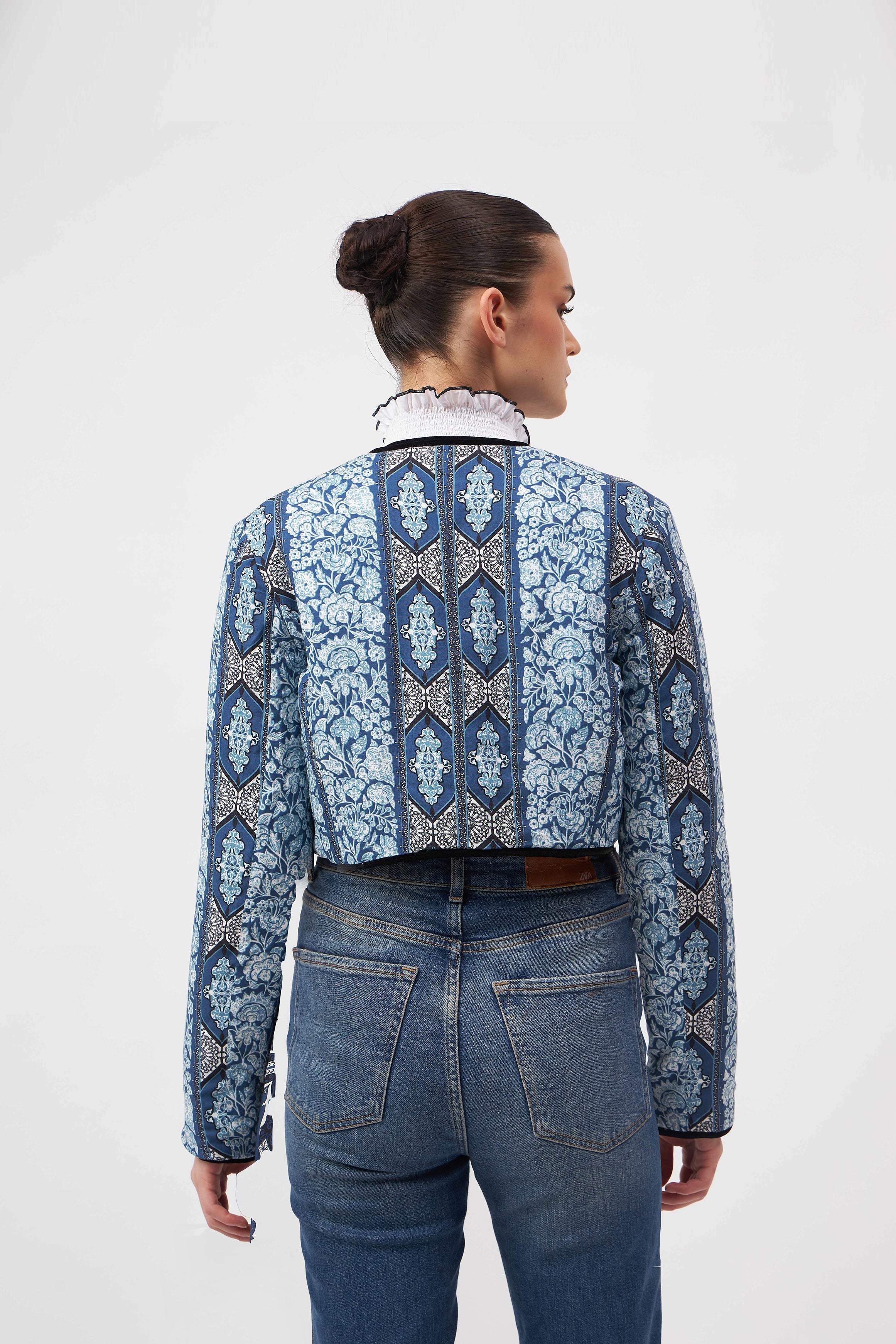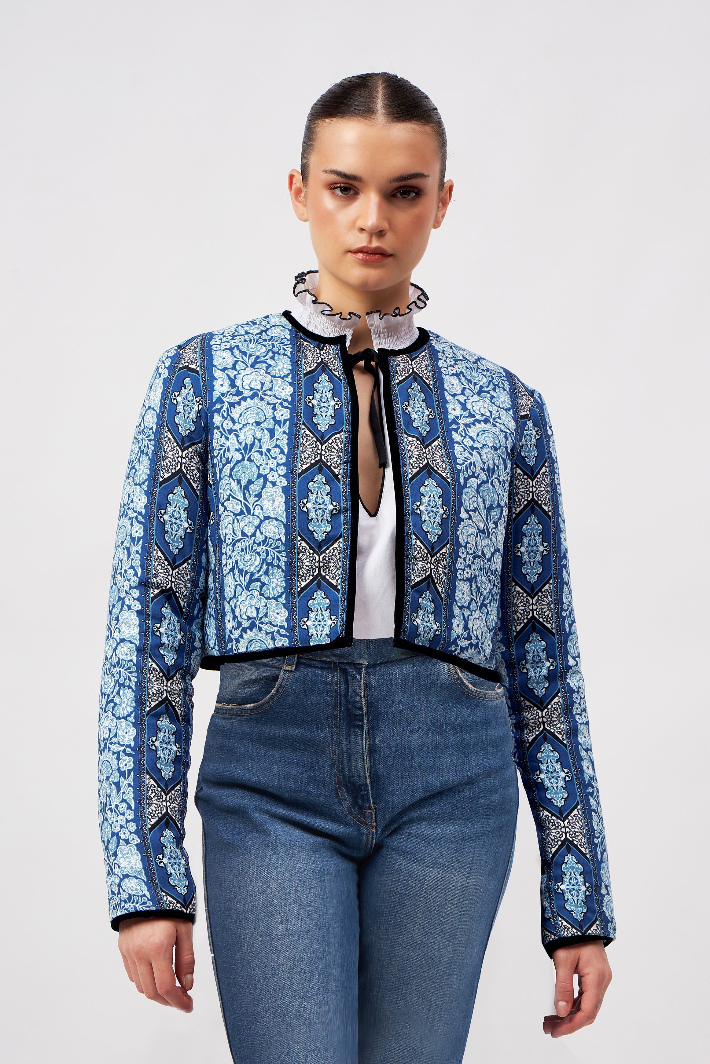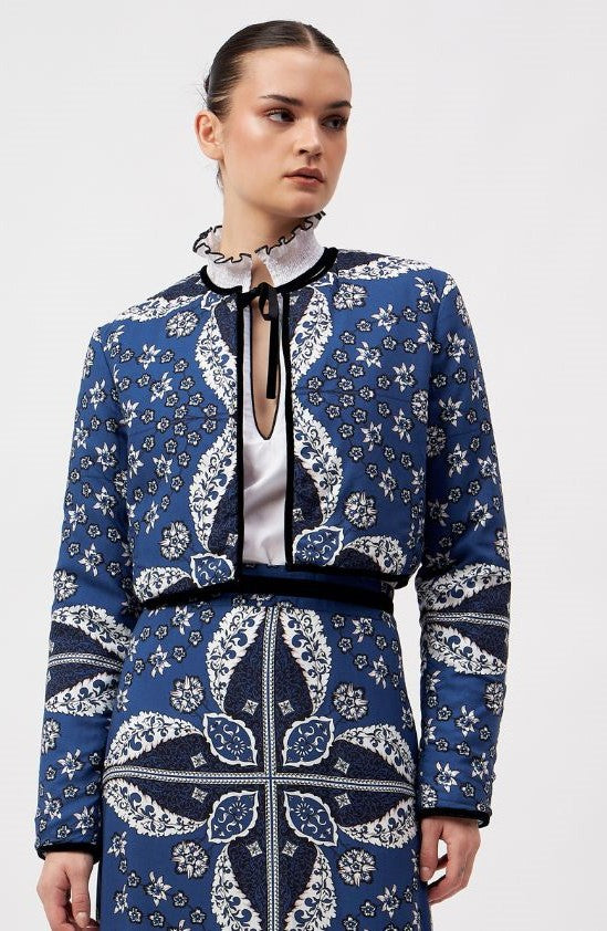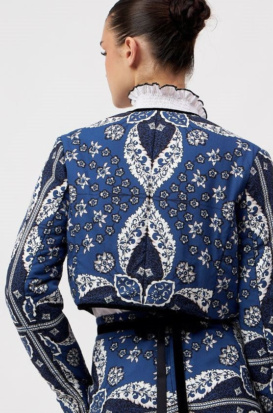 Introducing a contemporary masterpiece, this exquisite cropped jacket is a reversible marvel, offering two looks in one statement piece. Lined with the softest cotton, it not only provides unparalleled comfort but also shapes a beautiful silhouette. Versatile and refined, it effortlessly complements both elegant dresses and casual pants. The print design of the outer shell is influenced by ancient Berber-Roman stone carvings. Reflecting the charm of Bahia Palace in Marrakesh, this print design draws inspiration from the grand tiles of the palace, blending geometric elegance with whimsical ornaments in celebration of Moroccan mosaic artistry.