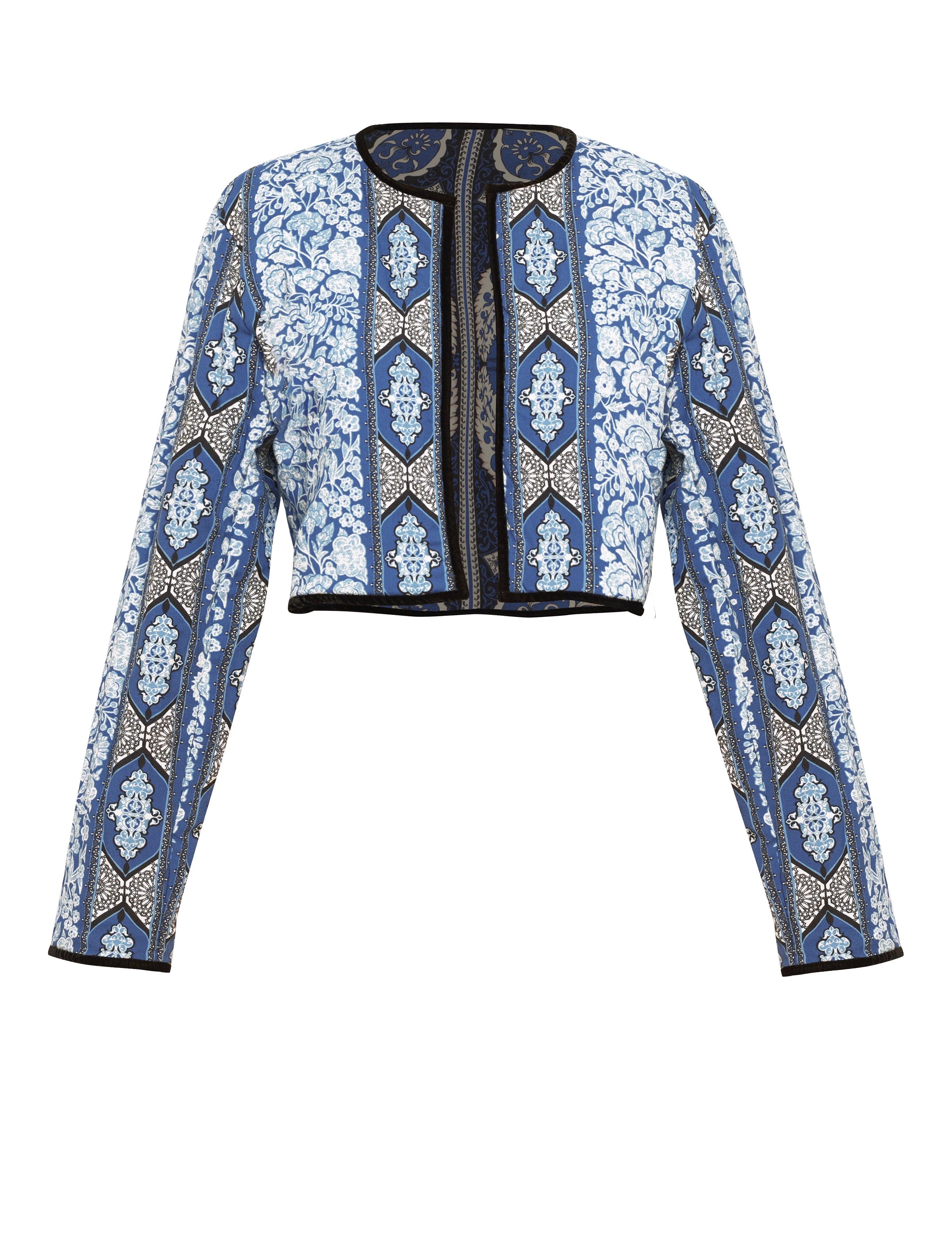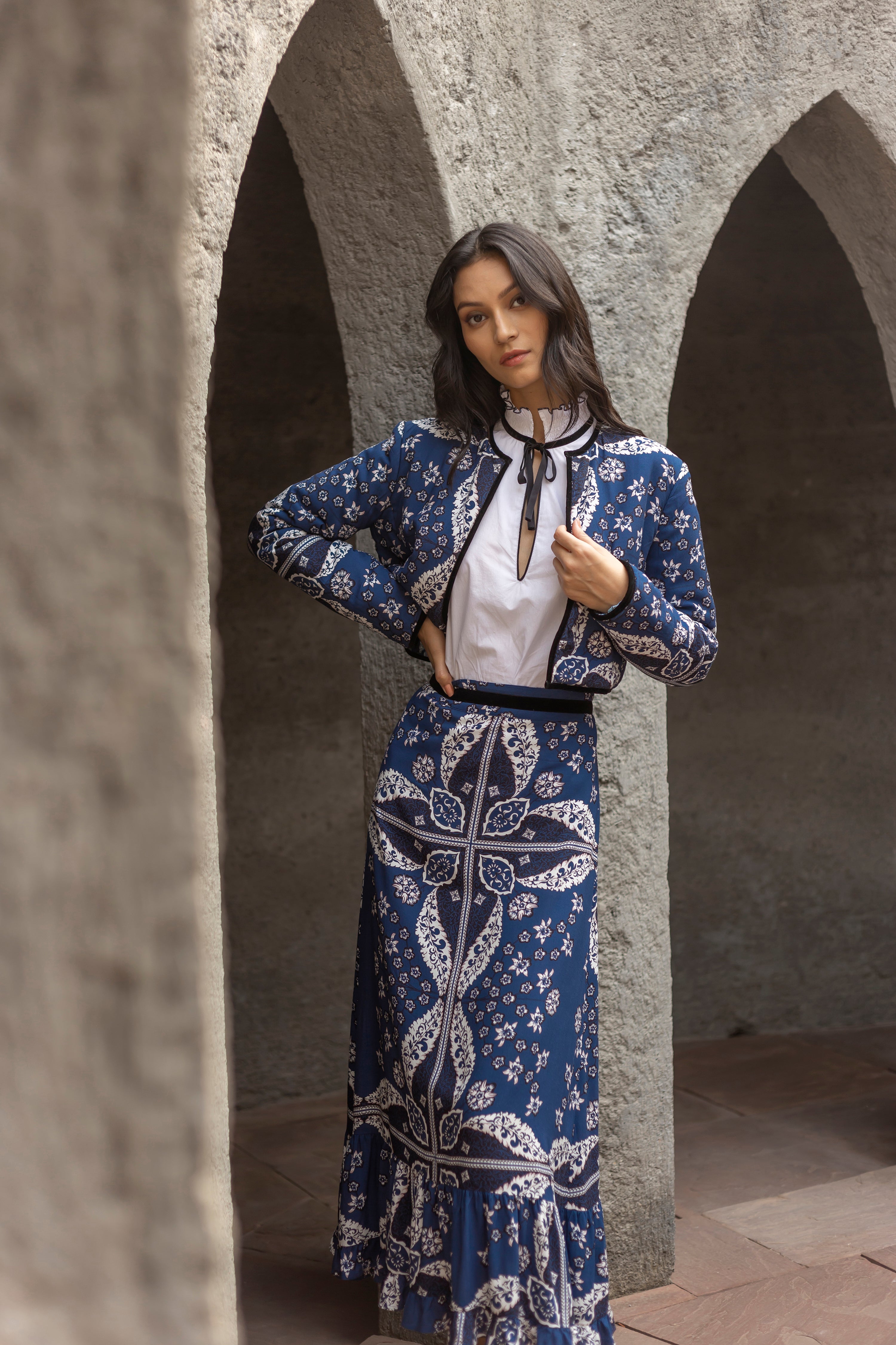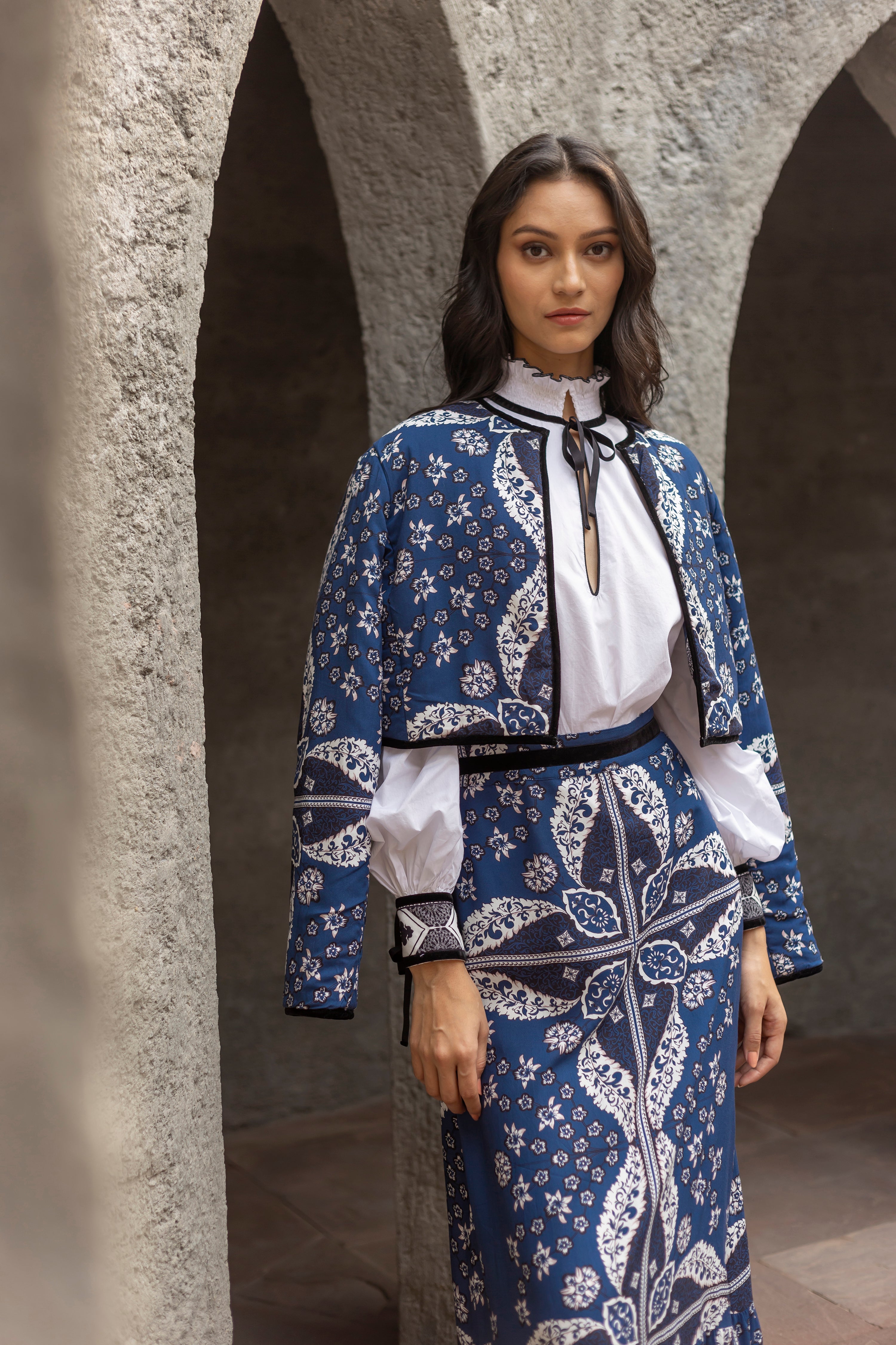 Introducing a contemporary masterpiece, this exquisite cropped jacket is a reversible marvel, offering two looks in one statement piece. Lined with the softest cotton, it not only provides unparalleled comfort but also shapes a beautiful silhouette. Versatile and refined, it effortlessly complements both elegant dresses and casual pants. The print design of the outer shell is influenced by ancient Berber-Roman stone carvings. Reflecting the charm of Bahia Palace in Marrakesh, this print design draws inspiration from the grand tiles of the palace, blending geometric elegance with whimsical ornaments in celebration of Moroccan mosaic artistry.
