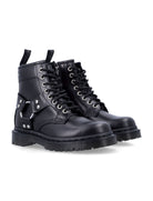 This iconic black leather boot features the signature 8-eyelet lacing system and distinctive harness strap with metal hardware for an elevated moto-inspired look.