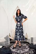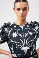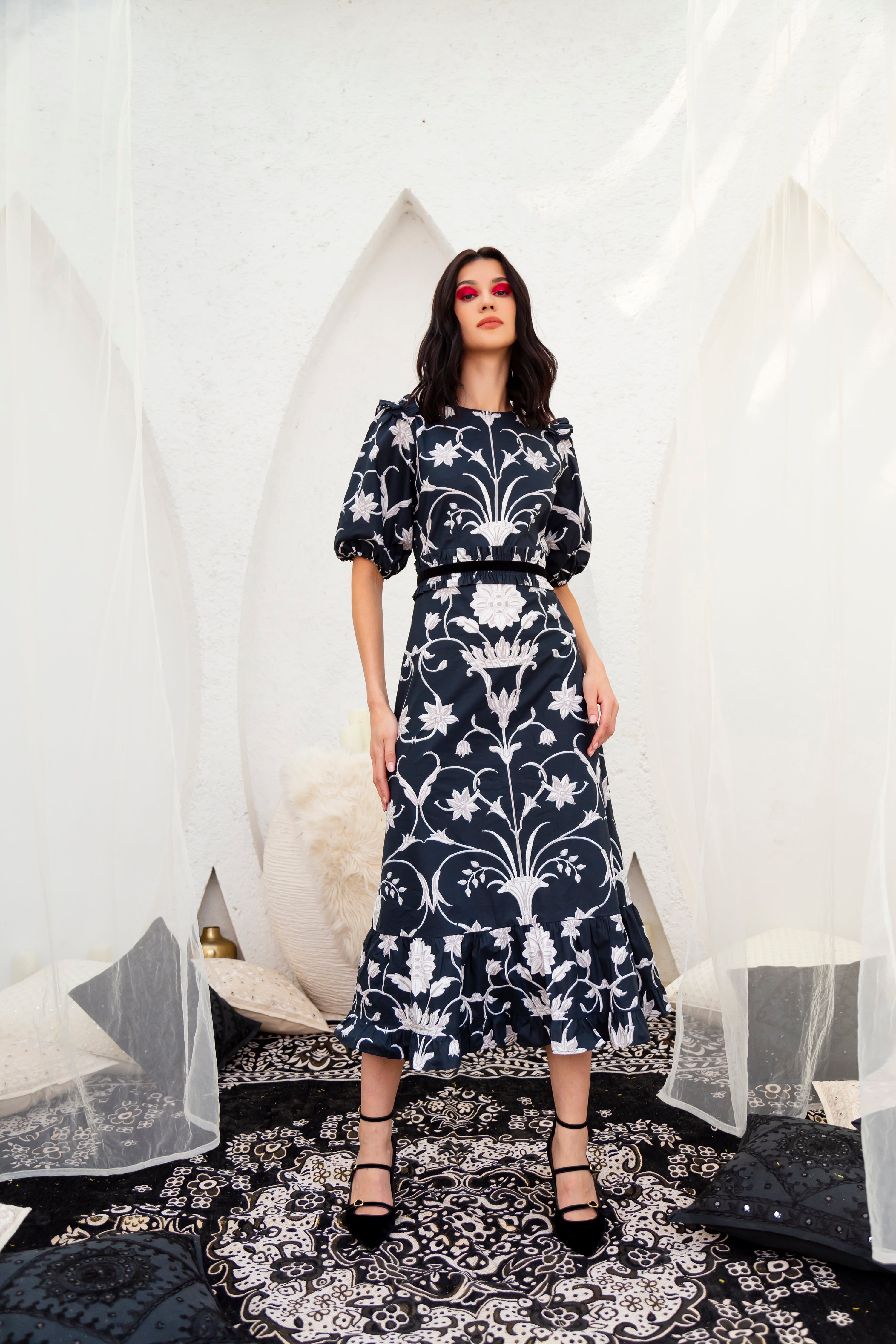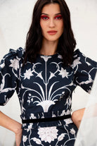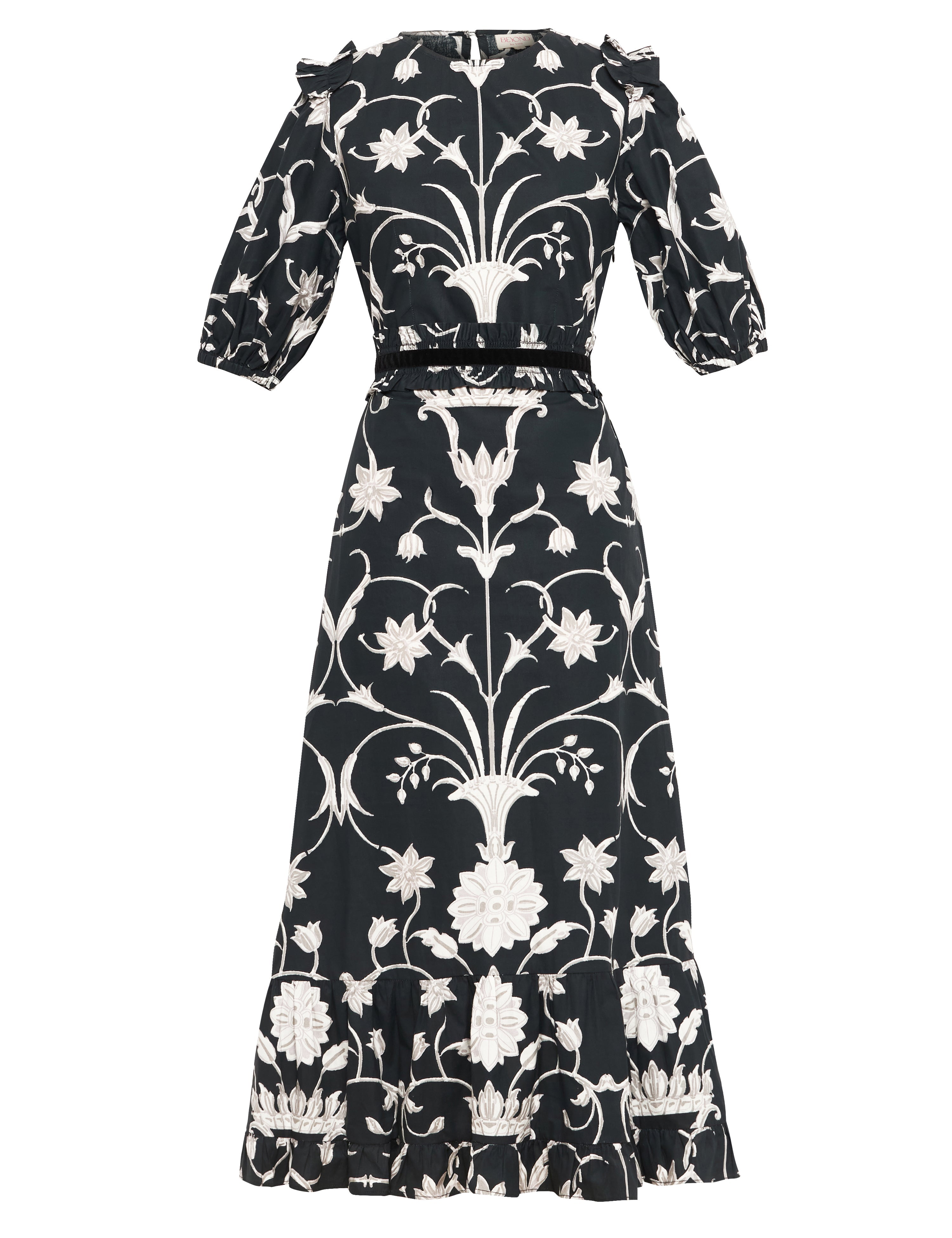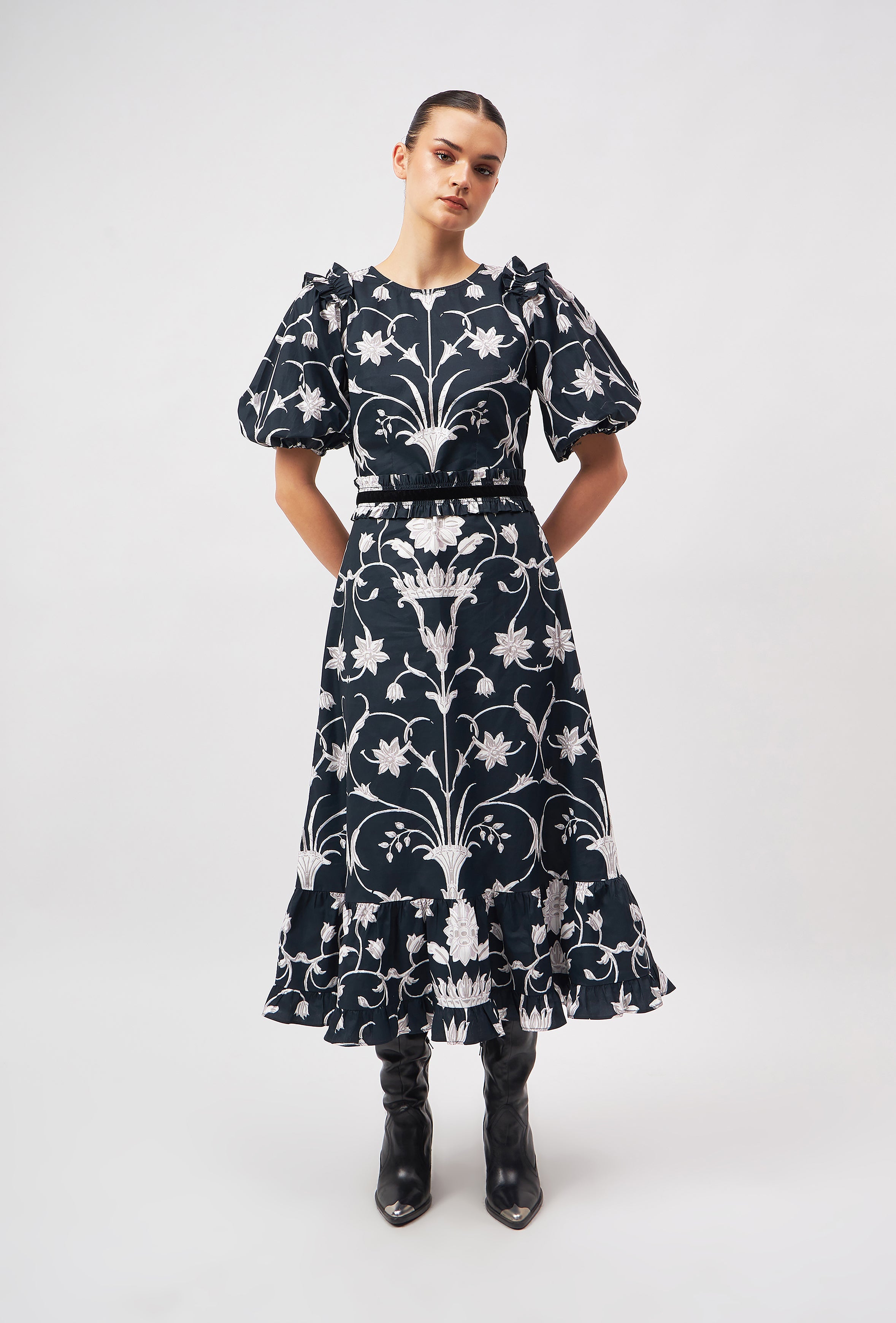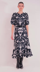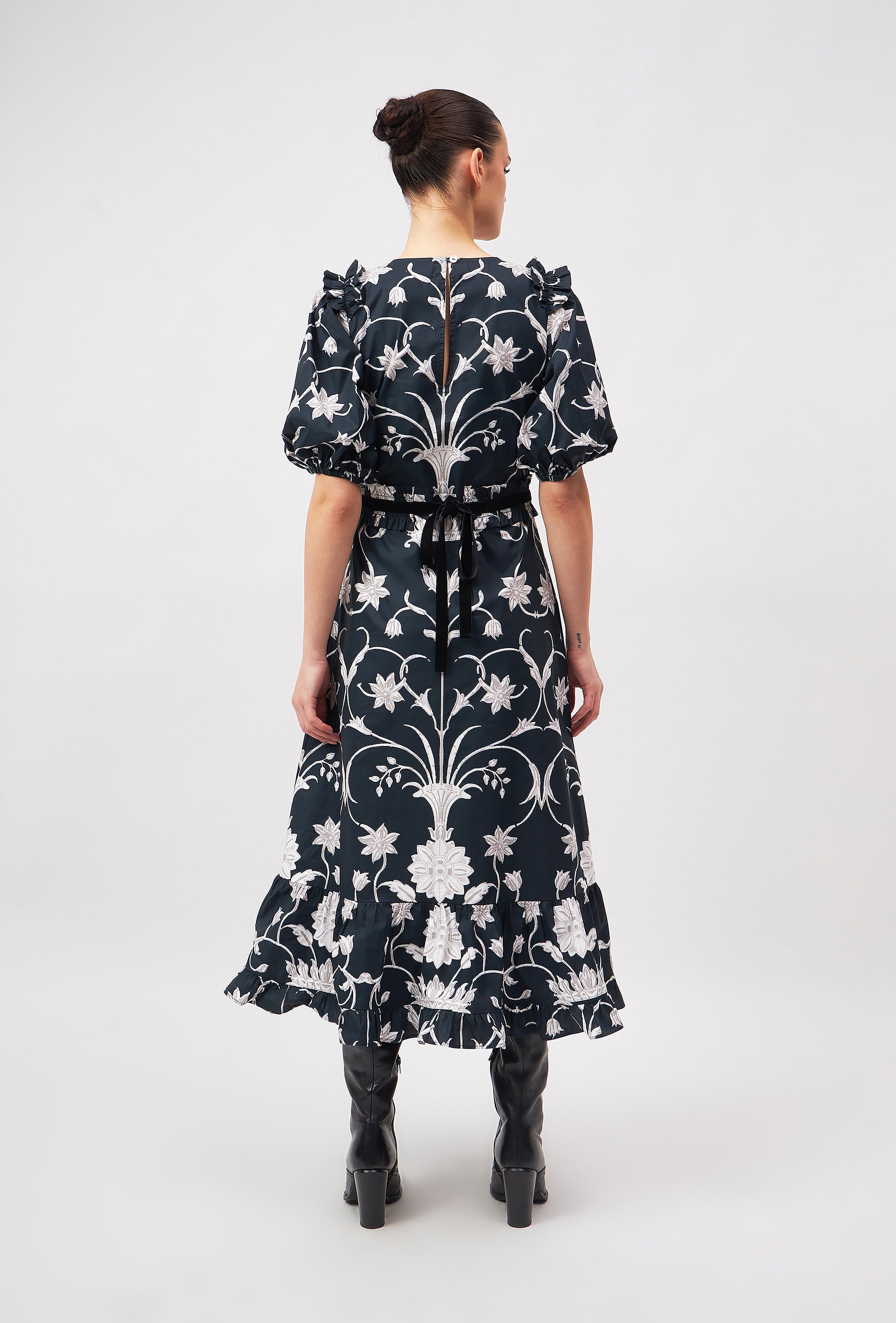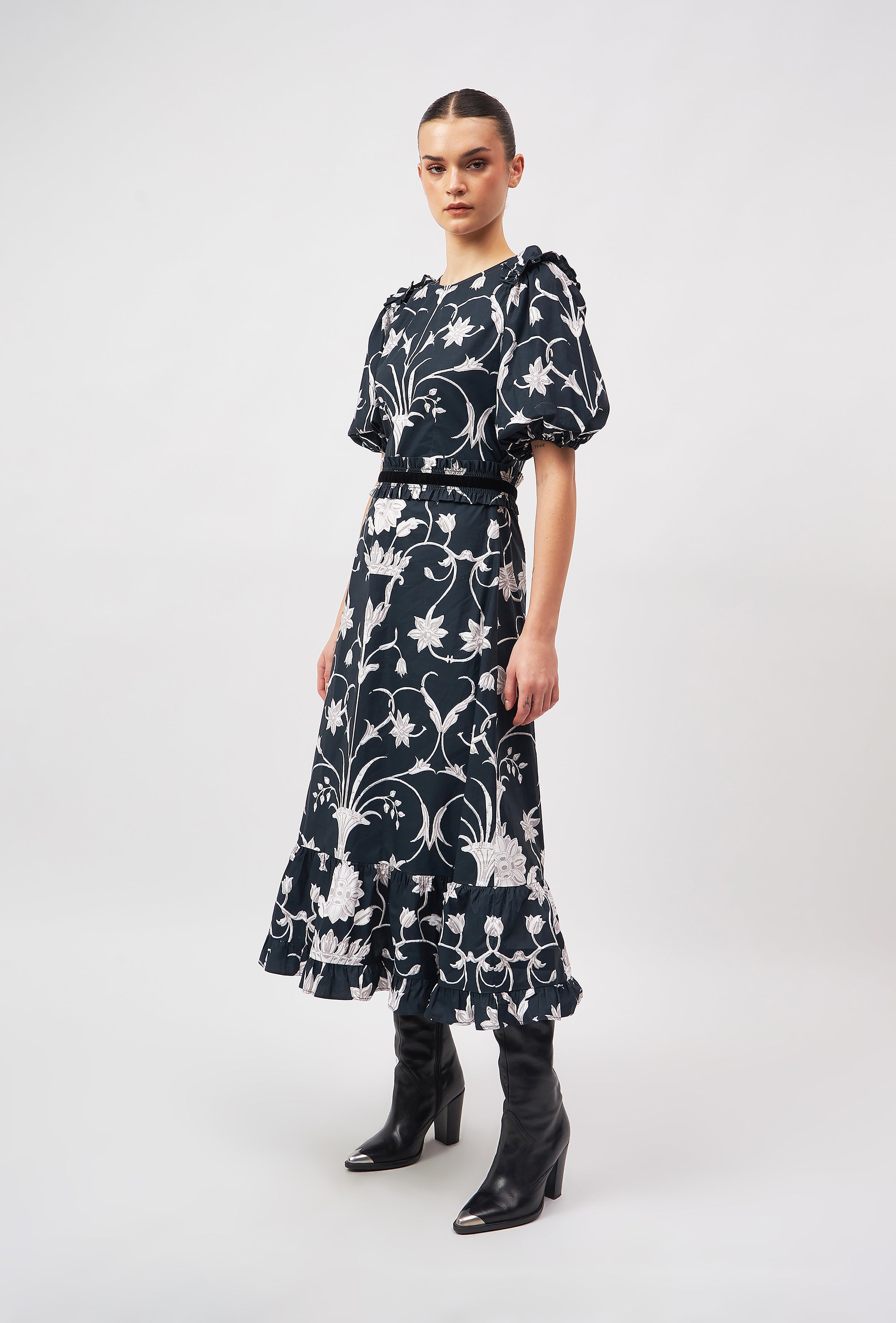 The Antonia is a wonderful choice for special occasions and everyday agendas alike. Cut with puffed sleeves, elastic cuffs and adorned with subtle frills, the Antonia falls to a slender A-line creating a flattering silhouette. Accentuate the waist with the featured belt. The print design is influenced by ancient Berber-Roman stone carvings found near the city of Meknes in Morocco. The artwork references stylized floral motifs set in perfect symmetry.