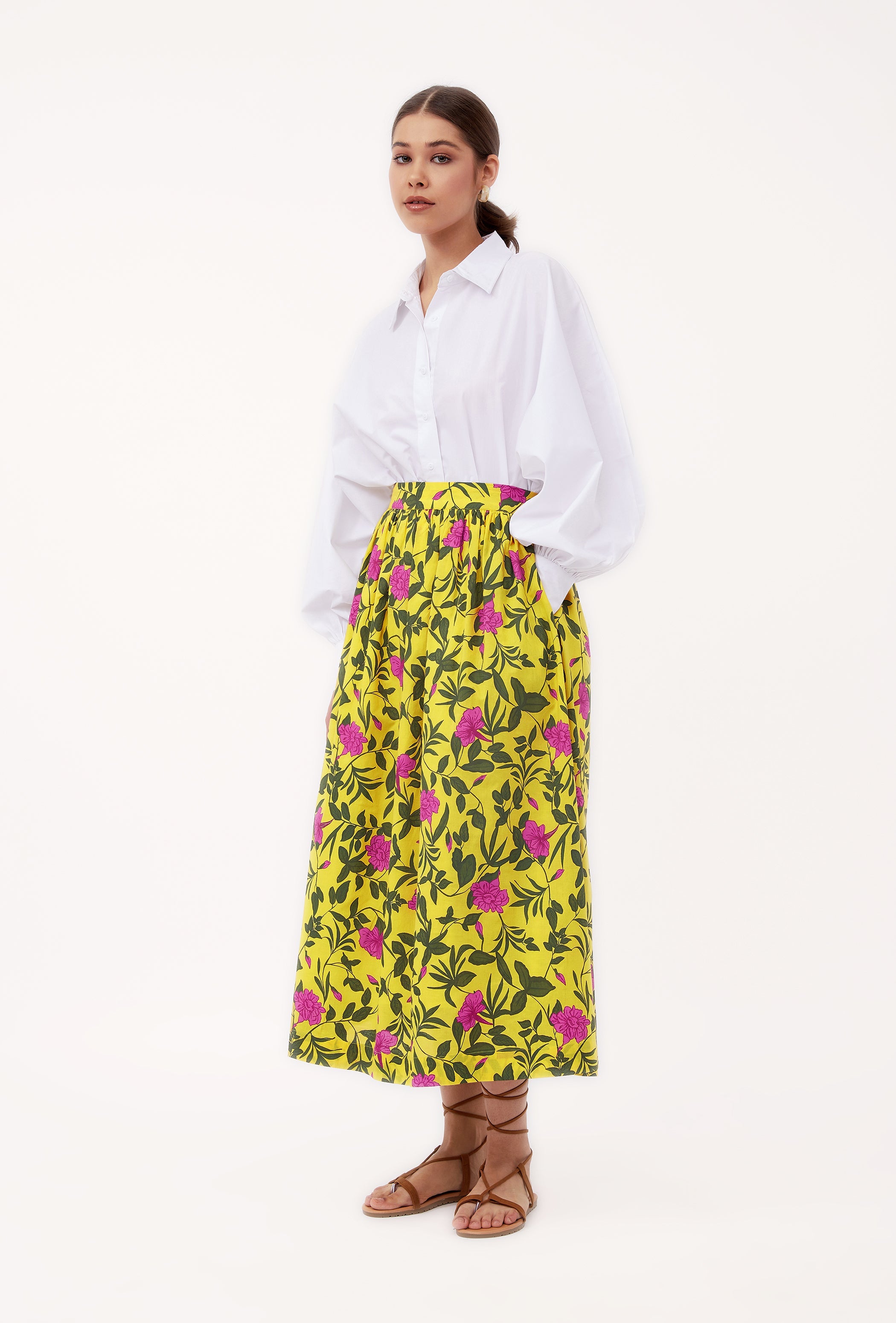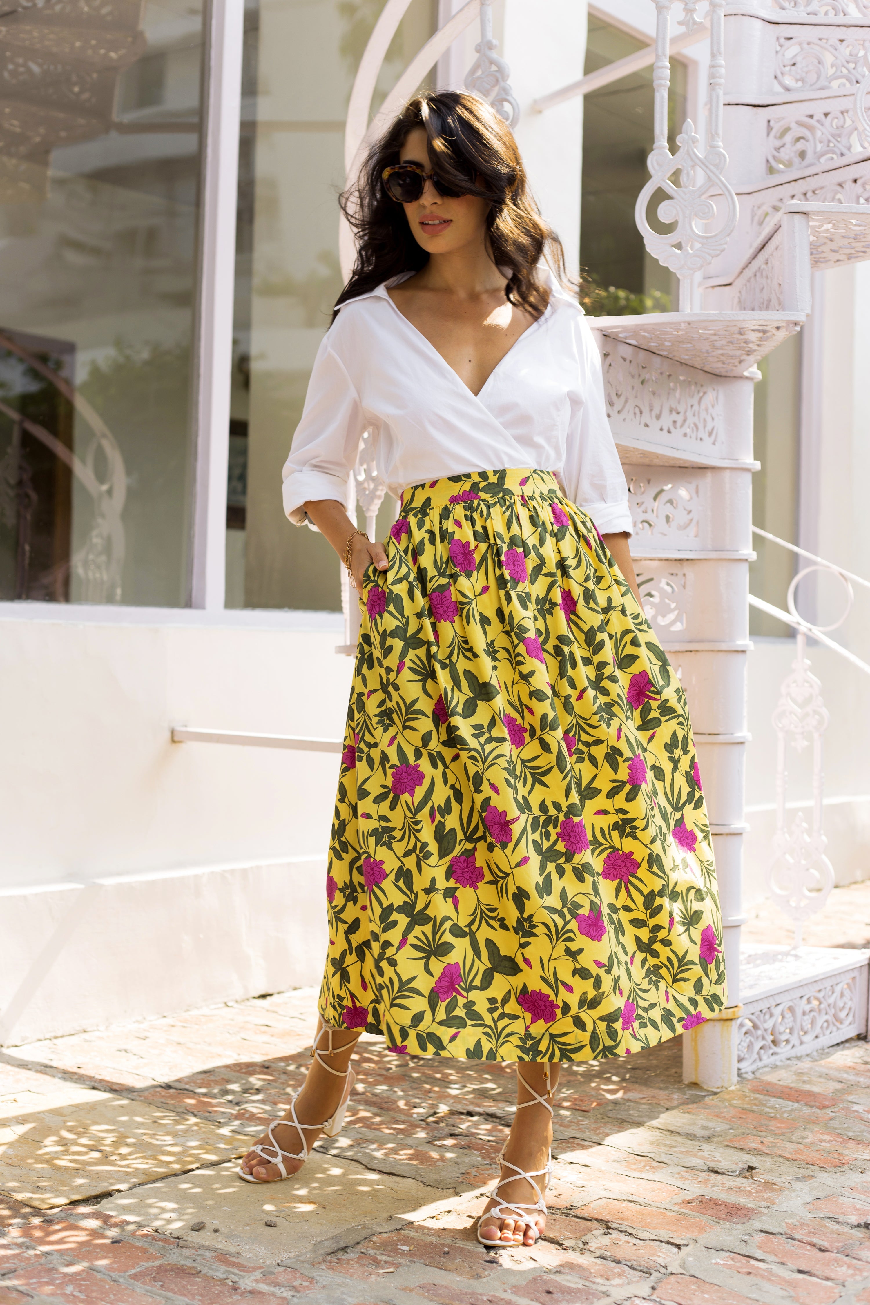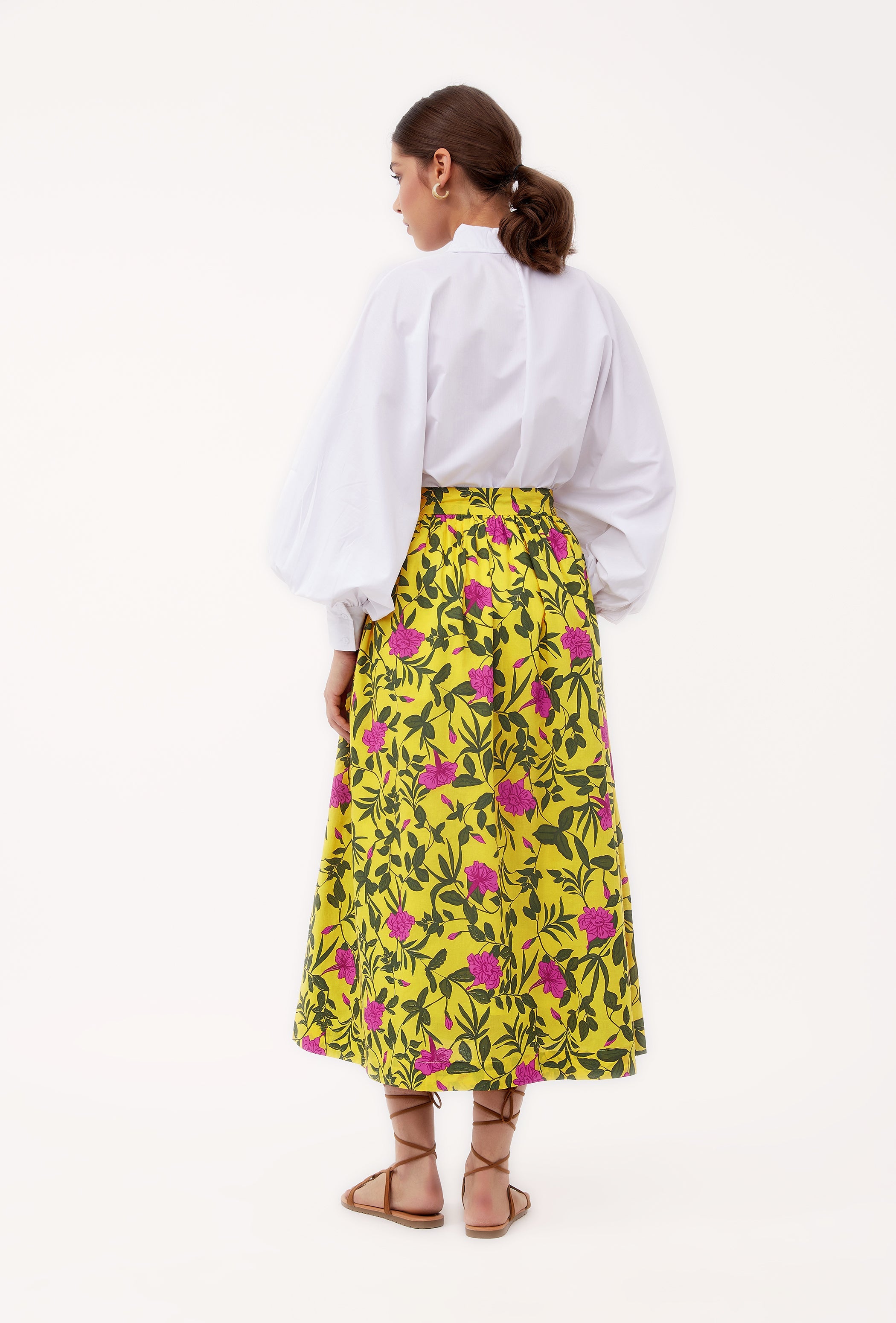 The Anna skirt is a perfect companion for leisurely strolls through the charming streets of Florence. The midi skirt features a flattering A-line silhouette, hidden pockets, and an adjustable waist. Pair it with flats and a white tee for a casual daytime look, or dress it up with heels for a sophisticated evening ensemble. Anna is made from a soft, breathable cotton cambric fabric that will keep you cool on a hot summer day. The print design echoes the charm of Tuscan gardens in full bloom, showcasing vivid depictions of lilies and lush greens.