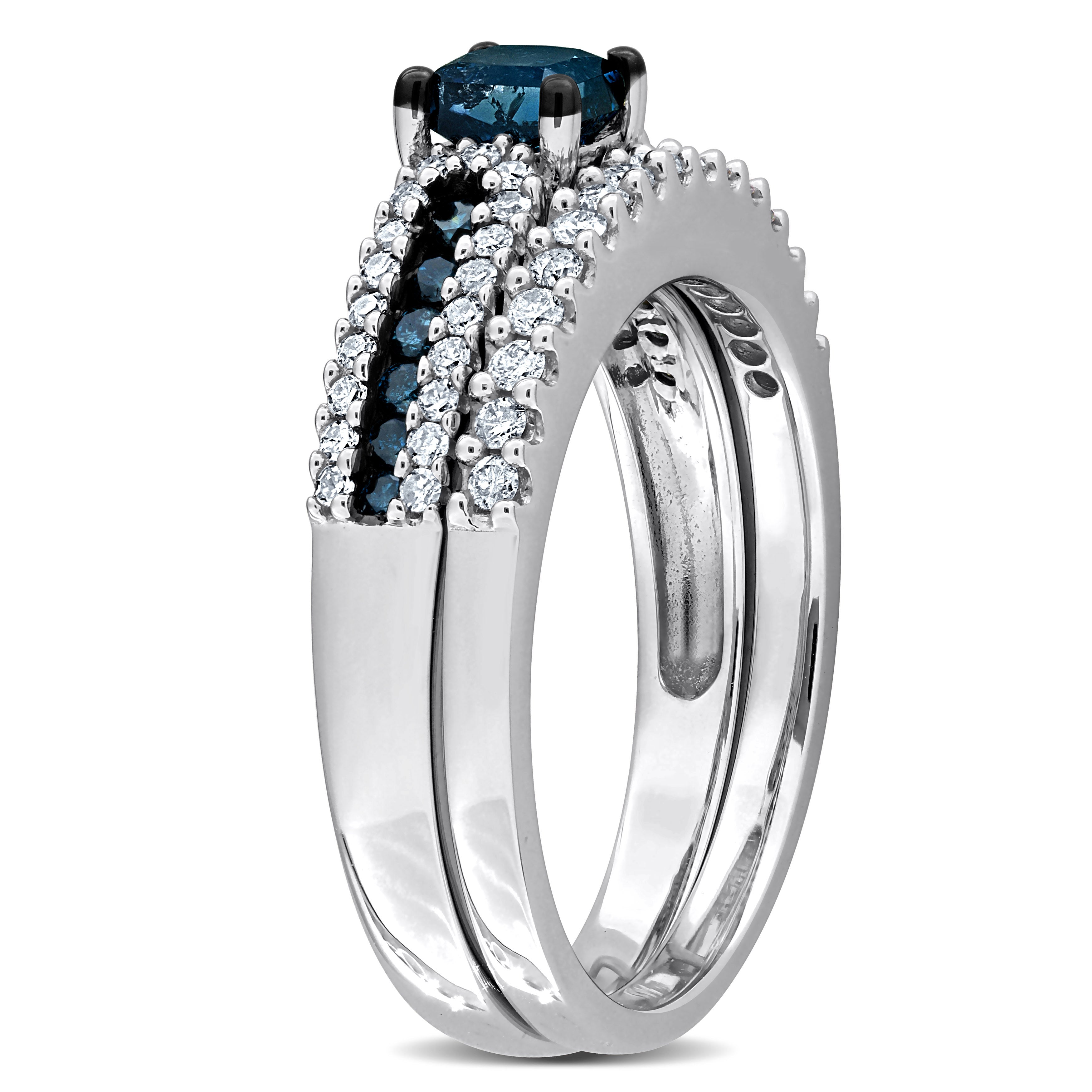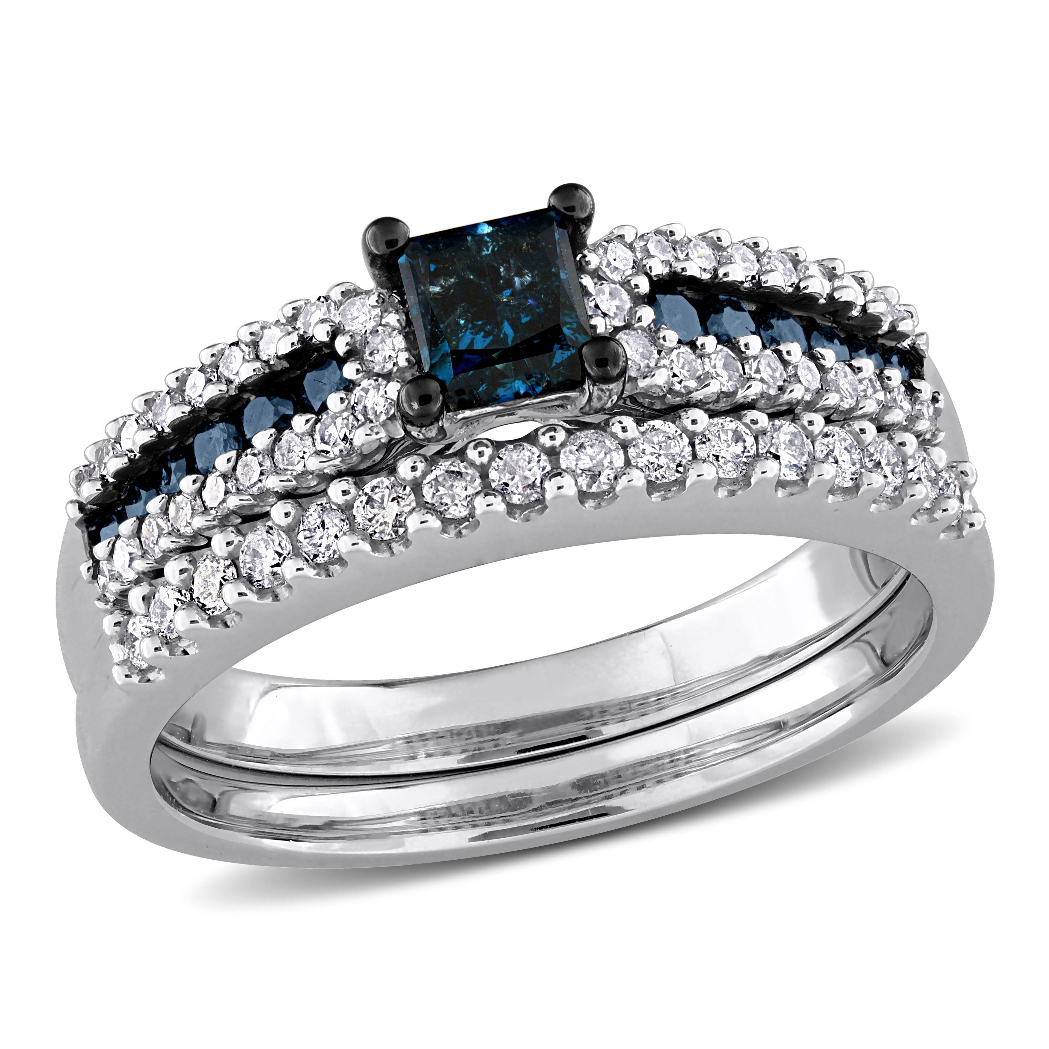 This lovely bridal ring set features an engagement ring with a princess-cut blue diamond center stone with round-cut blue and white diamond side stones. This set also includes a diamond wedding band. The bridal ring set is crafted of fine 10k white gold with black rhodium plating along the prongs and enhanced with a high polish finish.