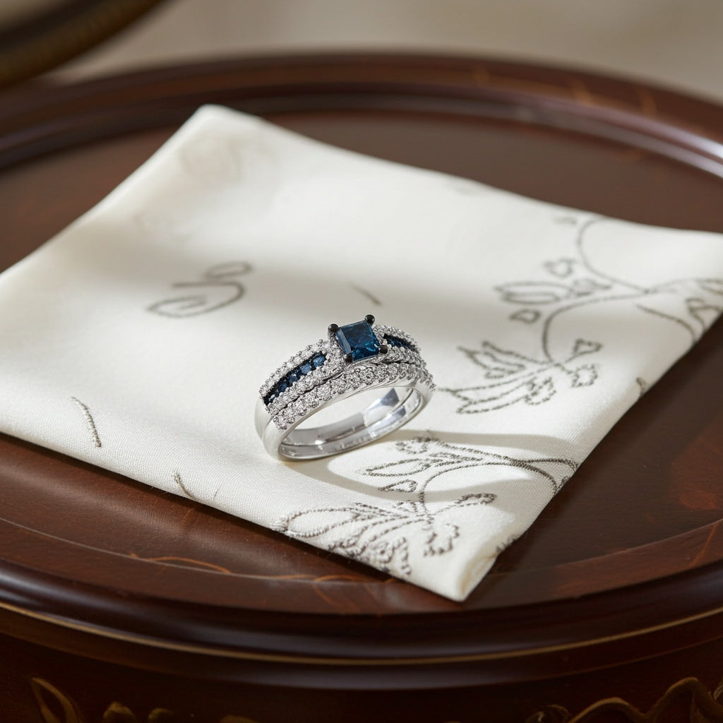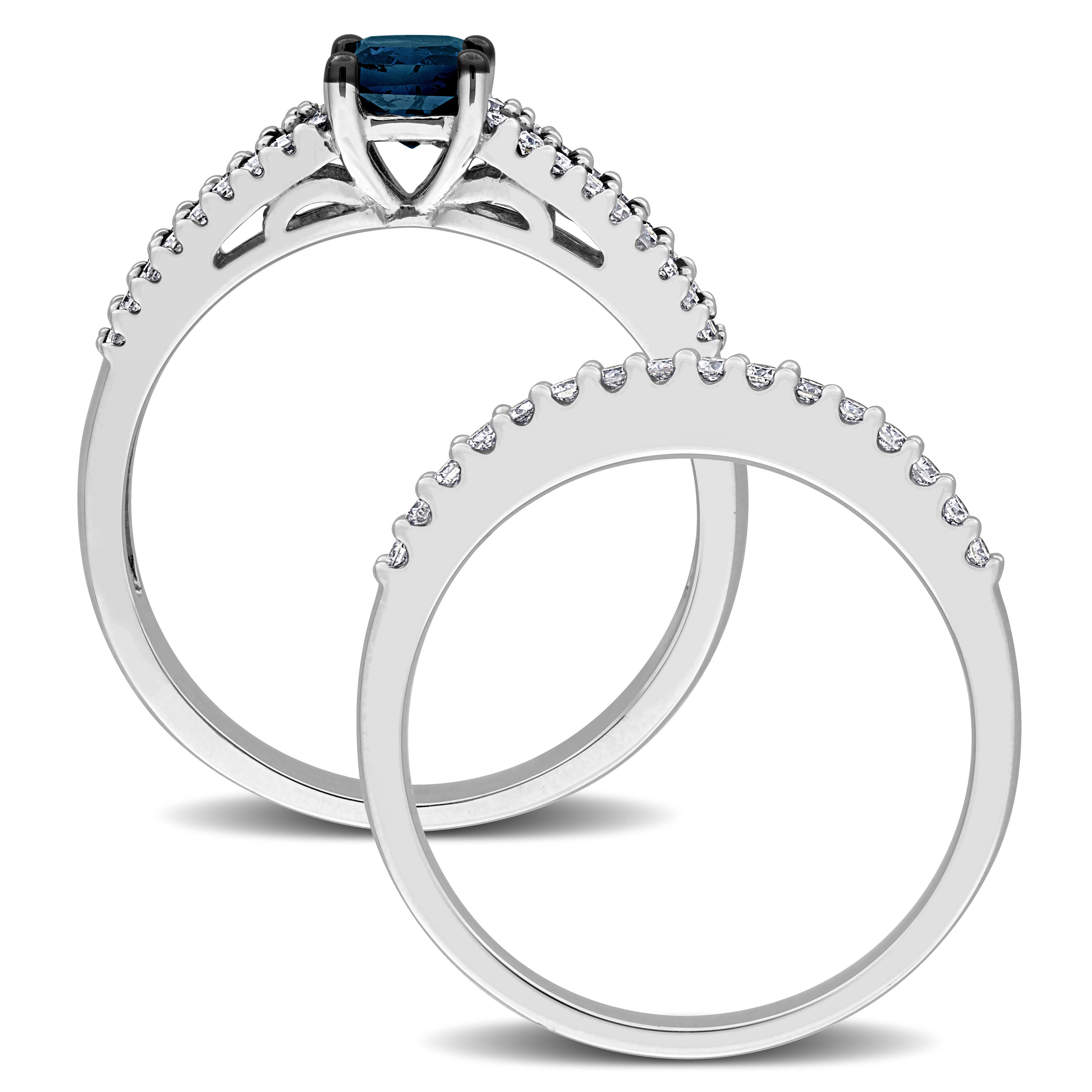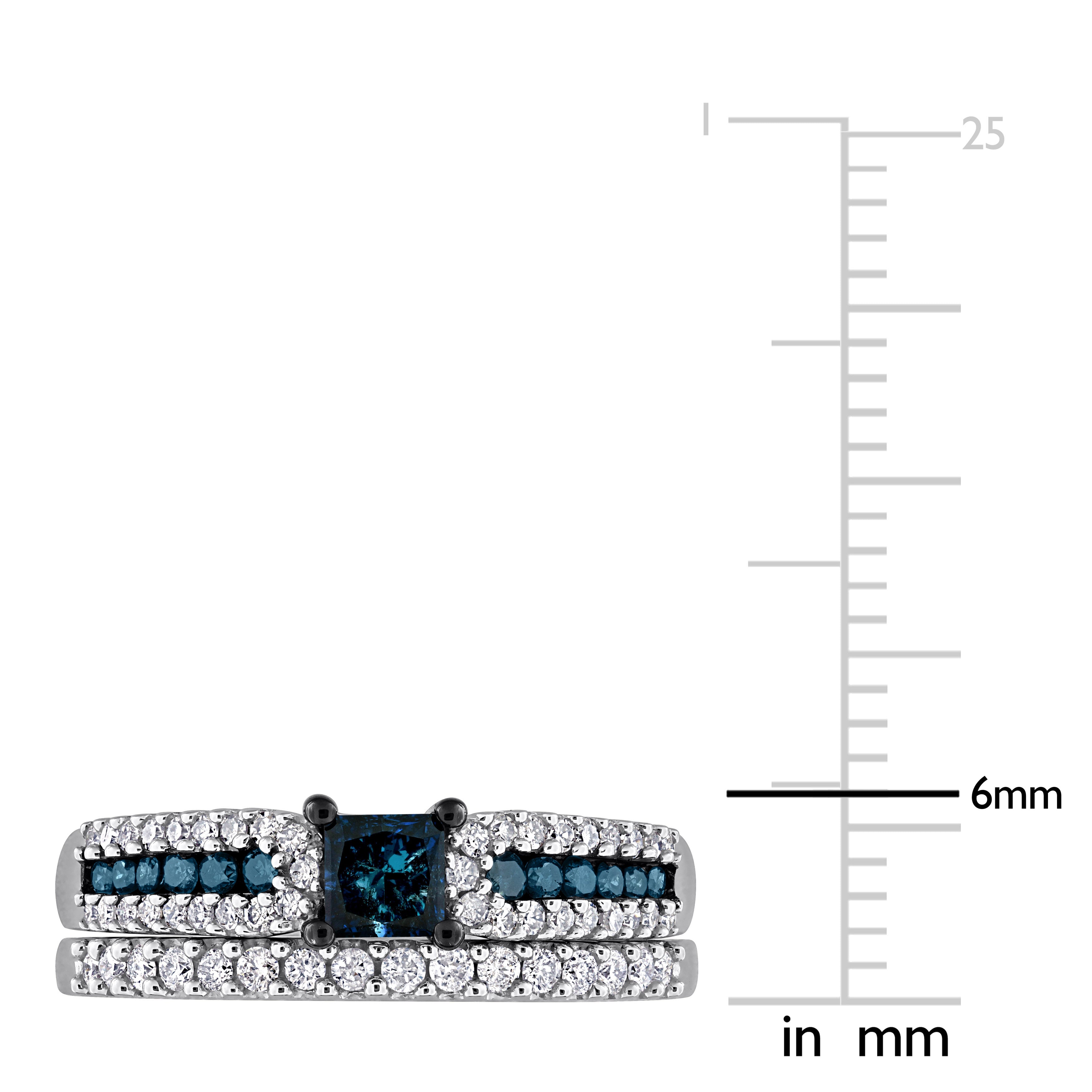 1ct. T.W. Blue & White Diamond Princess Bridal Set in 10k White Gold