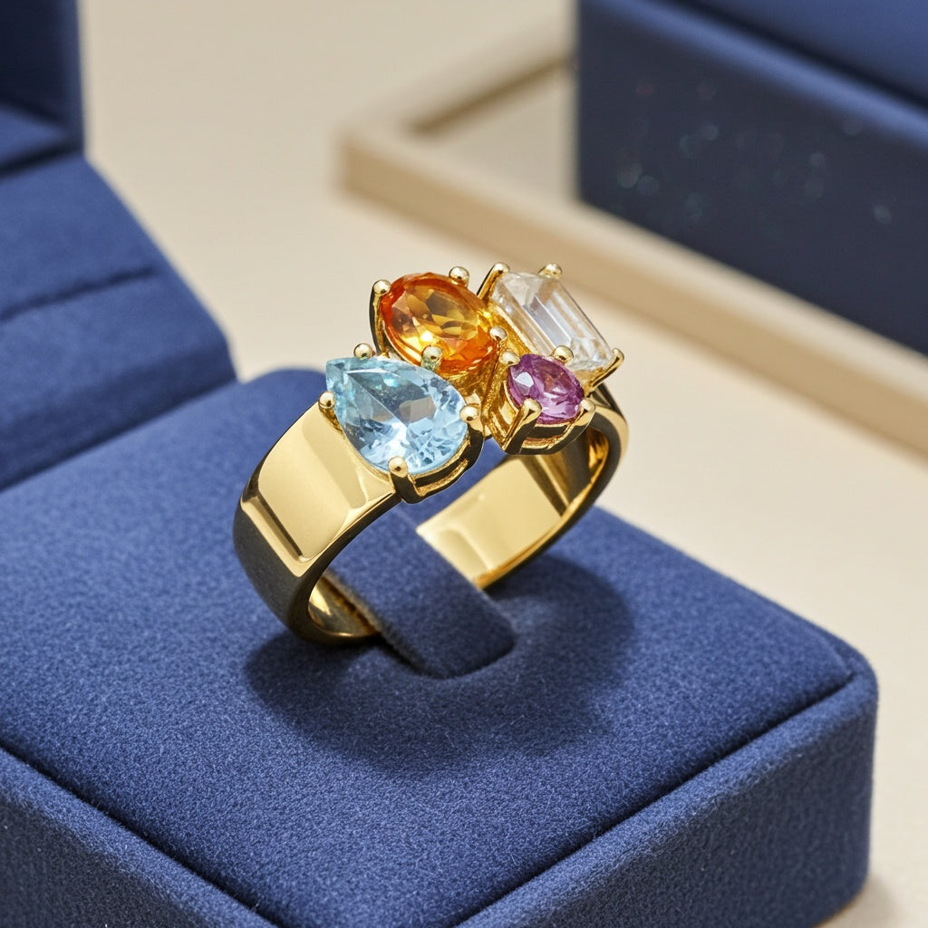 This vibrant open ring features a combining array of gemstones, including a pear-shaped blue topaz, an oval Madeira citrine, a baguette-cut green quartz and a round pink amethyst all set in sterling silver. The varied shapes and rich colors of the gemstones create a unique and eye-catching design, while the warm sterling silver enhances the luxurious feel of the piece. This bold and colorful ring is perfect for making a statement, adding a playful yet elegant touch to any outfit.