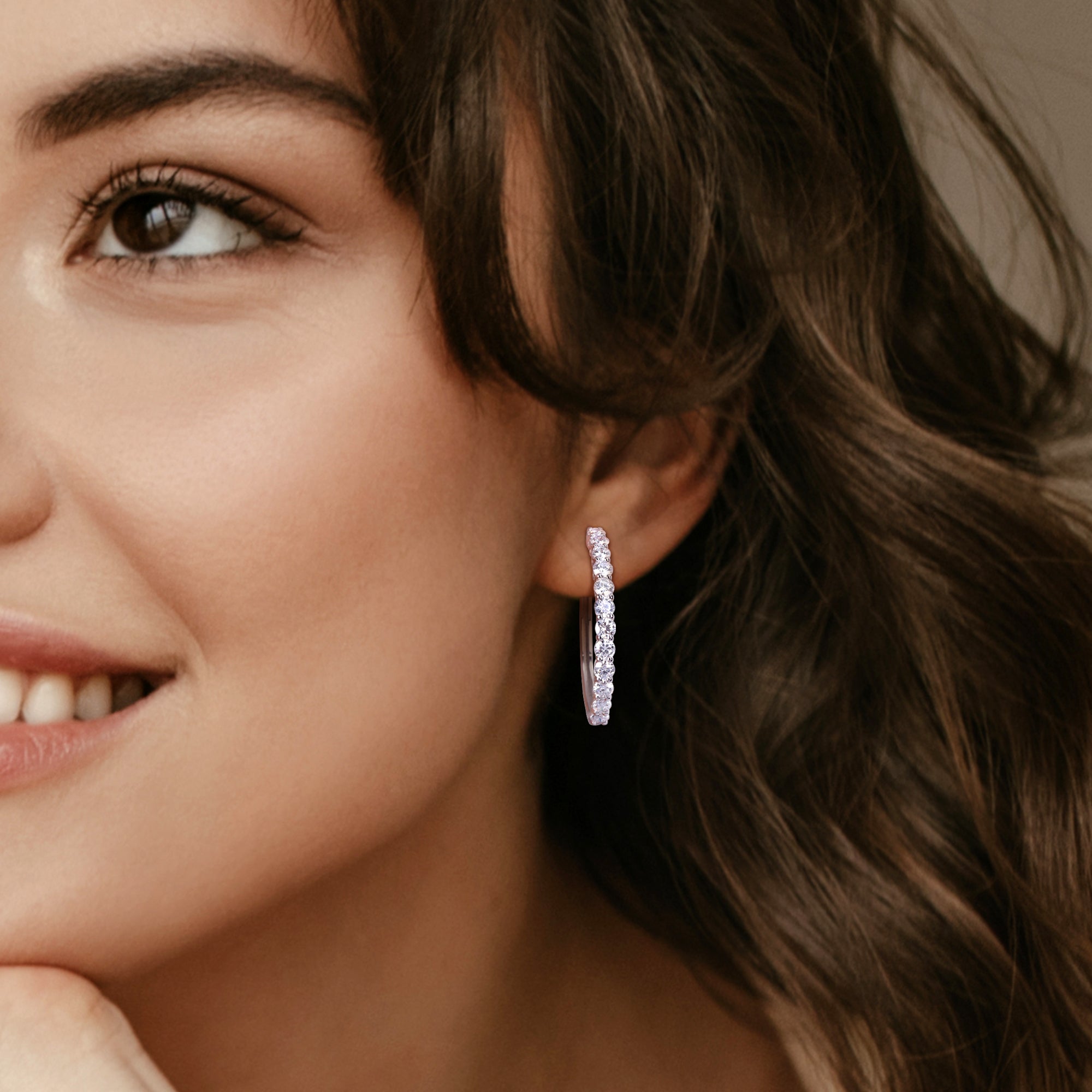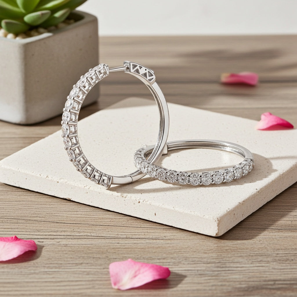 Illuminate your look with our Lab-Grown Diamond Hoop Earrings, elegantly crafted in 14k white gold. These glamorous hoop earrings feature a line of sparkling lab-grown diamonds that wrap beautifully around the full circumference, offering a continuous shimmer from every angle. Perfect for both formal occasions and upscale casual wear, these hoops balance modern luxury with sustainability. The secure clasp ensures they stay in place, making them not just stunning, but also practical. Elevate your jewelry collection with these exquisite, environmentally conscious diamond hoop earrings.