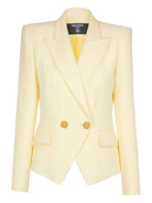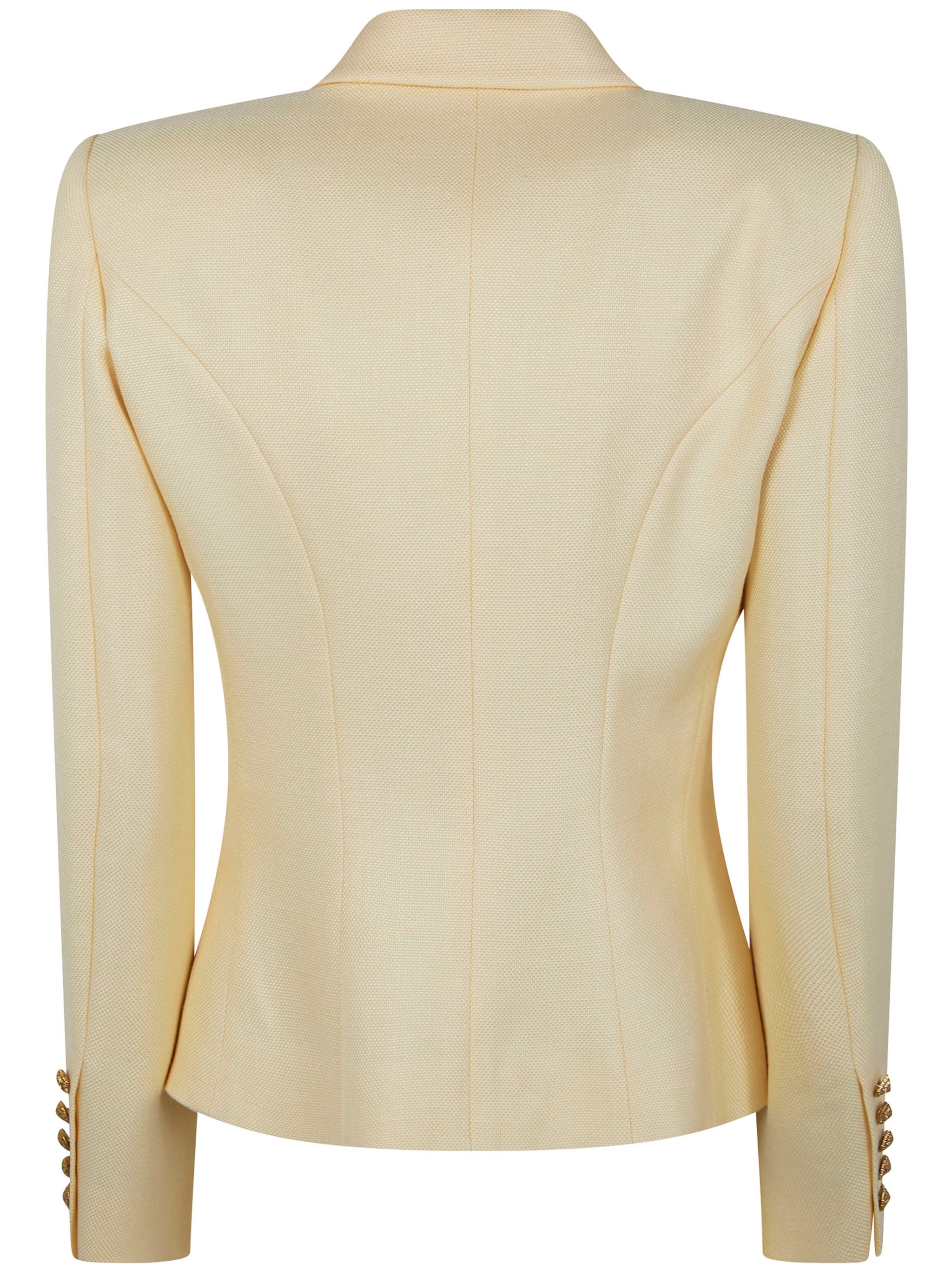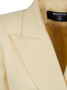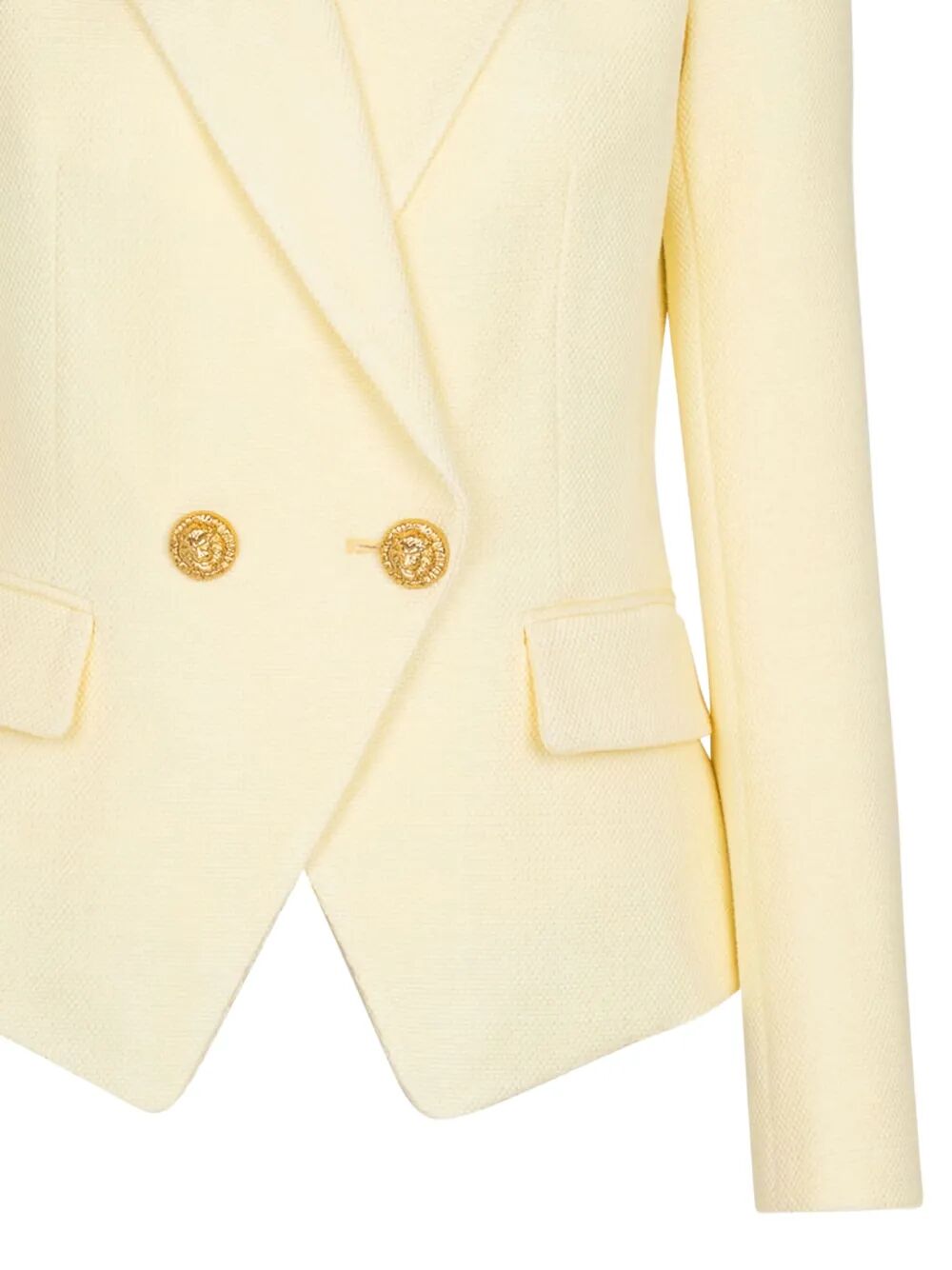 Elevate your professional wardrobe with this stunning Balmain double-breasted blazer in a sophisticated pale yellow hue. Crafted from 100% viscose with a luxurious "natte" weave texture, this tailored jacket features signature gold-tone buttons, structured shoulders, and a flattering fitted silhouette that exudes Parisian elegance.
