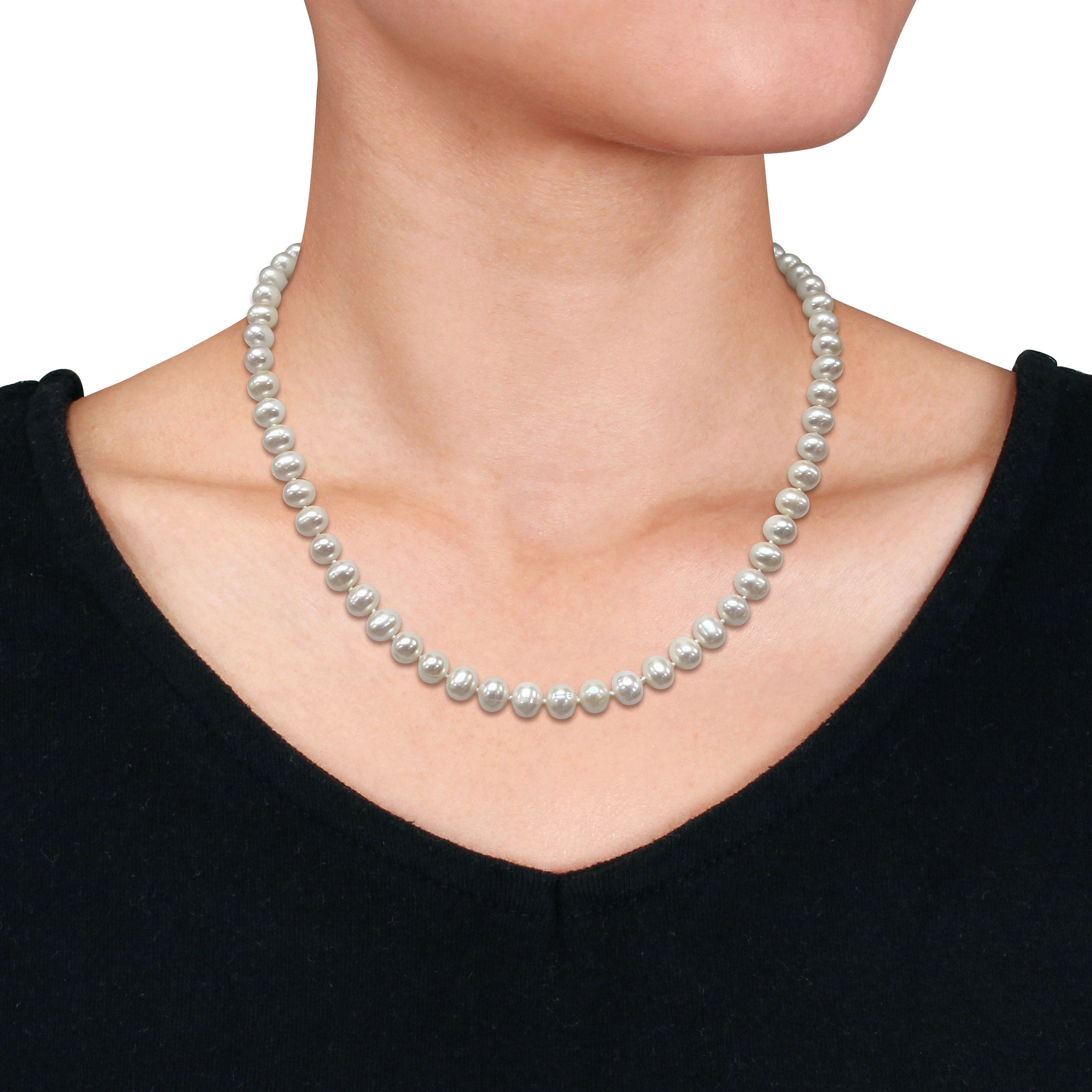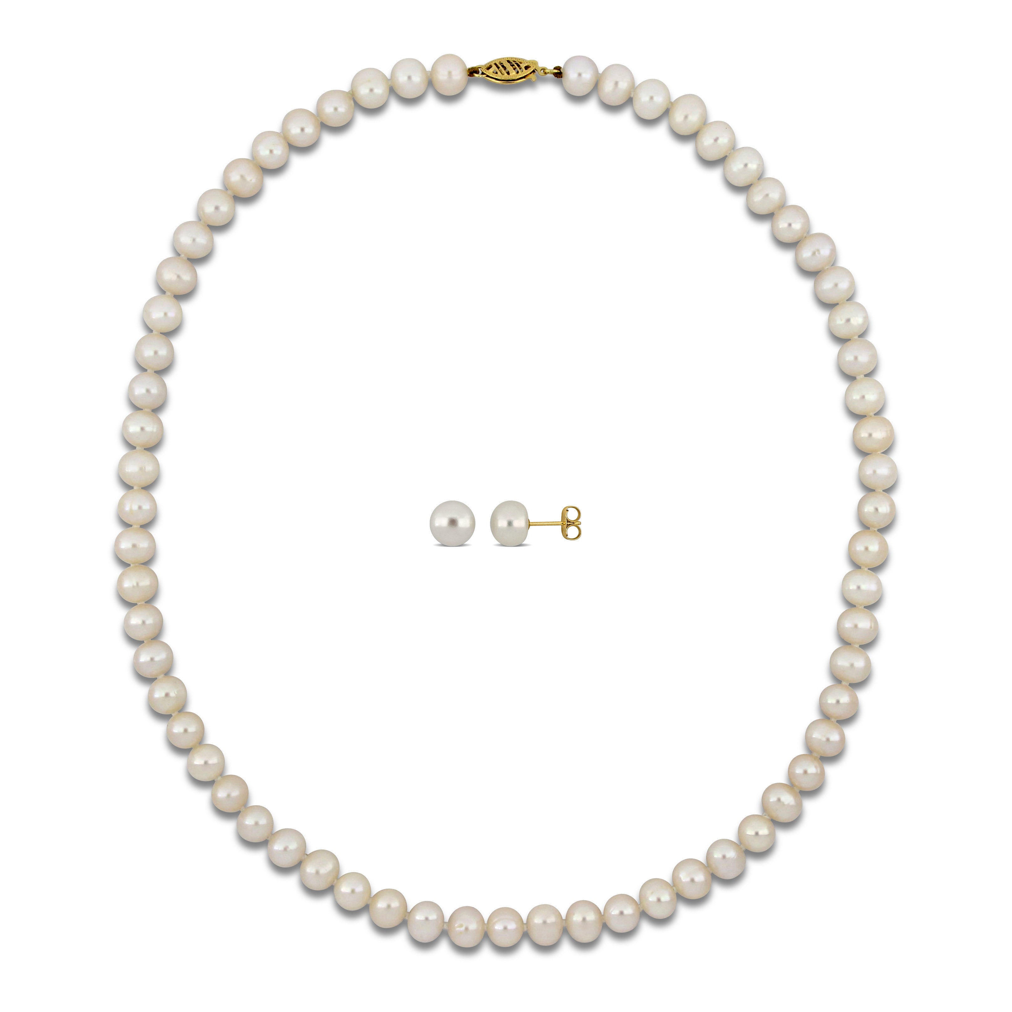 Add a touch of elegance with this cultured freshwater pearl necklace and stud earrings set, featuring 7.5-8mm pearls and crafted in 10K yellow gold. The classic design makes it a perfect accessory for any occasion, offering timeless beauty and sophistication. A lovely addition to your jewelry collection.
