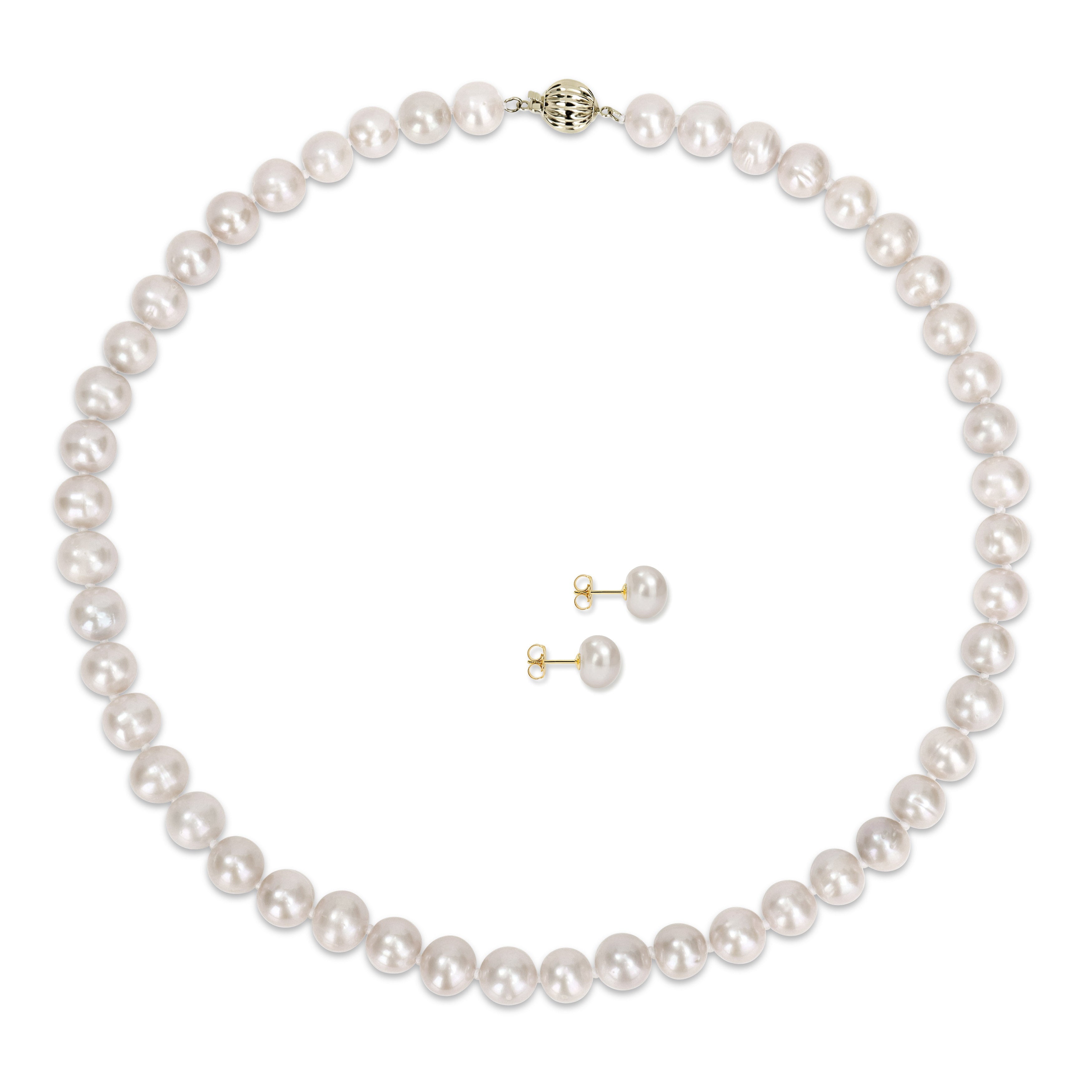This pretty beaded pearl necklace and earrings set is crafted in 14-karat yellow gold. This necklace and earrings set feature off-round and button freshwater cultured pearls that add a stylish finishing touch you'll appreciate. Enhanced with a high polished finish, this necklace measures 18-inches and secured by corrugated ball clasp. A simple and elegant design.