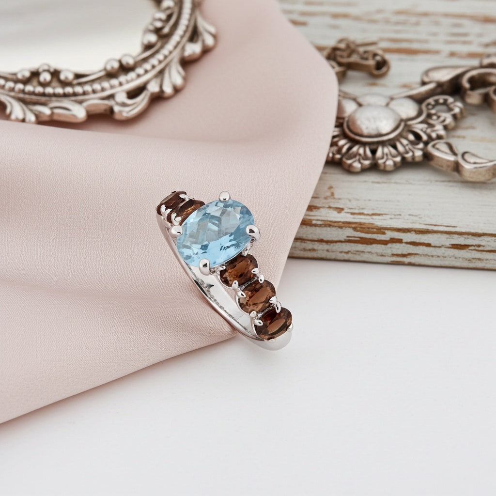 Embrace sophistication and color with this stunning oval ring from Lord & Taylor. Expertly crafted in sterling silver, the ring showcases a striking 9x7mm oval-cut blue topaz at its center, surrounded by three oval-cut smoky quartz gemstones on each side in a timeless 7-stone design. The rich blue topaz, paired with the warm, earthy tones of the smoky quartz, creates a captivating contrast that exudes elegance. Polished to a brilliant finish, this exquisite ring is perfect for adding a touch of refined luxury to any ensemble.
