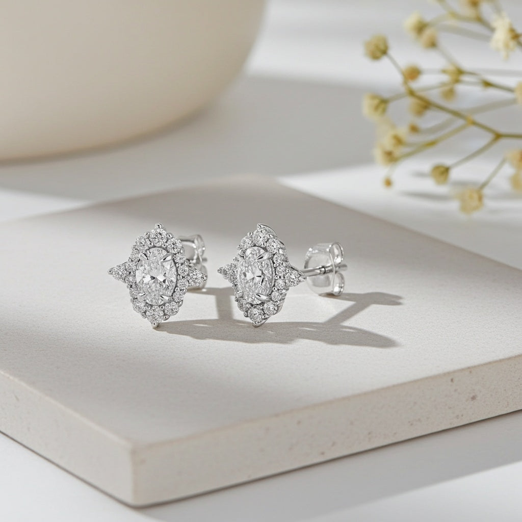 These elegant stud earrings feature lab-grown diamonds, expertly set in 14k white gold setting for a classic and sophisticated look. The diamonds, cultivated in a laboratory setting to ensure ethical and sustainable practices, exhibit exceptional clarity and brilliance comparable to natural diamonds. Each diamond is meticulously cut and polished to enhance its sparkle and beauty, making these earrings a timeless addition to any jewelry collection. These lab-grown diamond stud earrings offer a blend of elegance, ethical sourcing, and enduring quality.