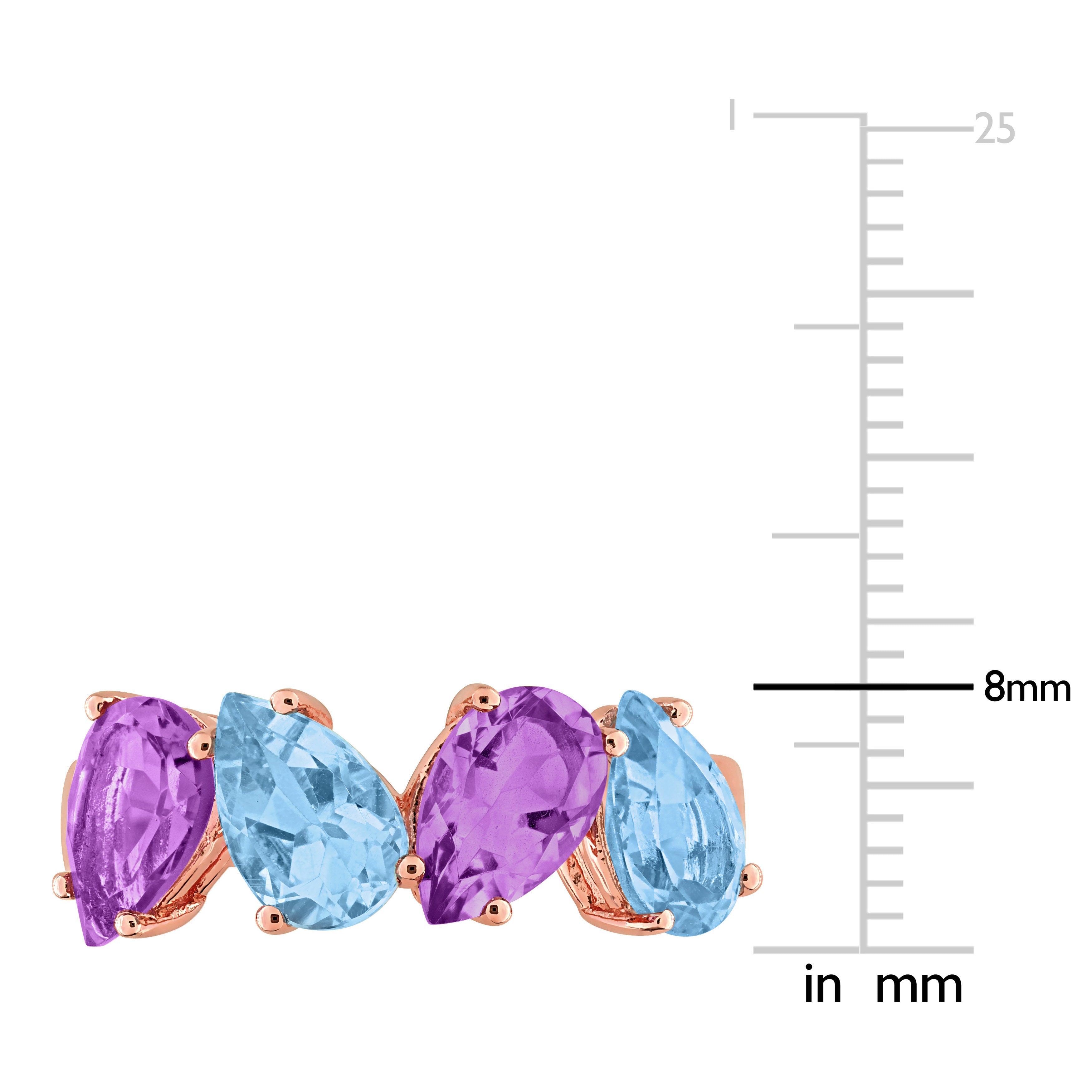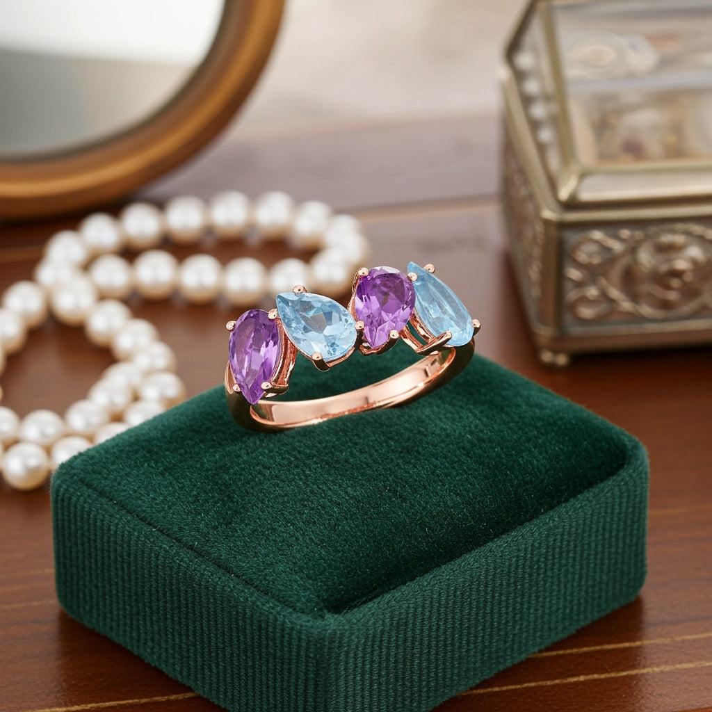 This vibrant ring showcases a combination of pink amethyst and blue topaz gemstones, set in rose-plated sterling silver. The pear-cut pink amethysts are complemented by pear-cut blue topaz gemstones, creating a striking contrast of bold colors. The rose-plated sterling silver adds a warm, luxurious touch to the design, making this ring a unique and stylish statement piece.