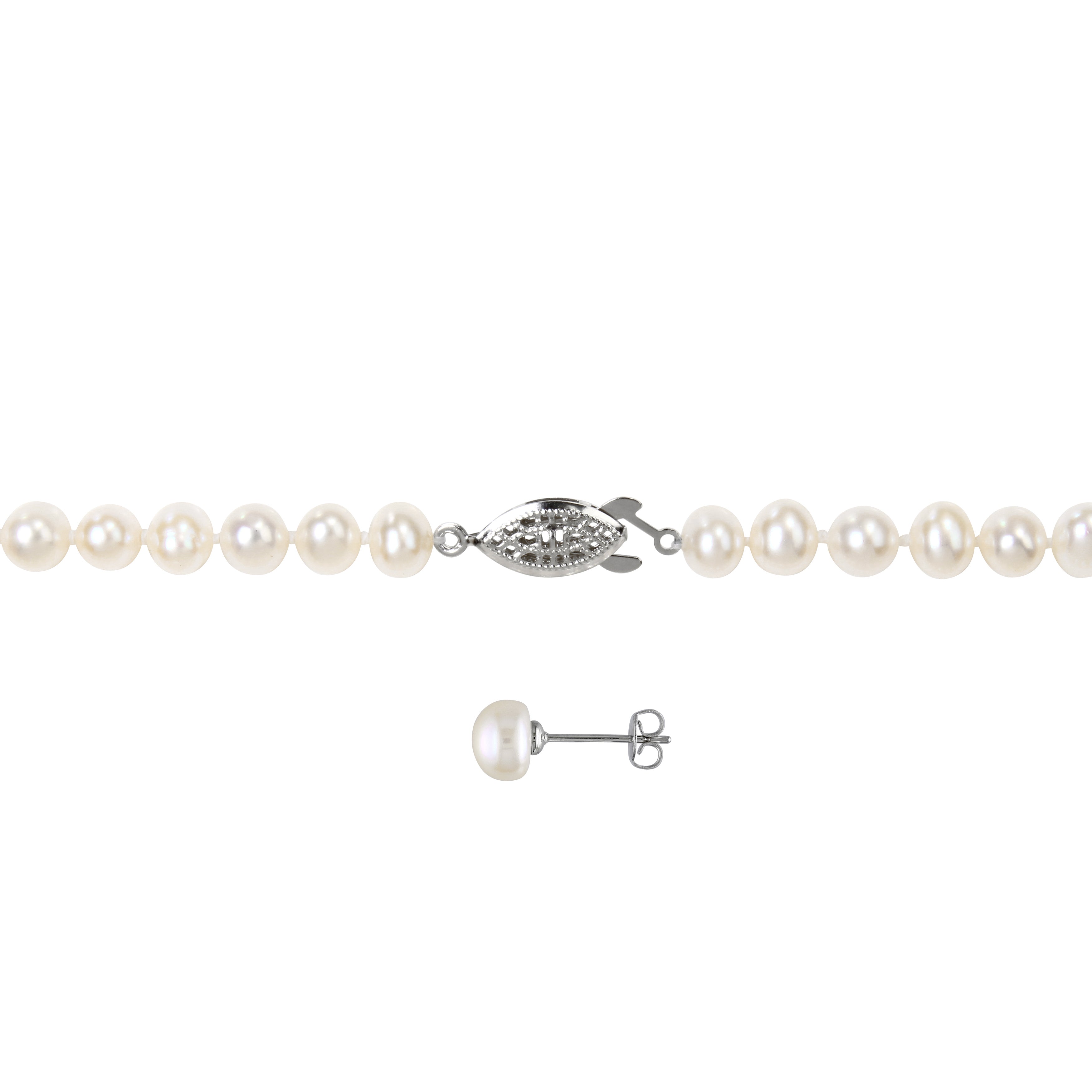 Timeless and elegant, this 3-piece set from Lord & Taylor features lustrous freshwater white pearls set in sophisticated silvertone. The 18-inch necklace gracefully rests at the neckline, complemented by a 7-inch bracelet and matching stud earrings, which are securely fastened with butterfly post backs. Perfect for any occasion, this set brings refined beauty and classic style to your jewelry collection.