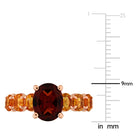 This exquisite ring, crafted in rose-plated sterling silver, features a captivating 9x7mm oval-cut garnet at its center, accented by three oval-cut citrine gemstones on each side in a timeless 7-stone design. The high-polish finish enhances the brilliance of the gemstones, creating a radiant and sophisticated piece. Perfect for adding a touch of color and elegance to any ensemble, this ring is a true statement of refined beauty.