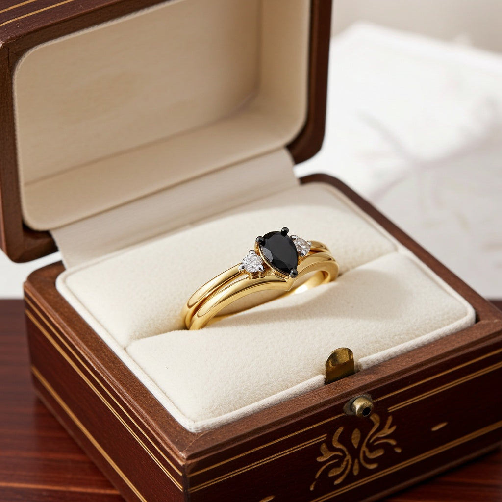 This pear-cut black diamond three-stone wedding ring is crafted in 10-karat yellow gold. This modern engagement ring features a pear-cut, prong-set black diamond and two round-cut diamonds in a unique three-stone teardrop design. This wedding ring is complemented by a stackable contour wedding band. Enhanced with a high polish finish, this bridal ring set is a valuable addition to any jewelry collection. Choose this gorgeous wedding set for the woman you love as you celebrate this special milestone.