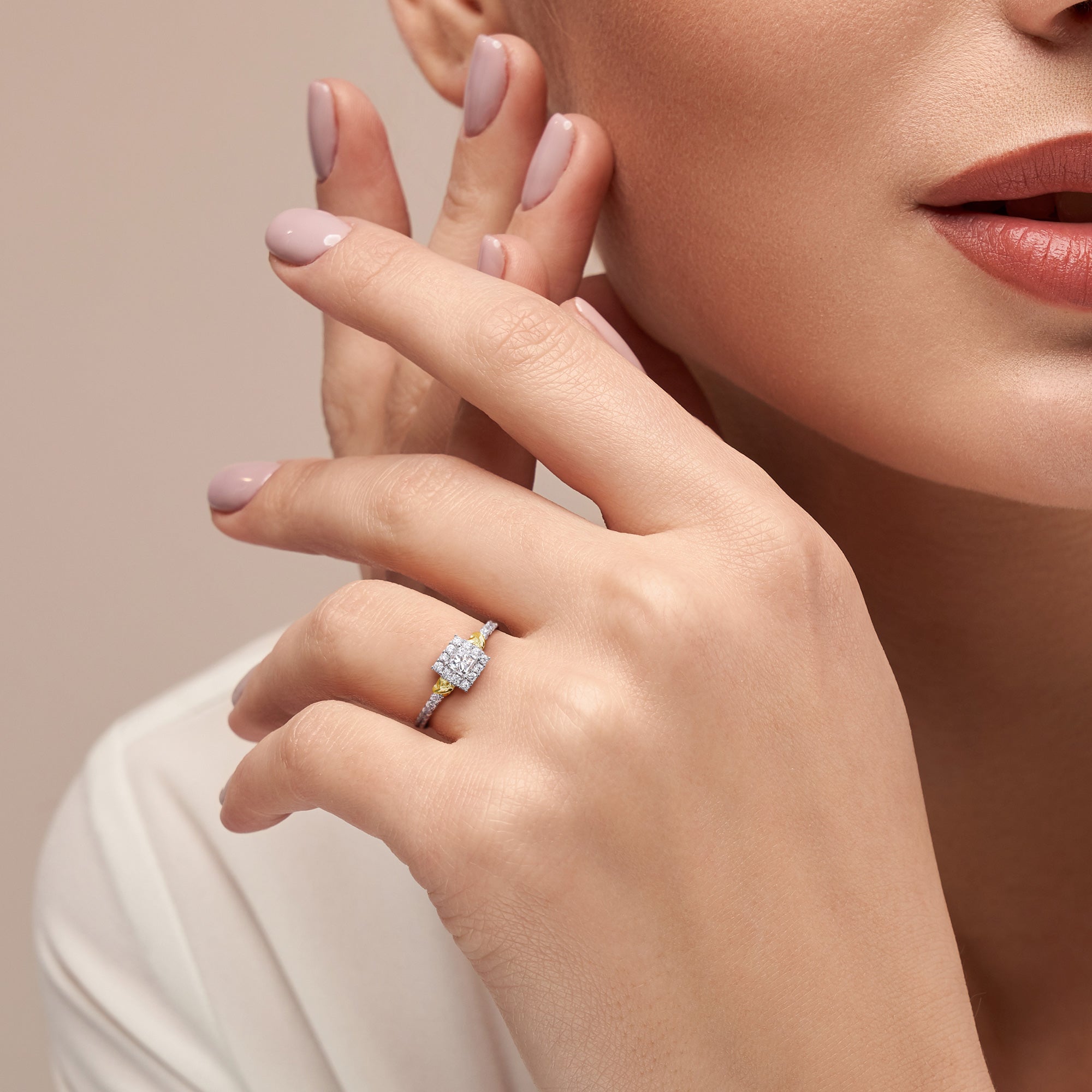This beautiful halo diamond ring is crafted in lustrous 14k white gold and yellow gold. This gorgeous ring features one princess-cut, prong-set diamond encased in a halo design created by 26 round-cut, buttercup-set diamonds and extending halfway into the band. Polished to a brilliant shine, this lovely ring is the perfect surprise for her.