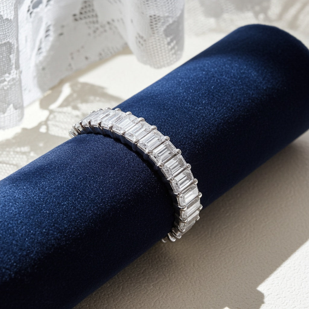 This 6 1/3 carat Emerald-cut Created Moissanite Eternity Ring in Sterling Silver is a magnificent and timeless piece of jewelry that exudes elegance and grace. This stunning ring features a continuous row of emerald-cut created moissanite gemstones, expertly set in a sterling silver band, symbolizing eternal love and commitment. The exquisite brilliance of moissanite complements the classic design, making it a perfect choice for those seeking a blend of sophistication and sustainability in their jewelry.