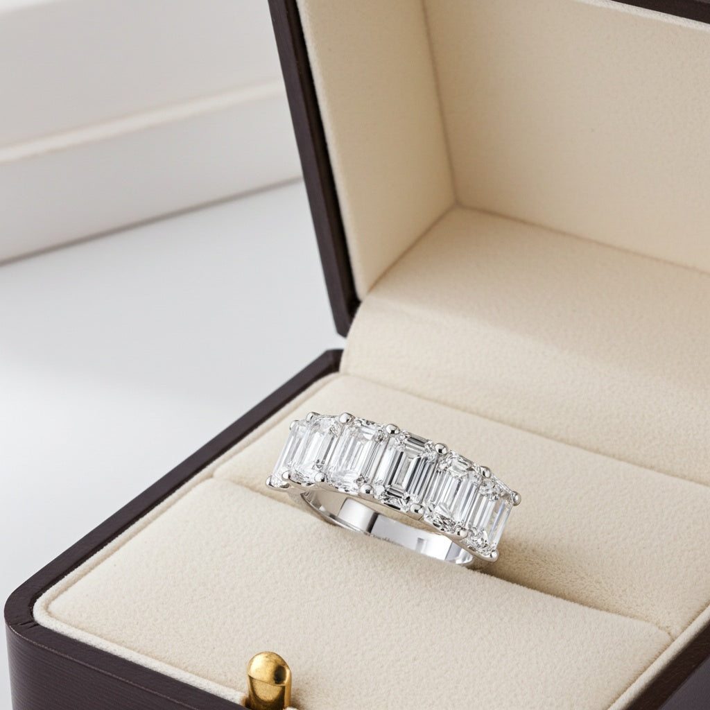Elevate your anniversary celebration with this exquisite Emerald-Cut Lab-Grown Diamond 6-Stone Anniversary Band, crafted in lustrous 14k White Gold. Adorned with six stunning emerald-cut lab-grown diamonds, this band exudes sophistication and elegance. Each diamond is meticulously set to showcase its brilliance and fire, creating a captivating display of sparkle. With its timeless design and exceptional craftsmanship, this anniversary band is a perfect symbol of your enduring love and commitment.