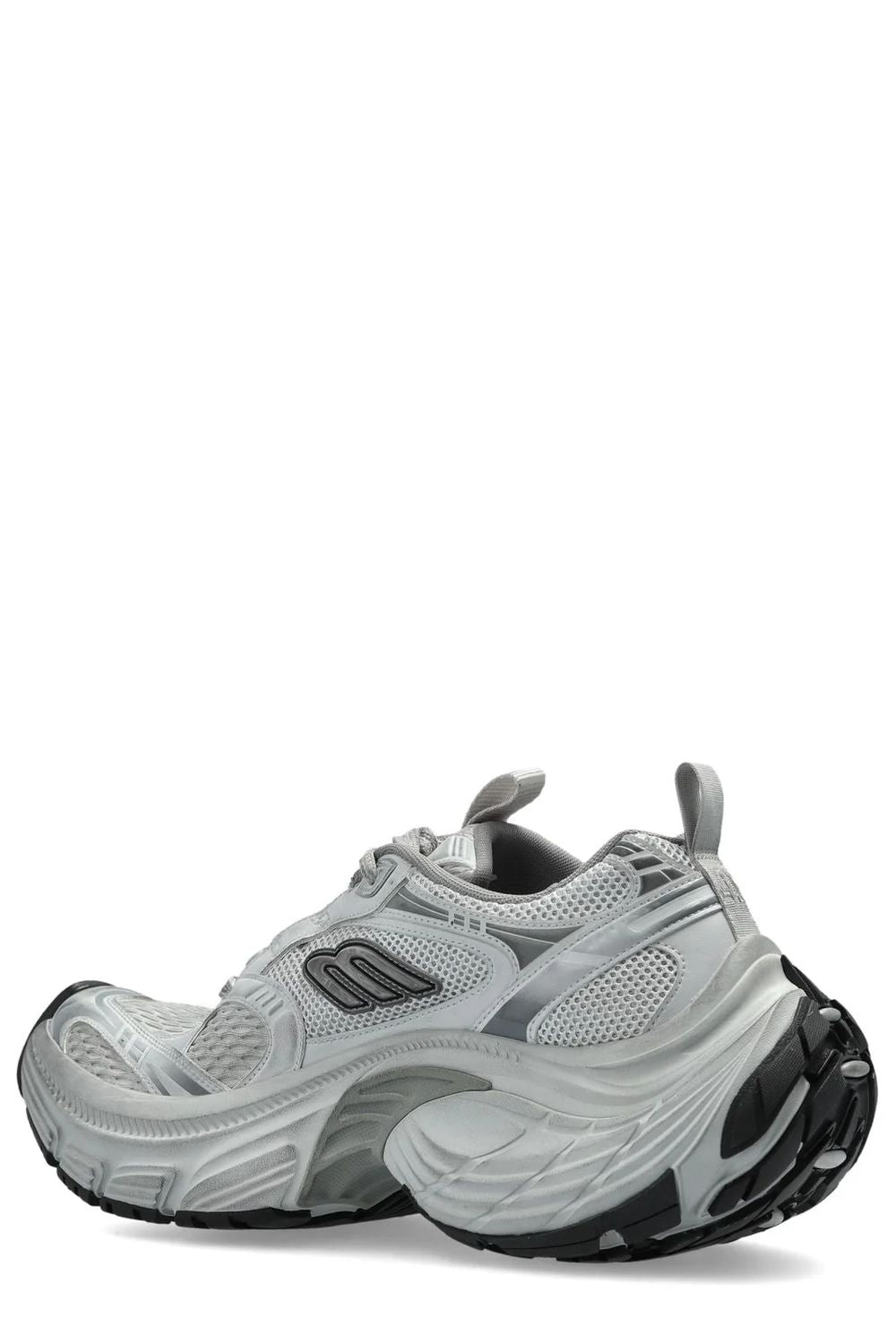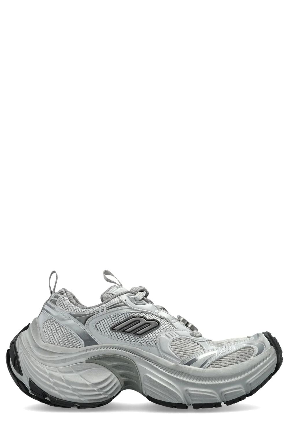 These sculptural low-top sneakers feature an exaggerated, chunky sole with dramatic curves that create an unmistakable silhouette. The metallic silver-grey upper combines mesh and synthetic materials for a futuristic aesthetic, while the oversized proportions embody Balenciaga's signature maximalist approach to footwear design.