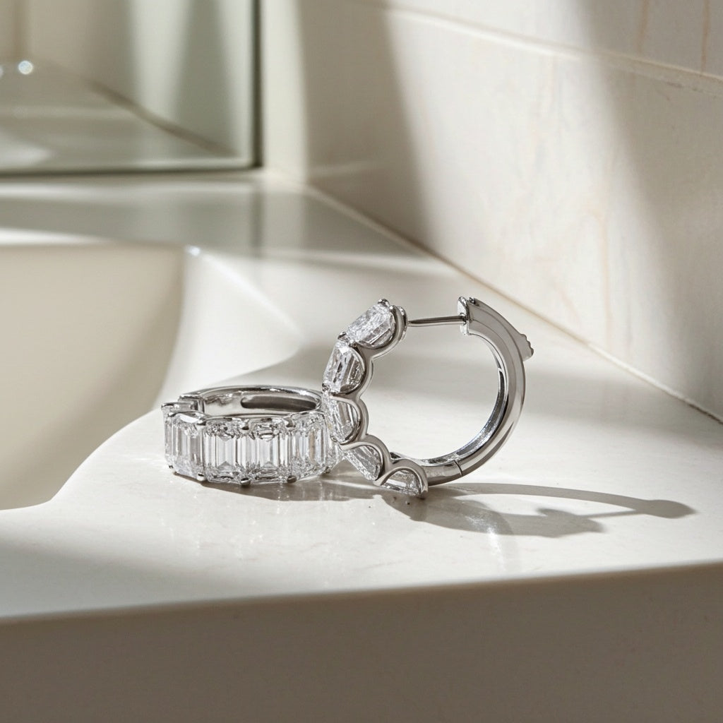 Featuring lab-grown diamonds, these hoop earrings in 14k white gold feature a total of ten emerald-cut 6x4mm lab-grown diamonds beautifully spaced along the hoops. These earrings combine modern technology with classic design, making them a stunning addition to any jewelry collection.