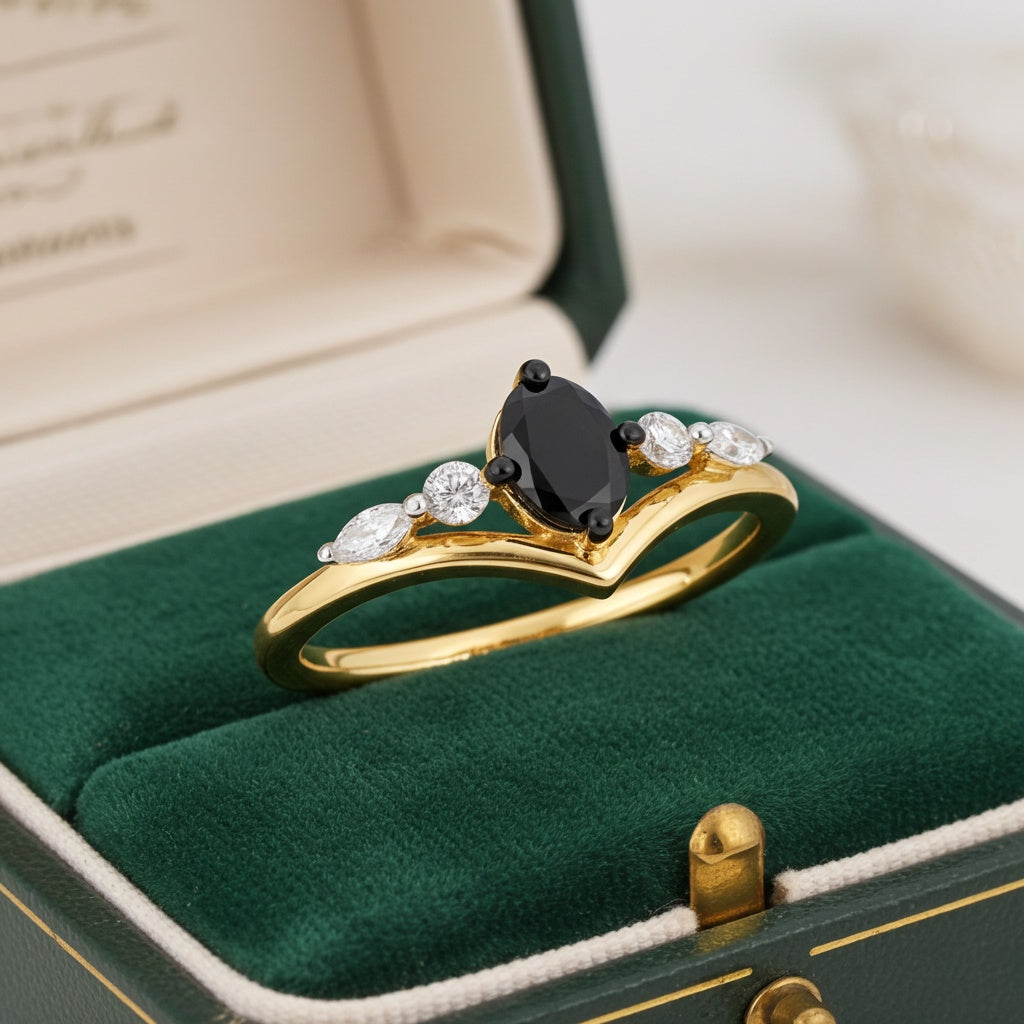 Revel in the captivating contrast of this Black and White Multi-shape Diamond Ring. Crafted in 14k Gold with black rhodium plating, this exquisite piece features an oval-cut black diamond at the center and round and marquise-cut diamonds along the top of the band. Its stackable design allows for versatile layering. A thoughtful gift for her, this ring seamlessly captures the essence of distinctive beauty and contemporary design.