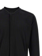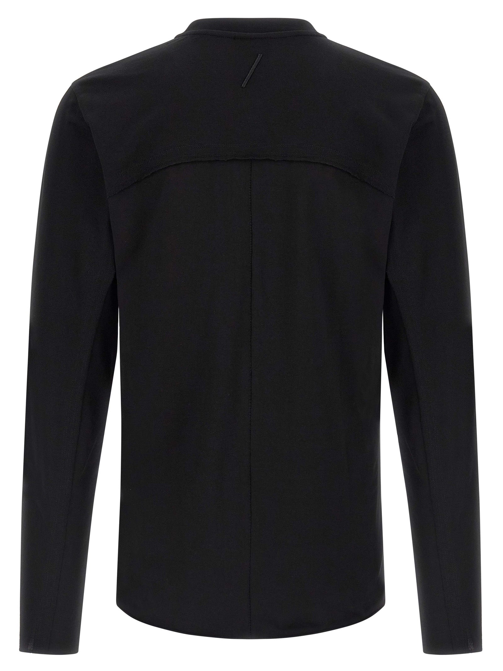 The shirt features a sleek crew neck with a concealed front button closure for a clean, minimalist aesthetic. Long sleeves and a raw cut hem add an edgy, urban touch, while the tonal 'Slash' logo embroidery on the back provides subtle brand recognition.