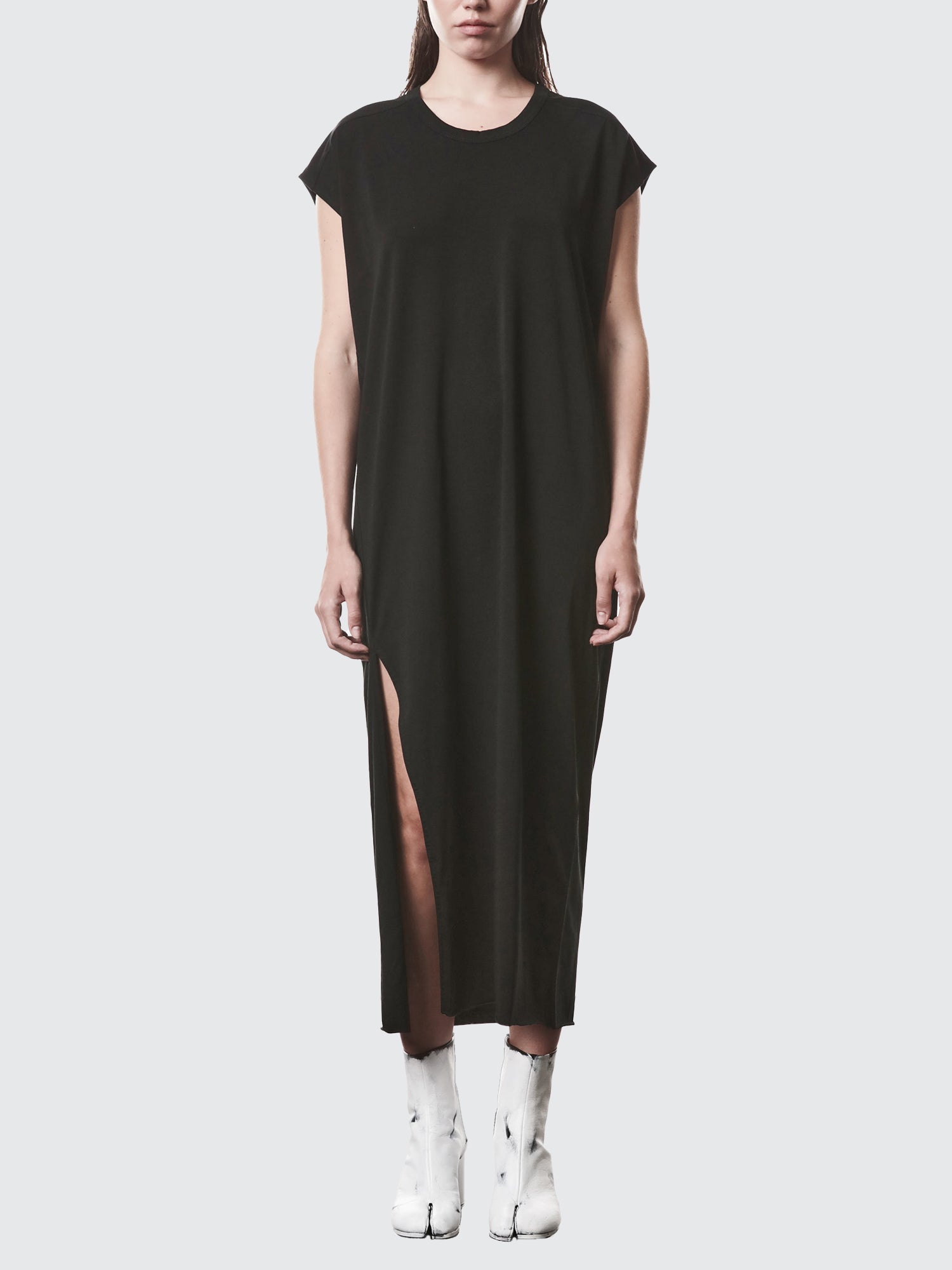 The minimalist silhouette features a classic crew neckline and a striking side slit that adds a touch of modern edge to this wardrobe essential. Perfect for layering or wearing on its own, this versatile piece transitions seamlessly from casual daytime looks to elevated evening ensembles.