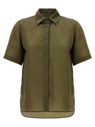 This sophisticated piece features a classic shirt collar, concealed button closure, and relaxed short sleeves that create an effortlessly chic silhouette. The rich olive tone and semi-sheer organza fabric offer a perfect balance of structure and fluidity, making it ideal for both professional settings and casual weekend styling.
