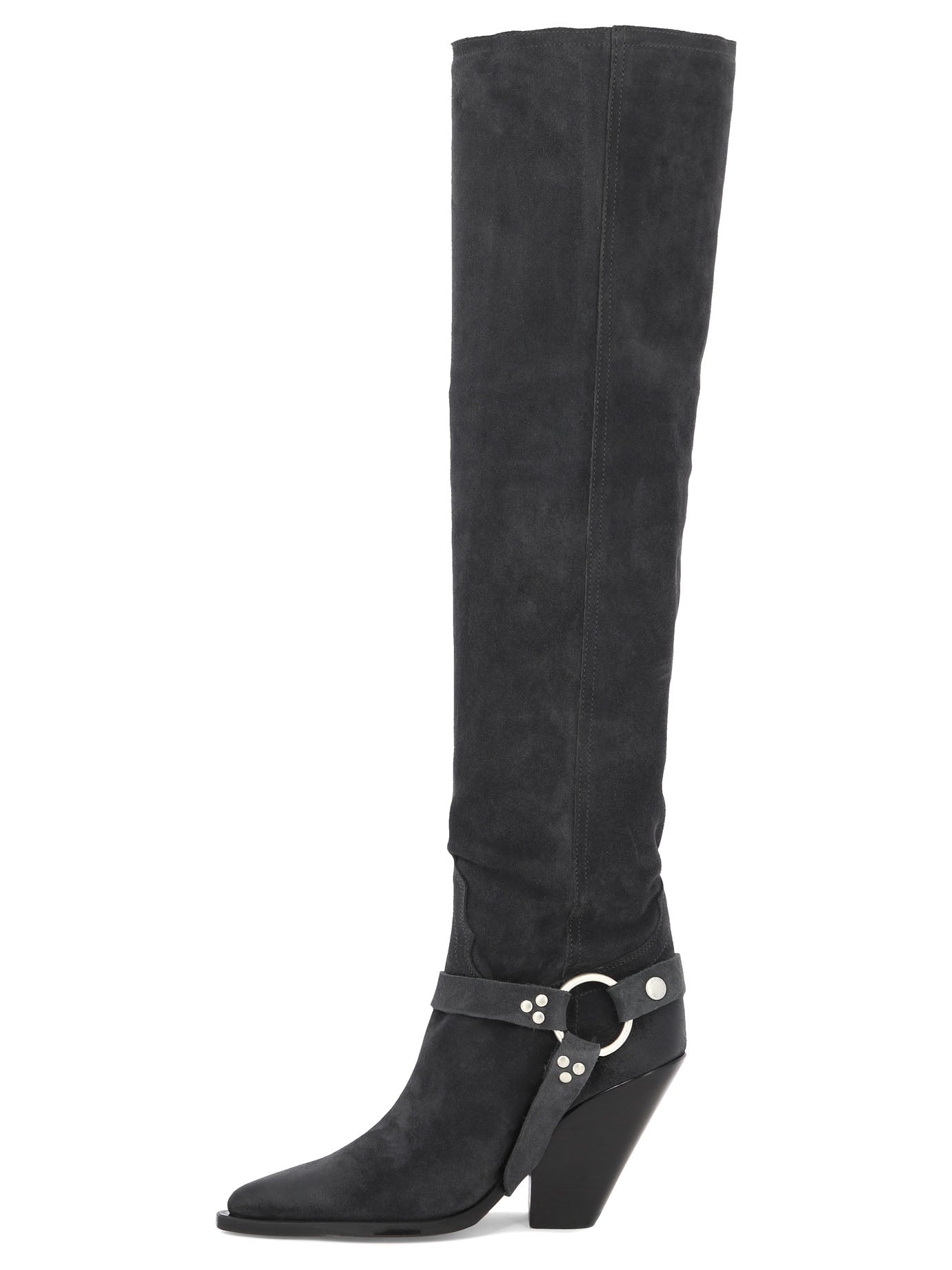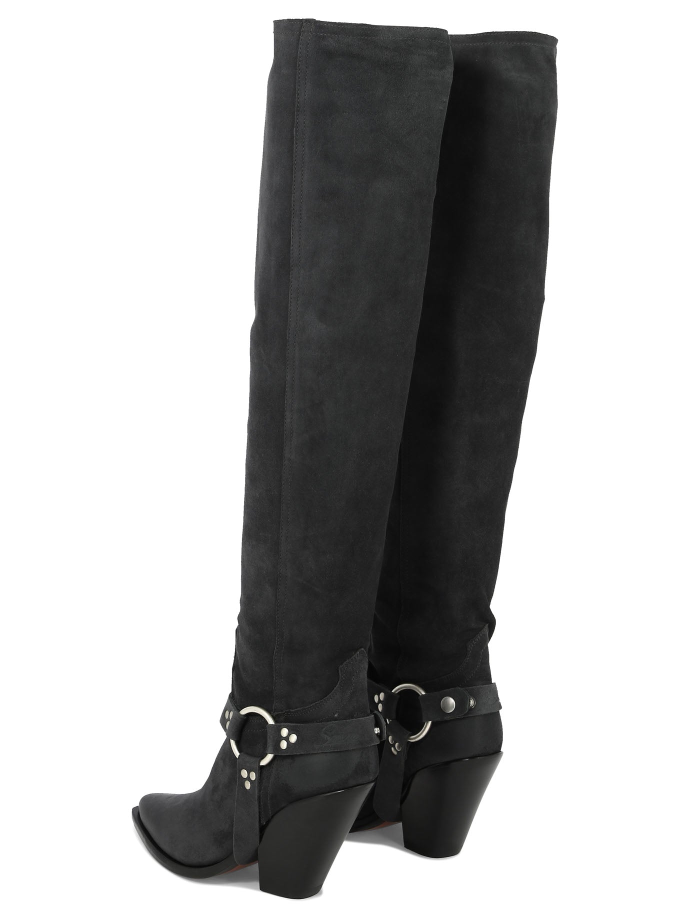 Elevate your style with the "Acapulco Belt" boots from Sonora. These striking over-the-knee boots feature a sleek black silhouette with a distinctive harness belt detail at the ankle, adding an edgy, Western-inspired touch to any ensemble. The pointed toe and chunky heel create a sophisticated yet bold look that's perfect for making a statement. Style them with skinny jeans and a leather jacket for a night out, or pair them with a mini dress for an on-trend, fashion-forward outfit. These boots are the ultimate combination of style and attitude, designed for the modern woman who isn't afraid to stand out.