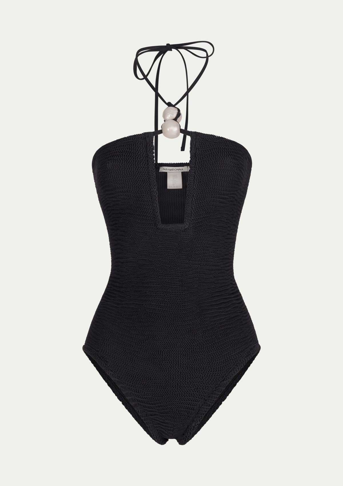 Swimsuit set ADRIANA by PARAMIDONNA. The universal size of the model fits sizes XS to 2XL. The model has ties that connect the chest and ties around the neck with decorative two pieces of round accessories in pearl color. The front of the model has a built-in banel in a U-shape and beautifully highlights the neckline, while the back is mid-cut. The ADRIANA swimsuit has a shaping effect and provides support and comfort to the chest, while the fabric adds a unique elegance and style. Innovative and fashionable this model guarantees you style.