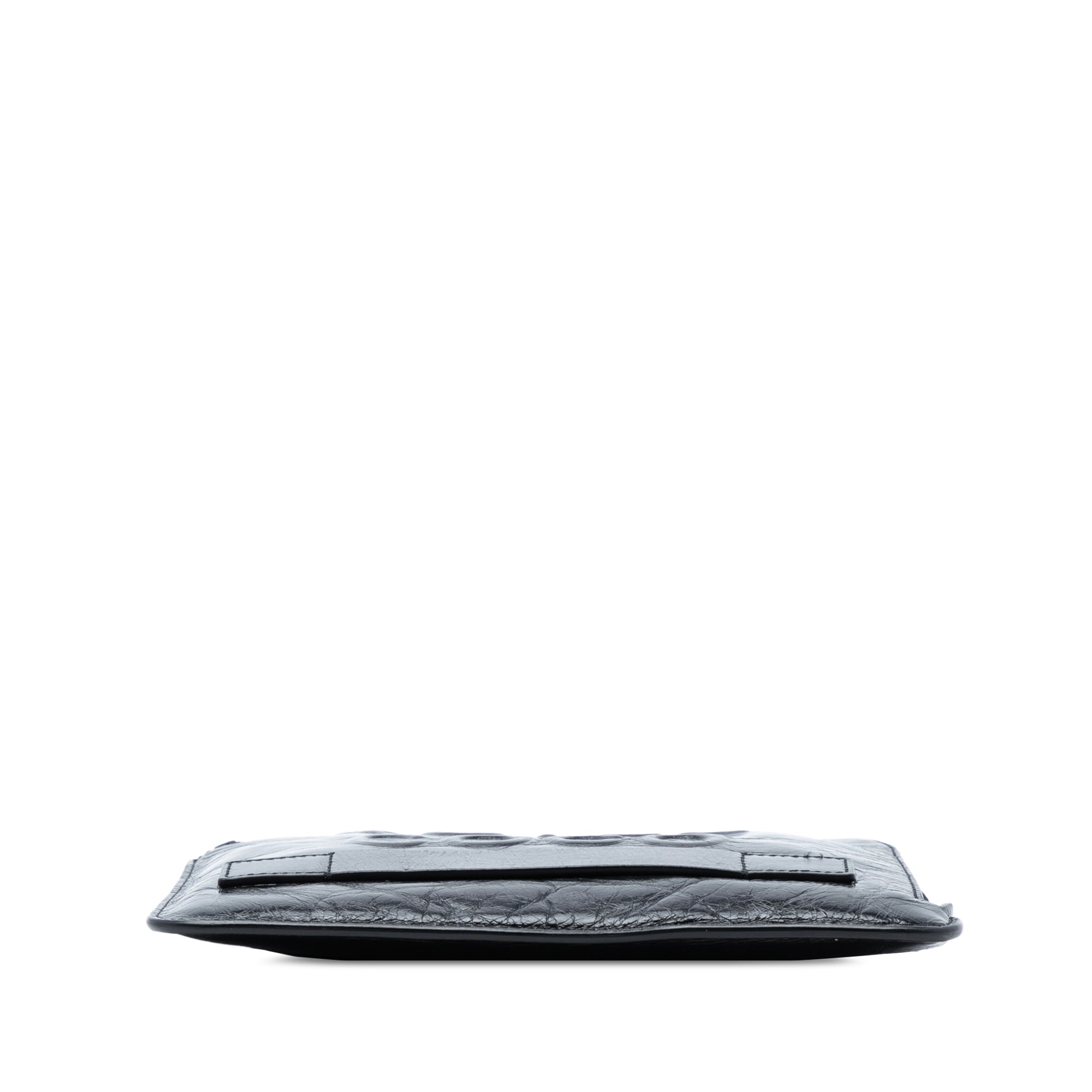 This clutch bag features a lambskin leather body, a top zip closure, an exterior back slip pocket, and interior zip and slip pockets.
