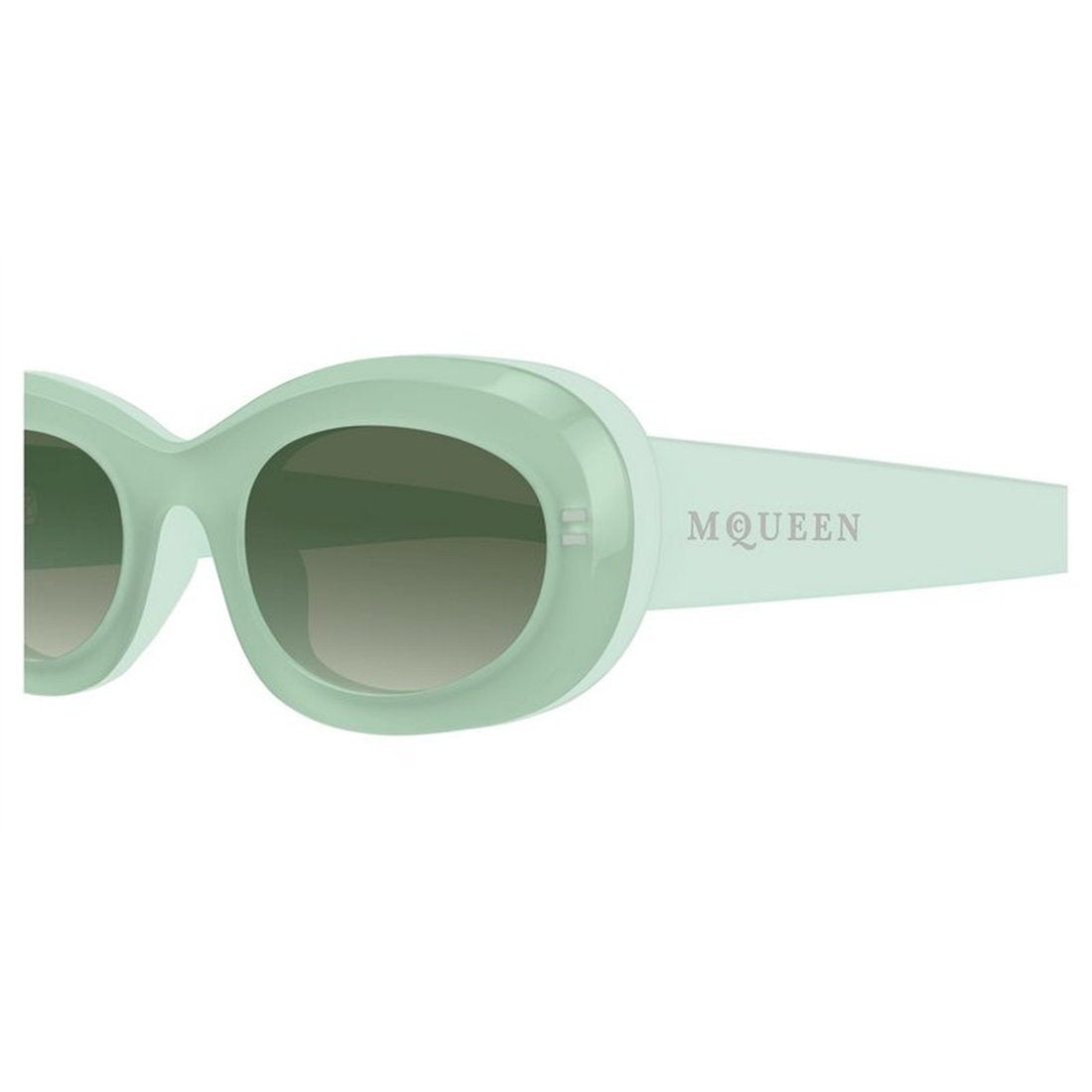 Make a statement with these Alexander McQueen AM0527S 004 sunglasses, featuring a chic mint green frame paired with gradient green lenses. The retro-inspired oval silhouette offers a fresh take on 90s glamour, perfect for the fashion-forward individual.