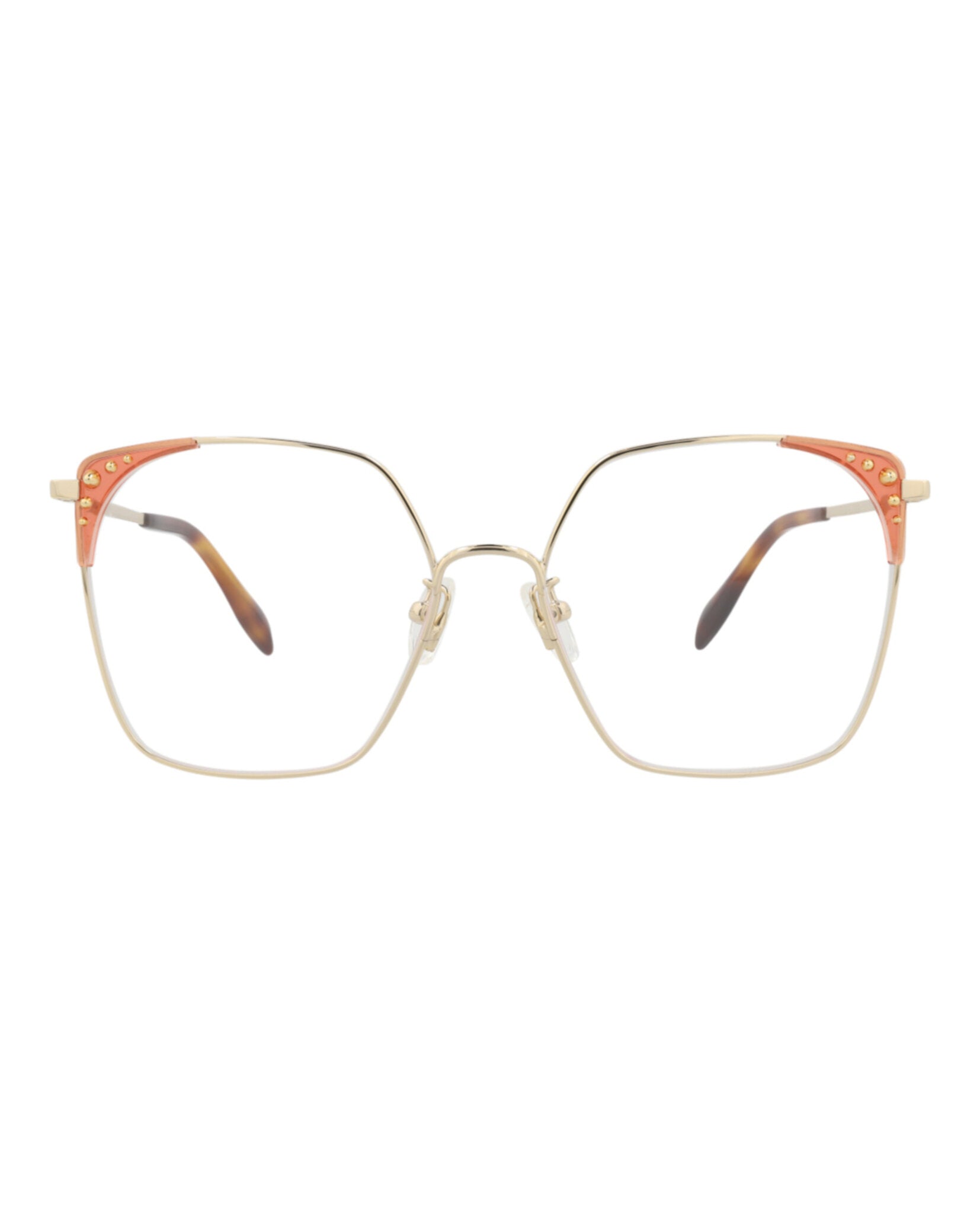 Alexander McQueen brings sophisticated elegance to everyday eyewear with these stunning square-frame optical frames. Crafted in Italy from premium metal with distinctive studded accents and coral-toned temple tips, these frames seamlessly blend luxury craftsmanship with contemporary design.