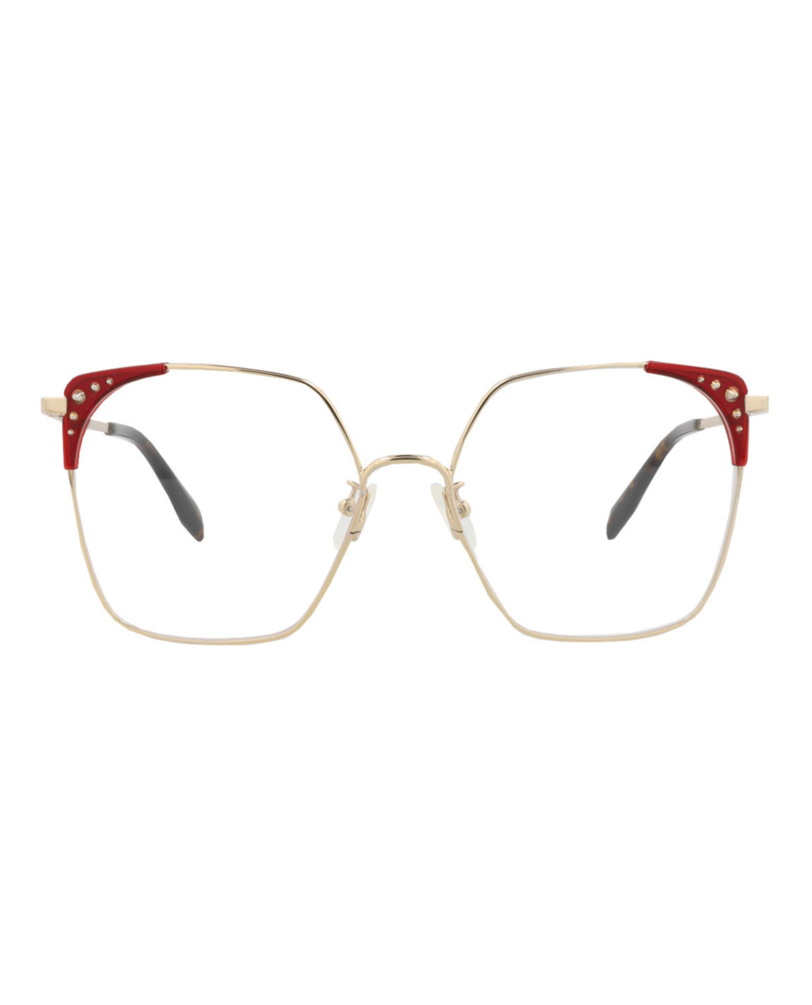 Elevate your everyday style with these sophisticated Alexander McQueen Square-Frame Metal Optical Frames. Crafted in Italy with meticulous attention to detail, these frames feature a sleek metal construction with distinctive studded accents that showcase the brand's signature edgy elegance.