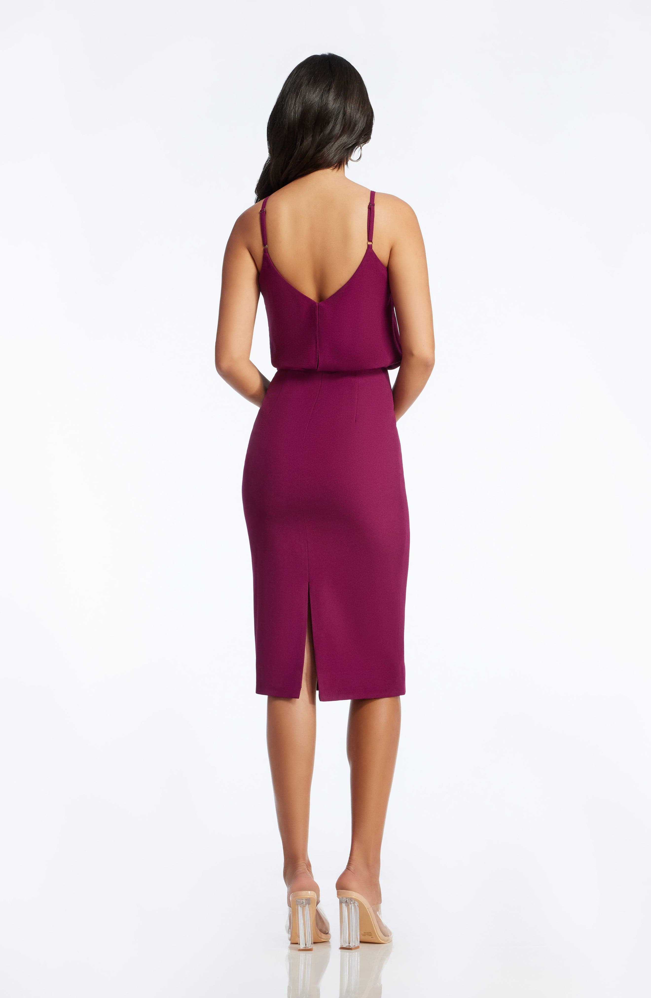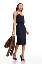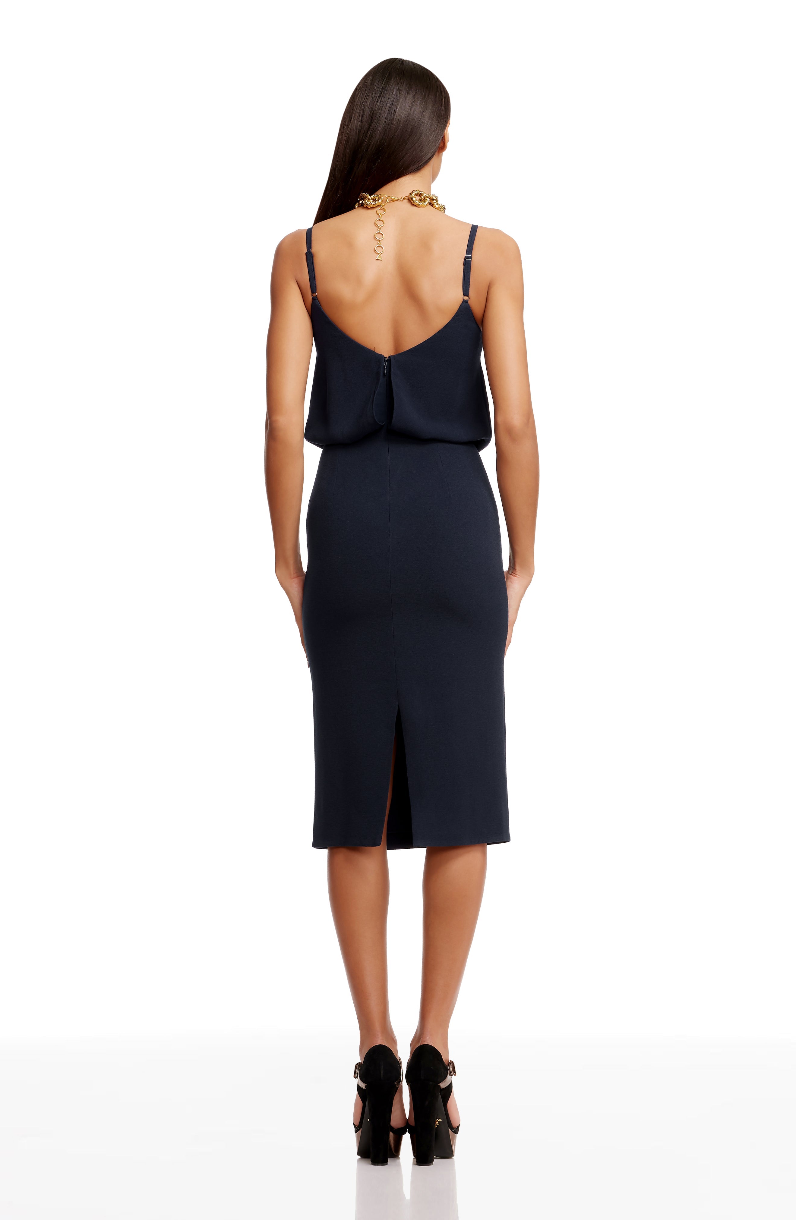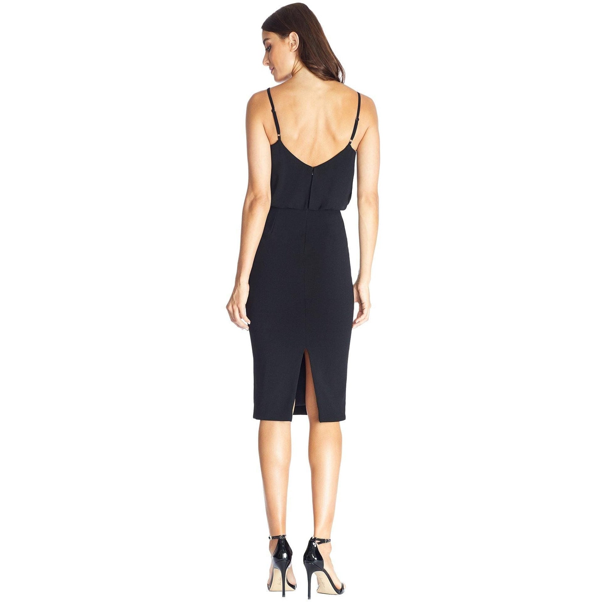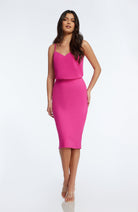 Look chic in this body-con dress. Alondra features a low v-back and soft v-neck with a blouson bubble-hem bodice, creating a unique silhouette. This dress also has a fitted knee-length pencil skirt, slimming your figure. Alondra is sleeveless and has adjustable thin straps and a back slit.
