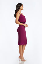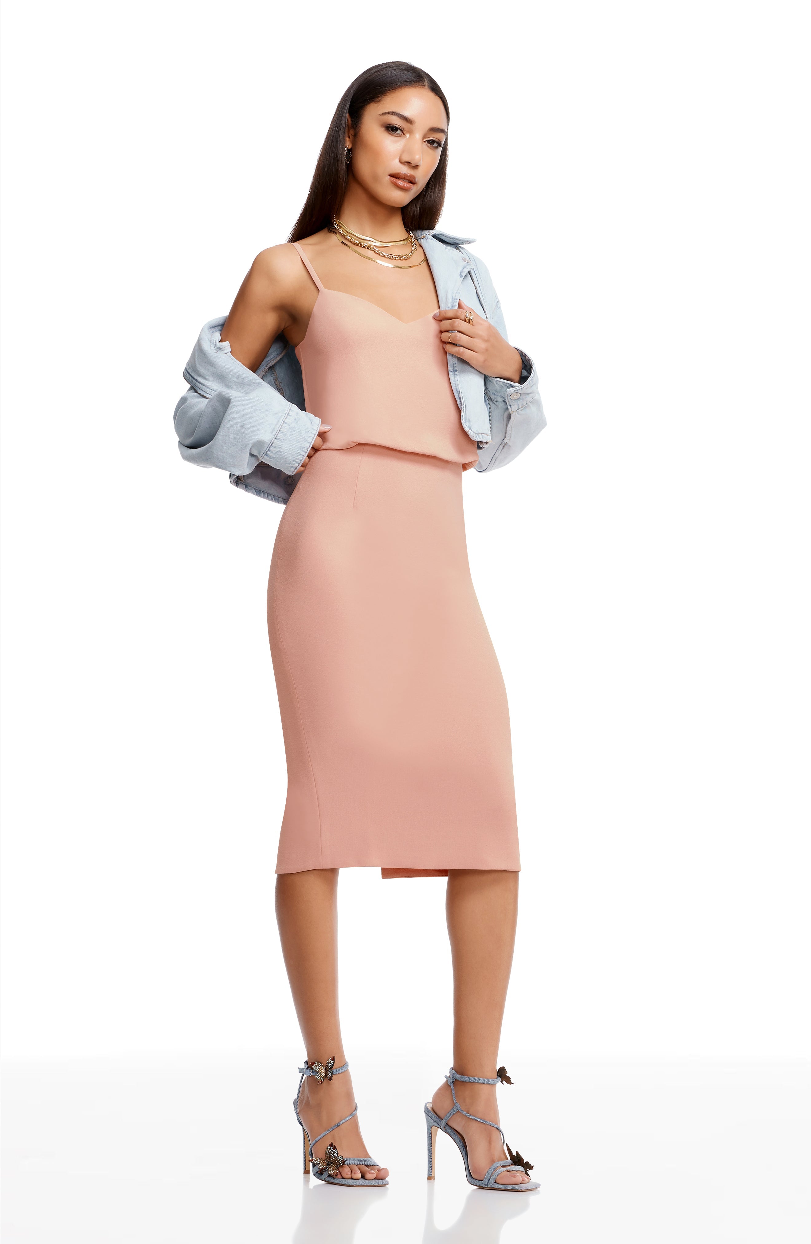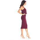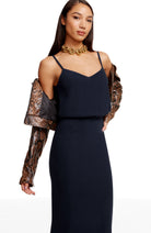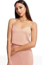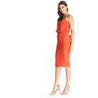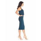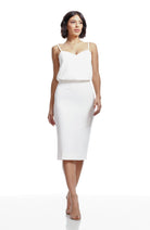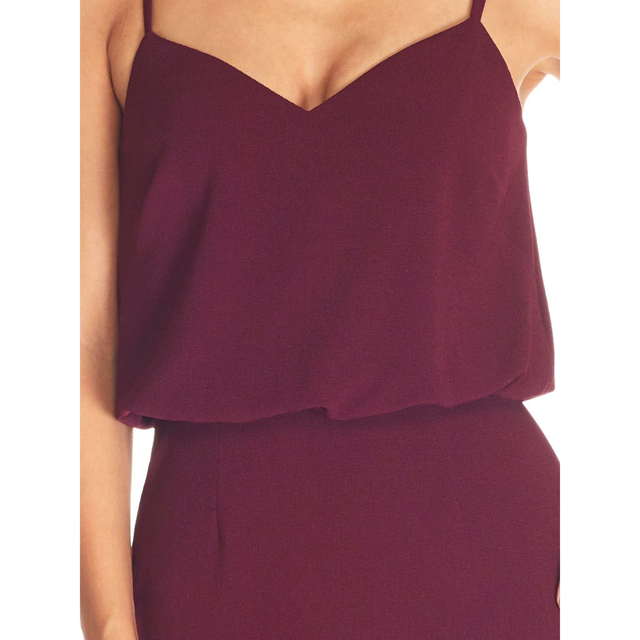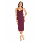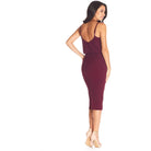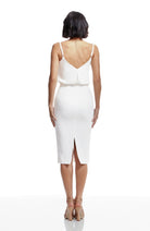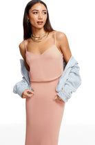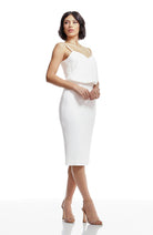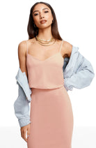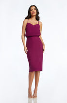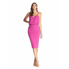 Look chic in this body-con dress. Alondra features a low v-back and soft v-neck with a blouson bubble-hem bodice, creating a unique silhouette. This dress also has a fitted knee-length pencil skirt, slimming your figure. Alondra is sleeveless and has adjustable thin straps and a back slit.