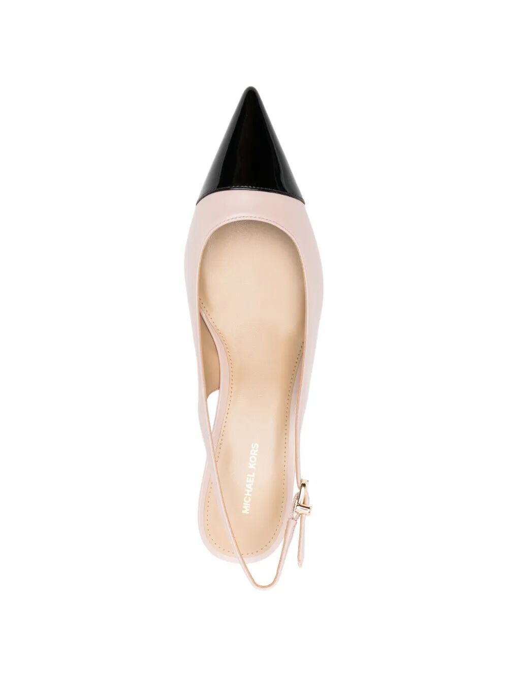 Elevate your everyday style with the "Amara" Toe Cap Sling Pump from MICHAEL Michael Kors. This sophisticated pump features a chic two-tone design with a sleek black patent leather toe cap contrasting beautifully against a soft nude leather upper, crafted from 100% premium sheep leather for luxurious comfort.