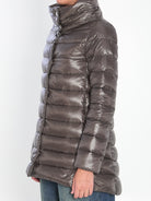 QUILTED ANTHRACITE GRAY NYLON DOWN JACKET. FEATURES A CRATER COLLAR, FRONT SNAP BUTTON CLOSURE, AND TWO SIDE ZIP POCKETS. A-SHAPE SILHOUETTE. REGULAR FIT.
