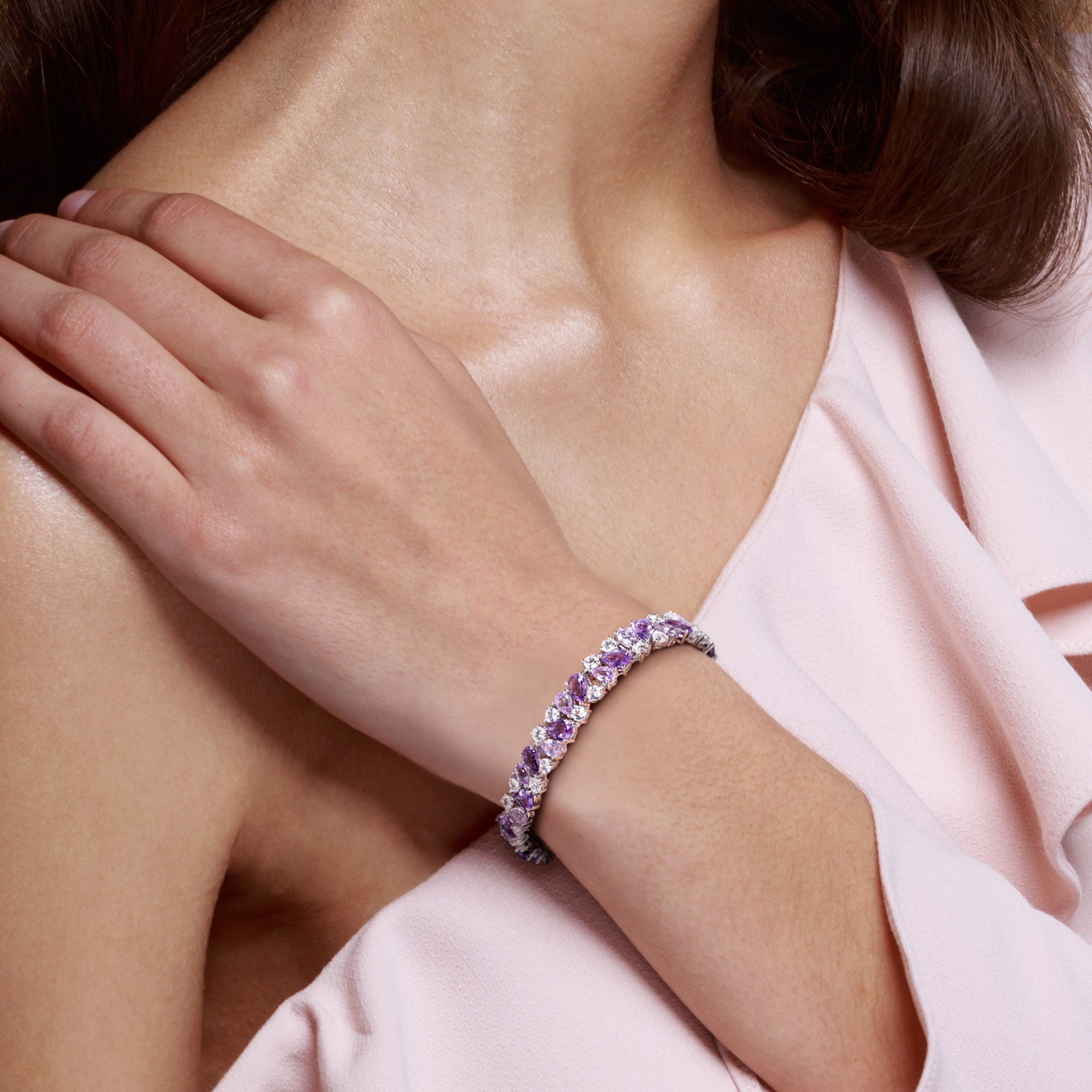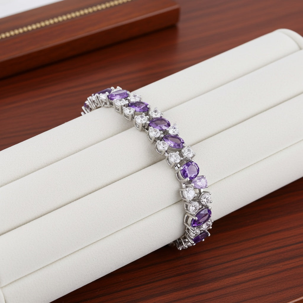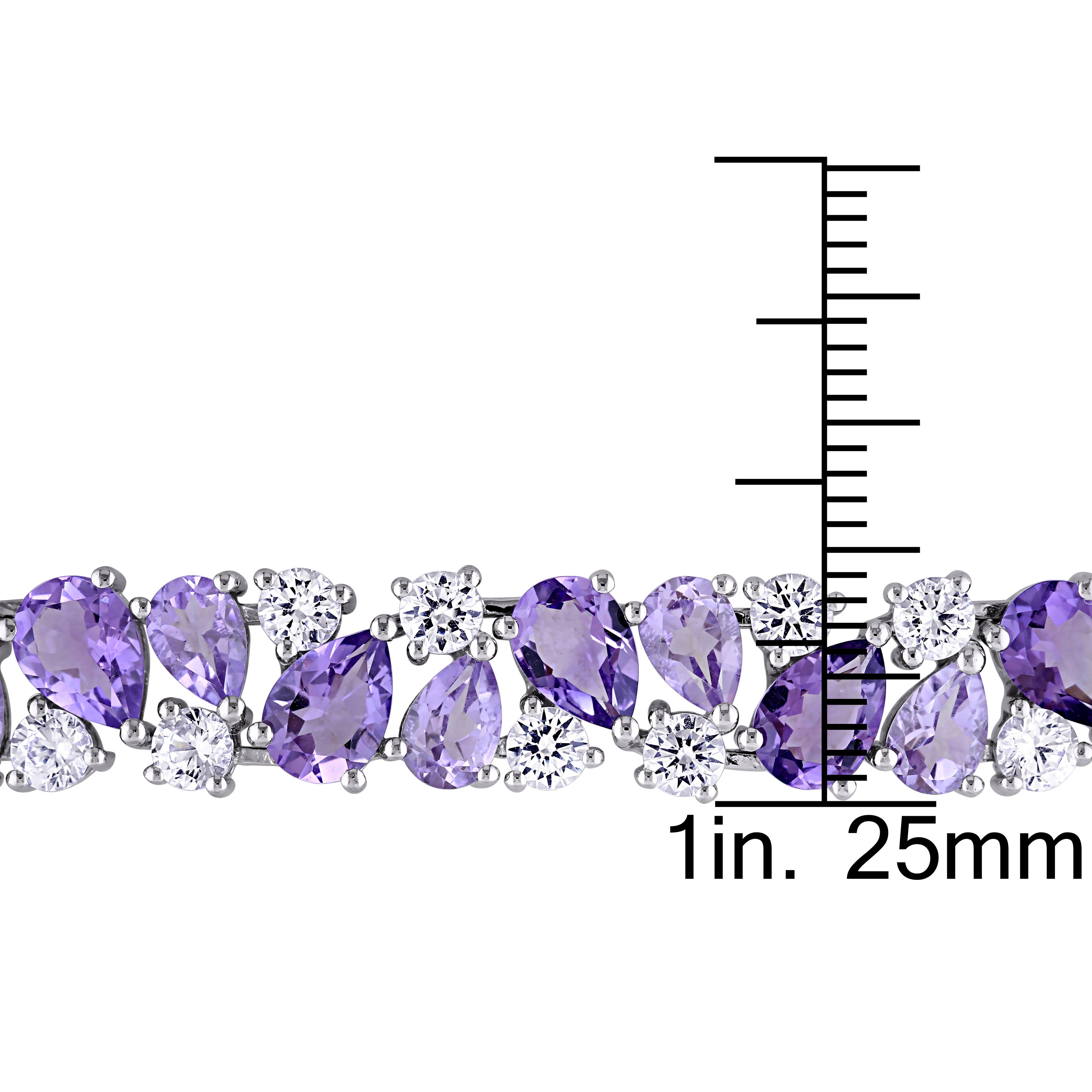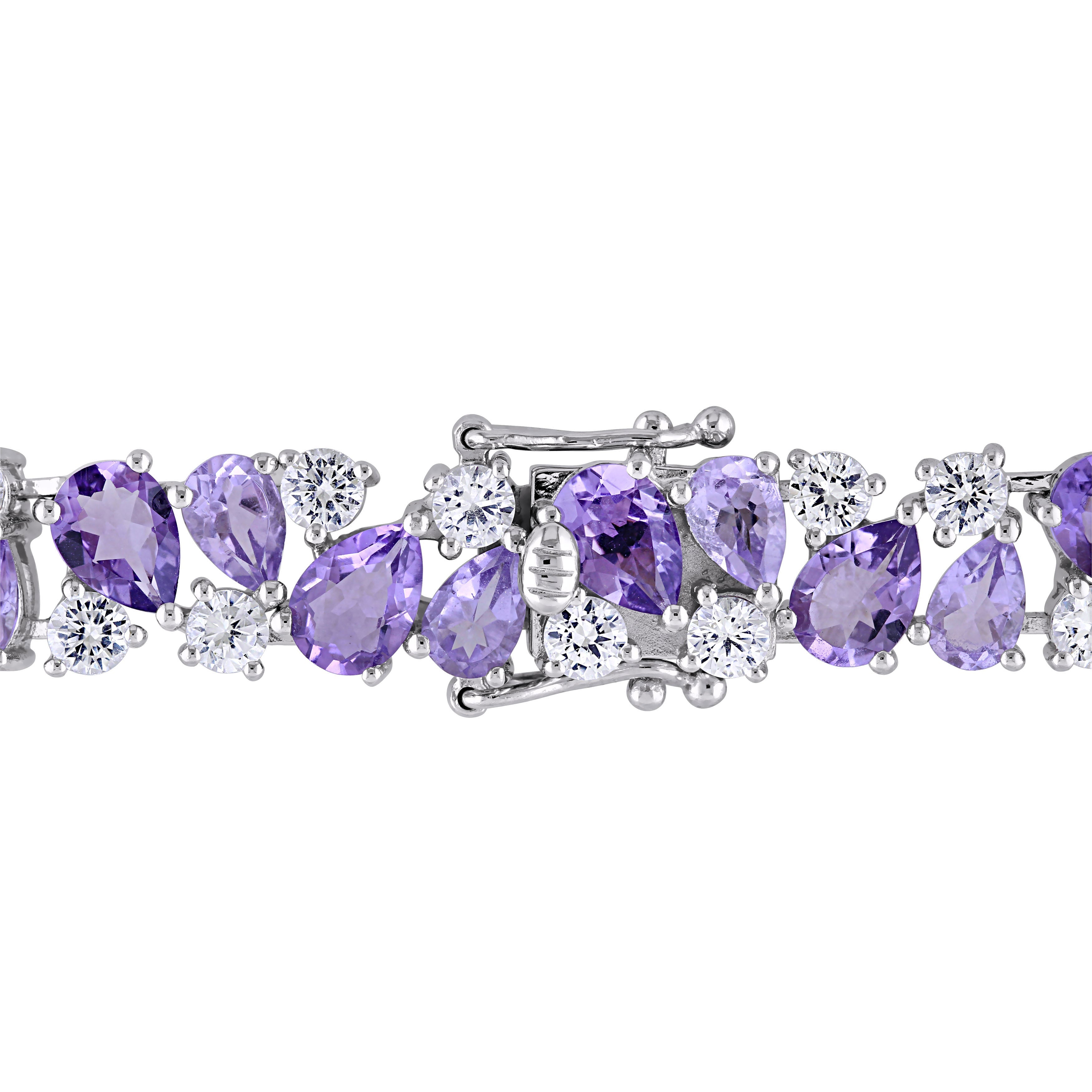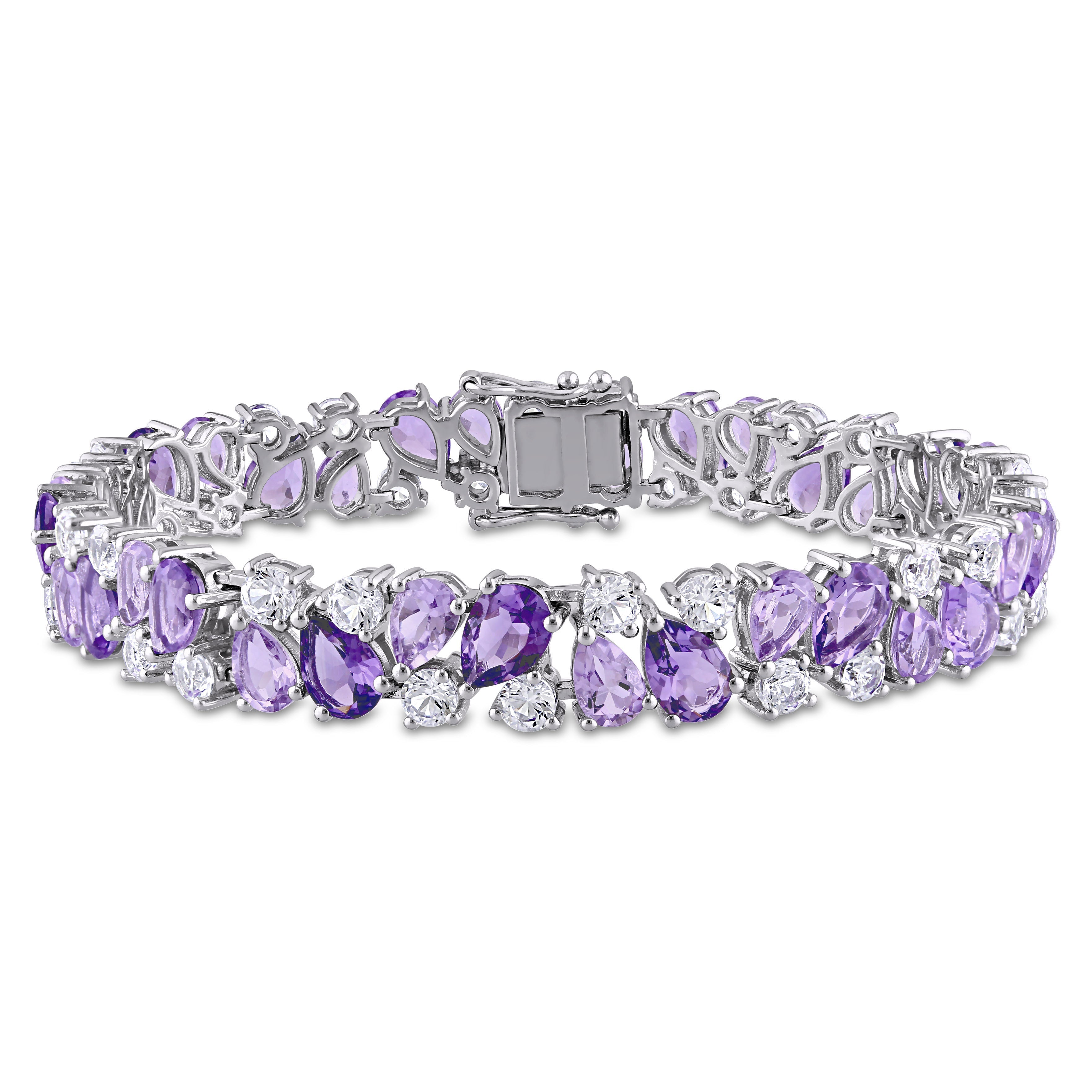 Add a touch of vintage-inspired elegance to your collection with this exquisite bracelet, crafted in sterling silver. Featuring a stunning cluster design, this bracelet showcases pear-cut Rose de France amethyst and round lab-created white sapphire gemstones, beautifully arranged to create a striking contrast. With a total gemstone weight of 27 1/6 carats, this bracelet makes a bold statement while exuding timeless sophistication. Secured with a box clasp, it offers both style and comfort, making it the perfect addition to any occasion.