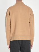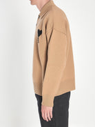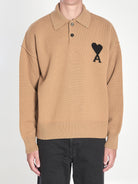 FELTED CAMEL-COLORED MERINO WOOL POLO. FEATURES A POLO COLLAR WITH TWO BUTTONS, LONG SLEEVES, BLACK INTARSIA-KNIT AMI DE COEUR ON THE CHEST, EXPOSED SEAMS, AND RIBBED HEM AND CUFFS. REGULAR FIT.