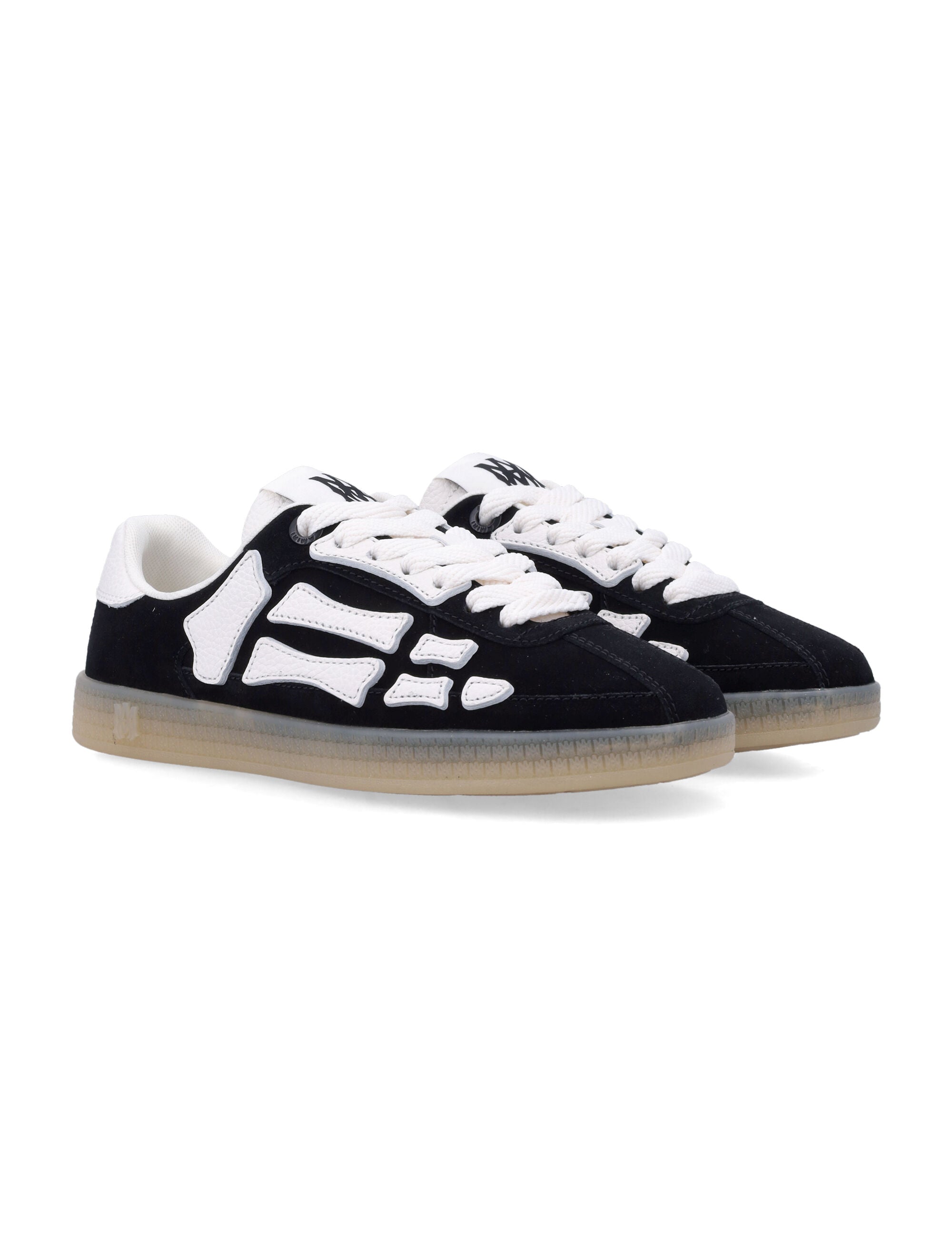 AMIRI REFINES THE WOMEN'S PACIFIC BONES SNEAKERS WITH A SOFT SUEDE UPPER ENRICHED BY THE HOUSE'S SIGNATURE LEATHER BONE APPLIQUÉS, SHAPING A BOLD AND INSTANTLY RECOGNIZABLE AESTHETIC. THE FEMININE ROUND-TOE PROFILE IS COMPLETED WITH A LACE-UP FASTENING, A BRANDED TONGUE LABEL AND THE MA-PATTERNED RUBBER SOLE, OFFERING COMFORT AND ATTITUDE WITH EVERY STEP.