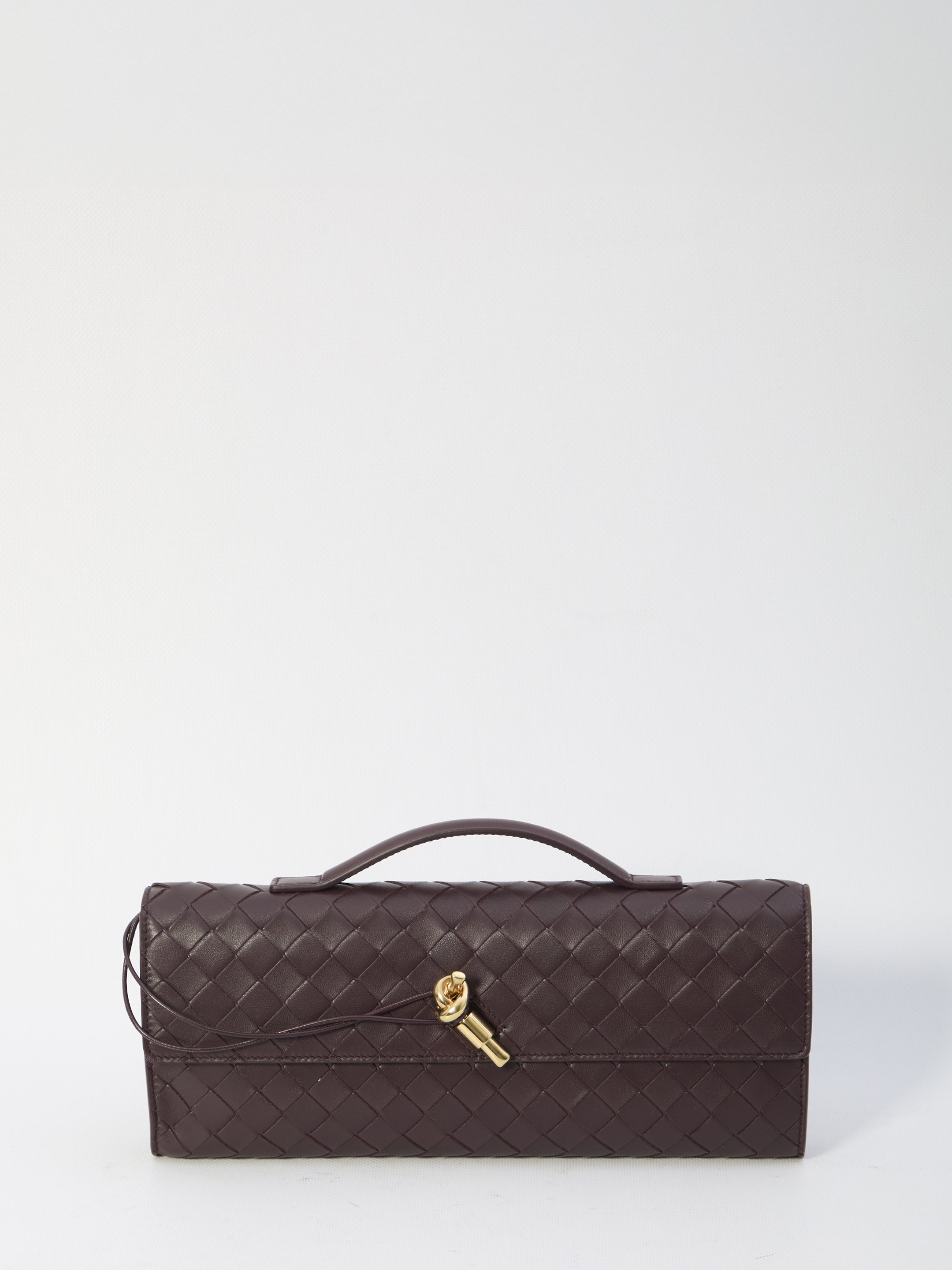 LONG ANDIAMO CLUTCH IN DARK BAROLO LAMBSKIN LEATHER WITH ALL-OVER INTRECCIATO PATTERN. IT FEATURES A TOP HANDLE, METAL KNOT CLOSURE, A MAIN INTERNAL COMPARTMENT, A FLAT INTERNAL POCKET, AND SIX INTERNAL CARD SLOTS. DUST BAG INCLUDED. ANY IMPERFECTIONS IN THE LEATHER SHOULD NOT BE CONSIDERED MANUFACTURING DEFECTS, BUT RATHER A CHARACTERISTIC OF THE MATERIAL.