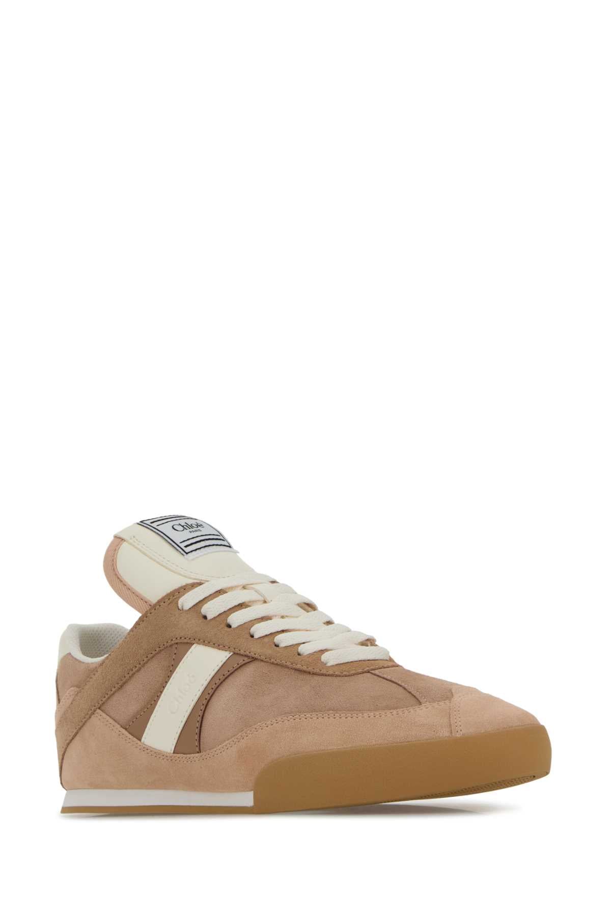Elevate your everyday style with these exquisite Chloé Kick Sneakers in antiqued pink suede. These luxury low-top sneakers feature a sophisticated color palette with tonal pink suede uppers accented by contrasting cream stripes and a distinctive gum sole.