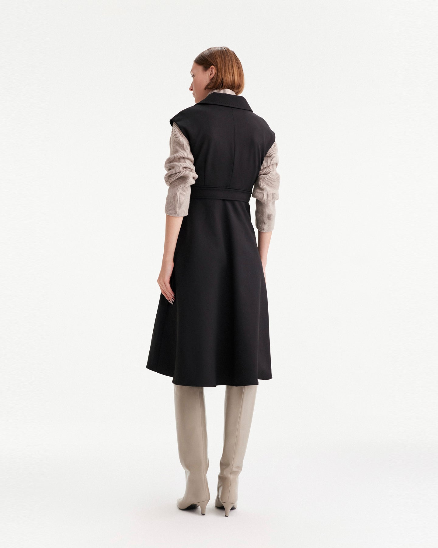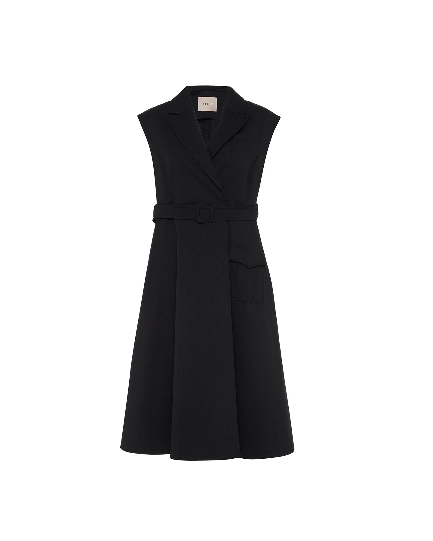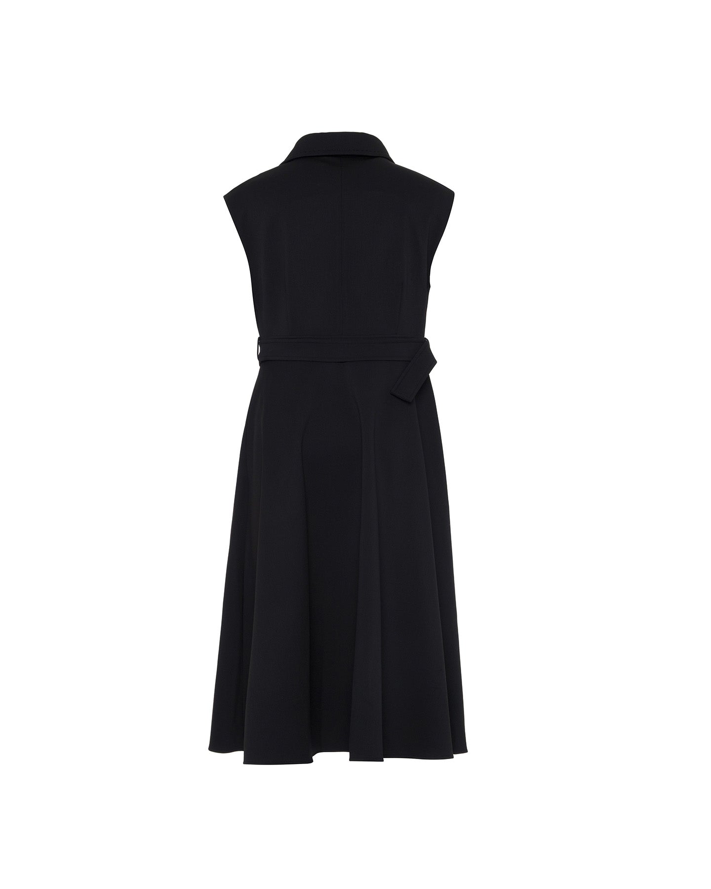 The Aphrodite Belted Sleeveless Coat Dress features an expertly crafted double-breasted design and is made from luxurious four-way stretch suiting fabric, ensuring both comfort and a polished look. With subtle drop shoulders and practical side seam pockets, this versatile piece combines modern elegance with functionality. The adjustable belt cinches the waist for a flattering, tailored fit.