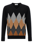 Elevate your knitwear collection with this sophisticated argyle pattern sweater from Ballantyne. Crafted from luxurious cashmere, this timeless piece features a striking front jacquard design in complementary shades of grey, camel, and black.