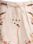 Zimmermann linen "Ascension" short with natural long-fiber fabric structure. High-waisted silhouette defined by front pleats, invisible back zipper closure and sharp profile in leg setting. Removable knotted belt placed through belt loops is finished with wooden elements. Side pockets are integrated between the seams, and the hem has a beaded applique finish.