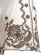 Zimmermann linen "Ascension" short, constructed of 100 percent linen fabric, features a high-waisted construction with a removable leather belt and belt loops. The garment features an invisible back zipper closure. The edge profile, including the waistband, is finished with scalloped embroidery. The item is lined, featuring a straight silhouette and functional details integrated into the construction.