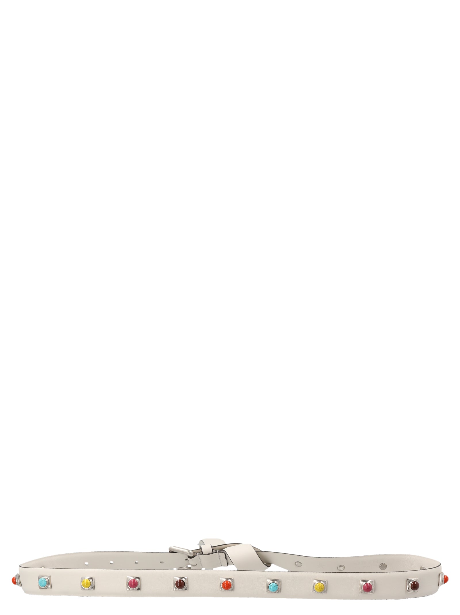 Featuring eye-catching stone and metal appliqués along the strap, this belt adds a touch of artisanal elegance to your wardrobe. The polished metal buckle provides both functionality and refined style.
