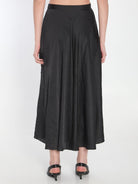 ASYMMETRICAL MIDI SKIRT IN CRINKLED BLACK POLYESTER SATIN. IT FEATURES A ZIP CLOSURE WITH A SIDE HOOK, DRAPED DETAILING, AND AN ASYMMETRICAL HEM.