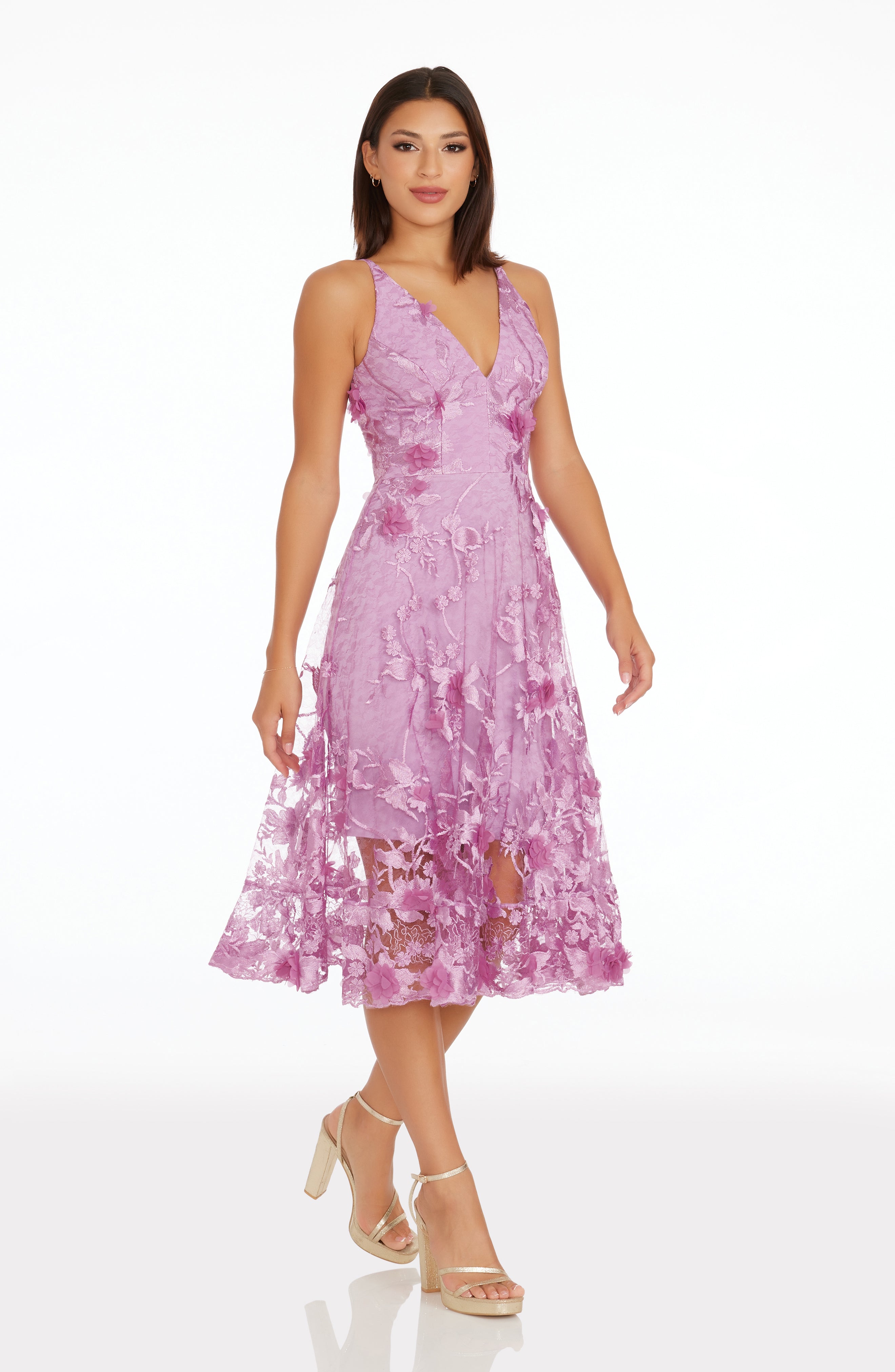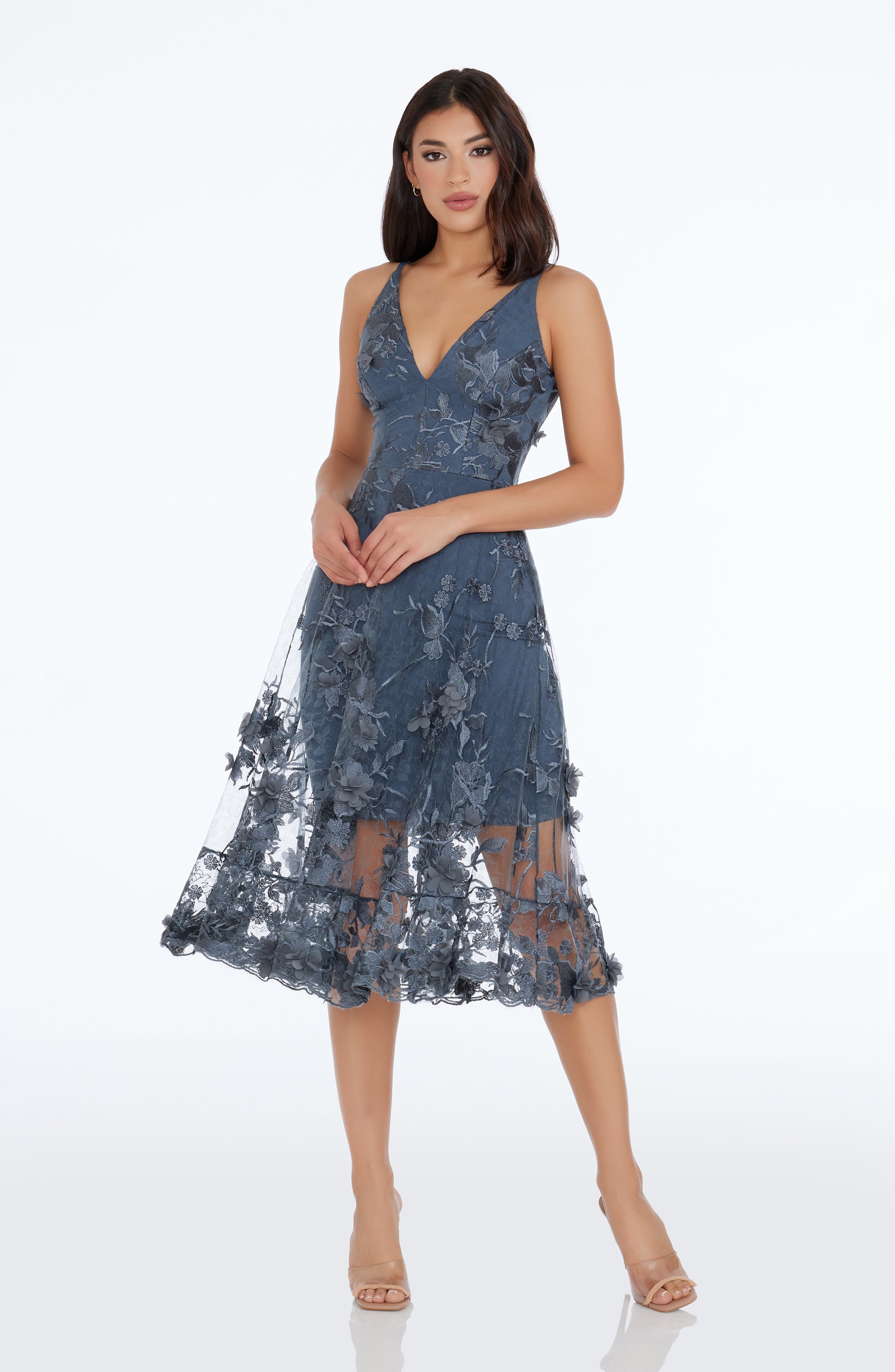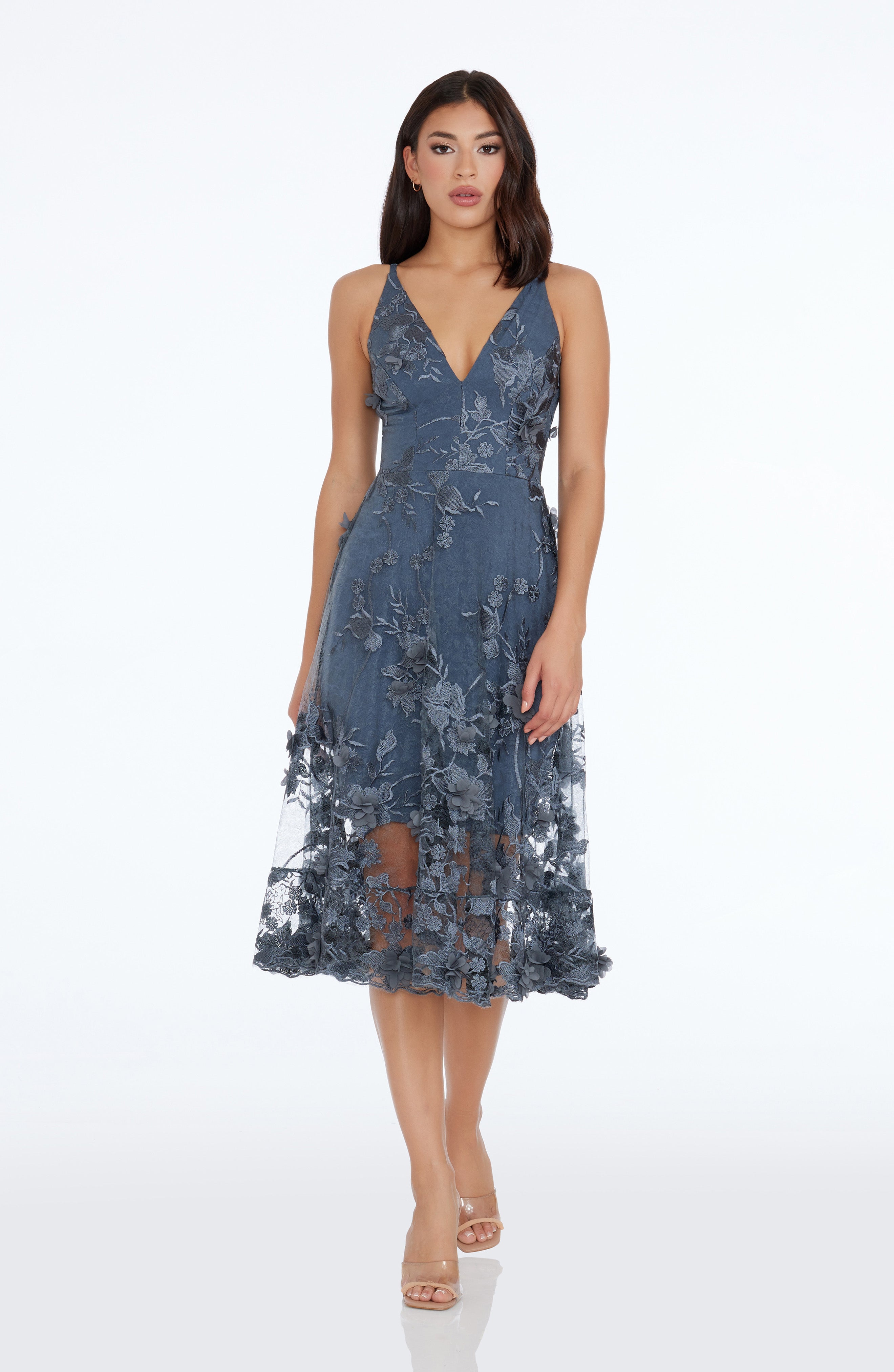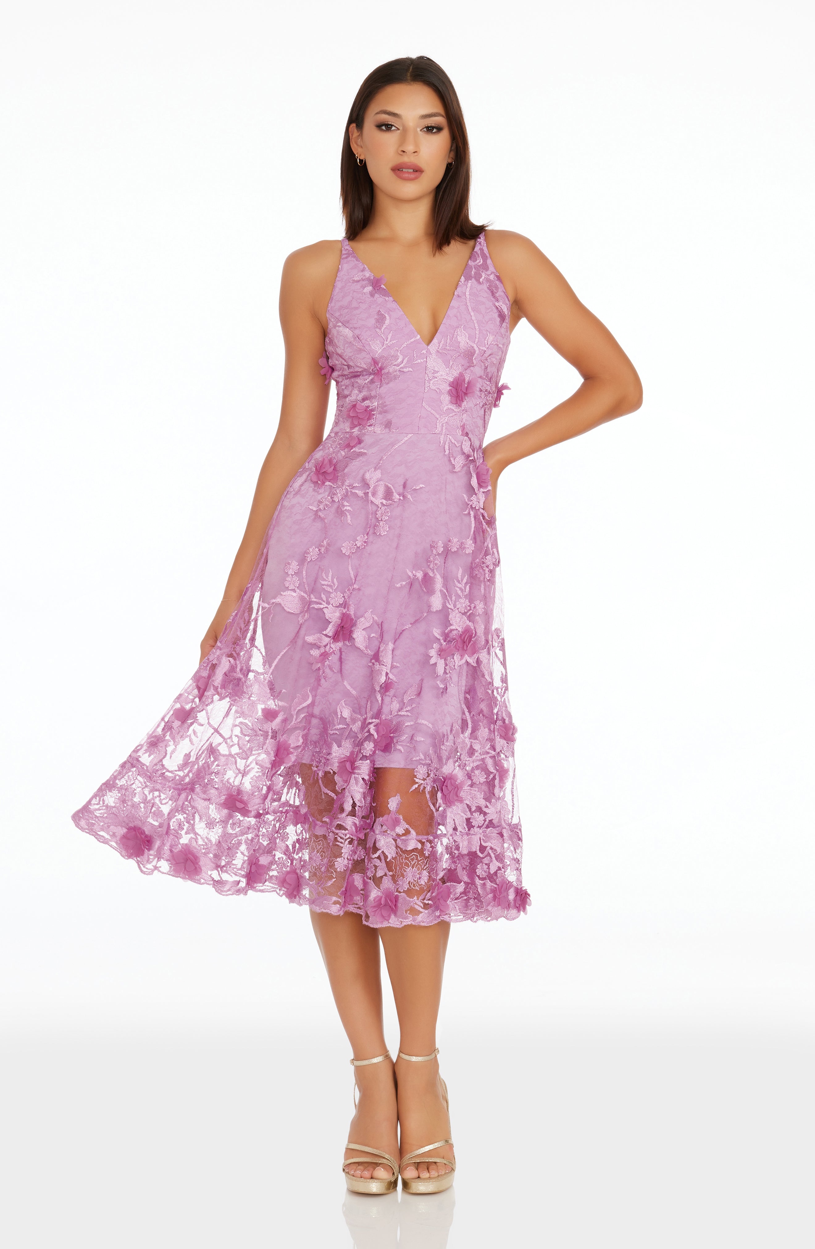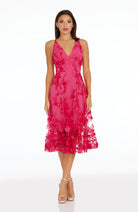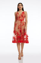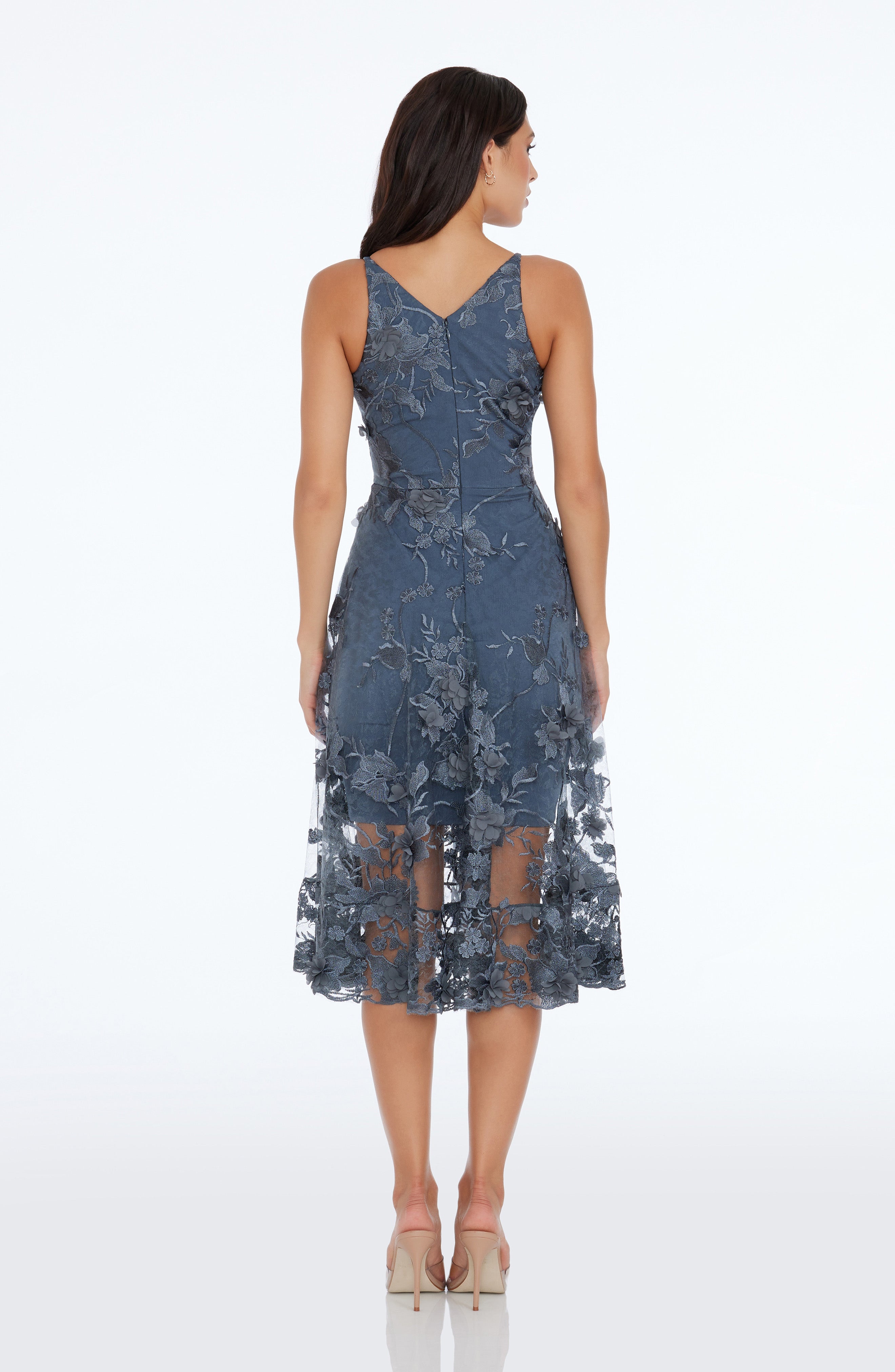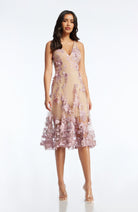 A lush garden is created with beautiful floral embellishments on this one-of-a-kind dress. This spectacular dress has a sleeveless bodice and mini skirt underneath a mesh-lace overlay. The sheer overlay is heavily adorned with floral embroidery and applique and has a flowy midi-length A-line skirt. Thin straps and a matching v-neck and back make the Audrey dress a perfect option for dressy springtime events.