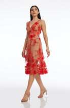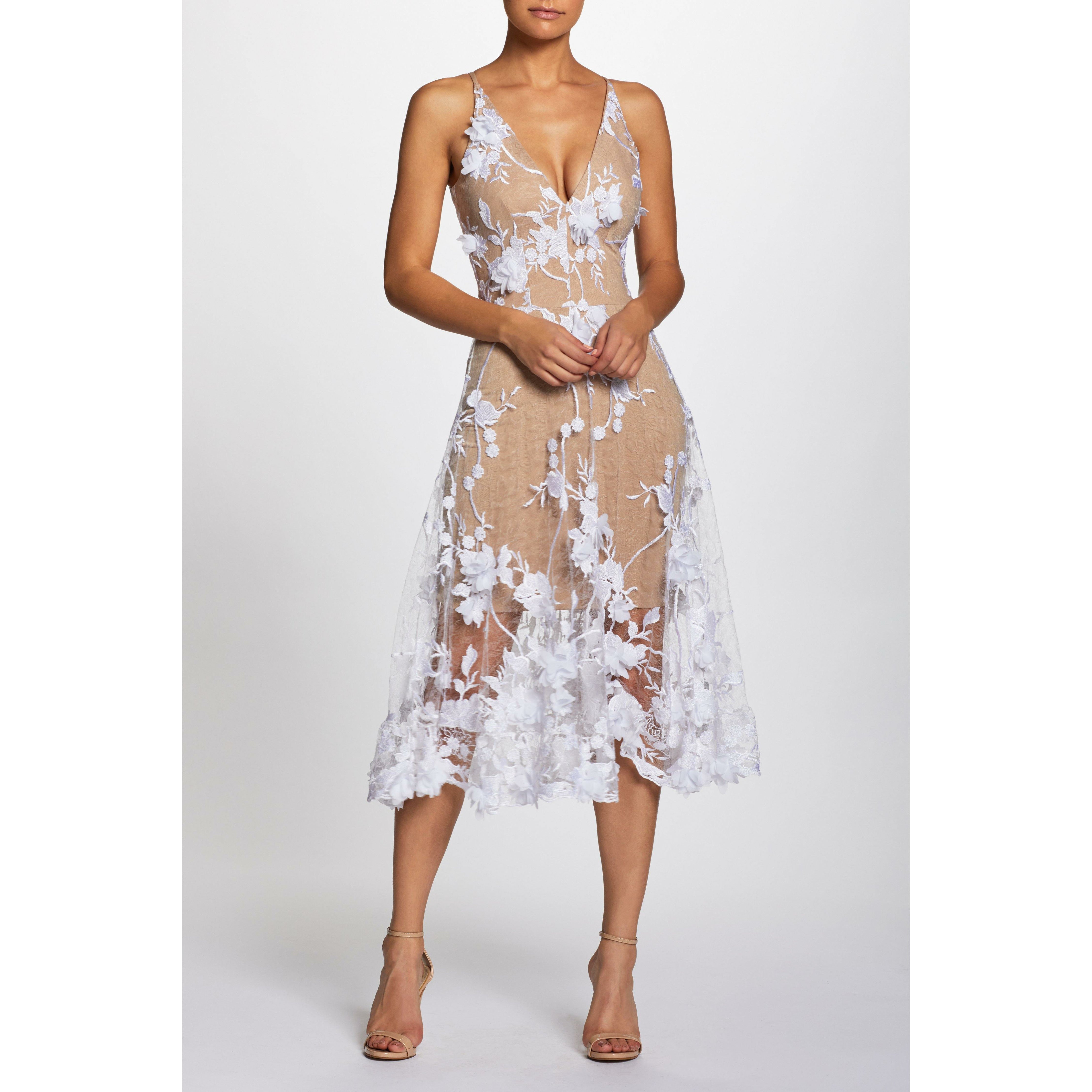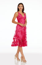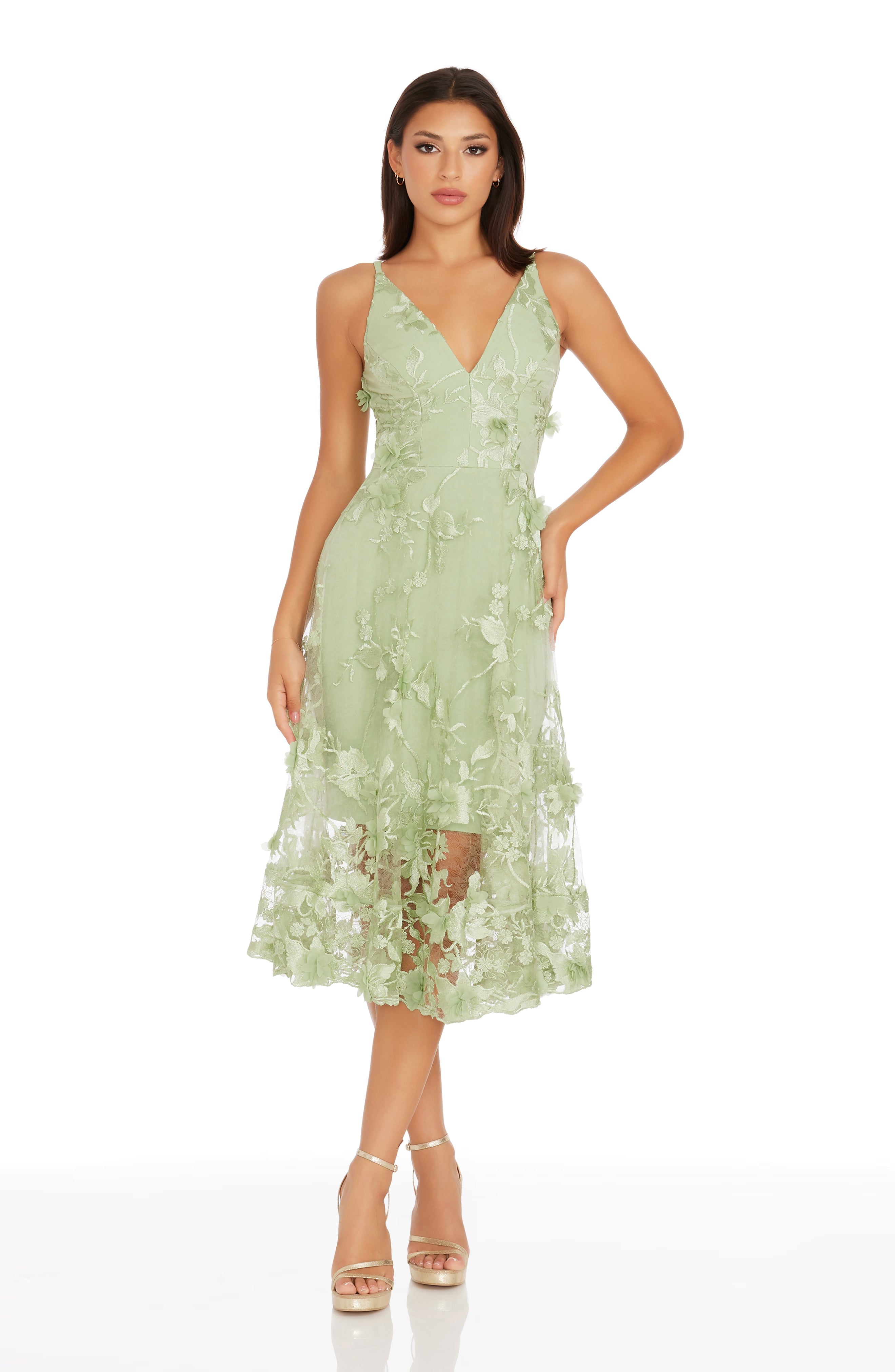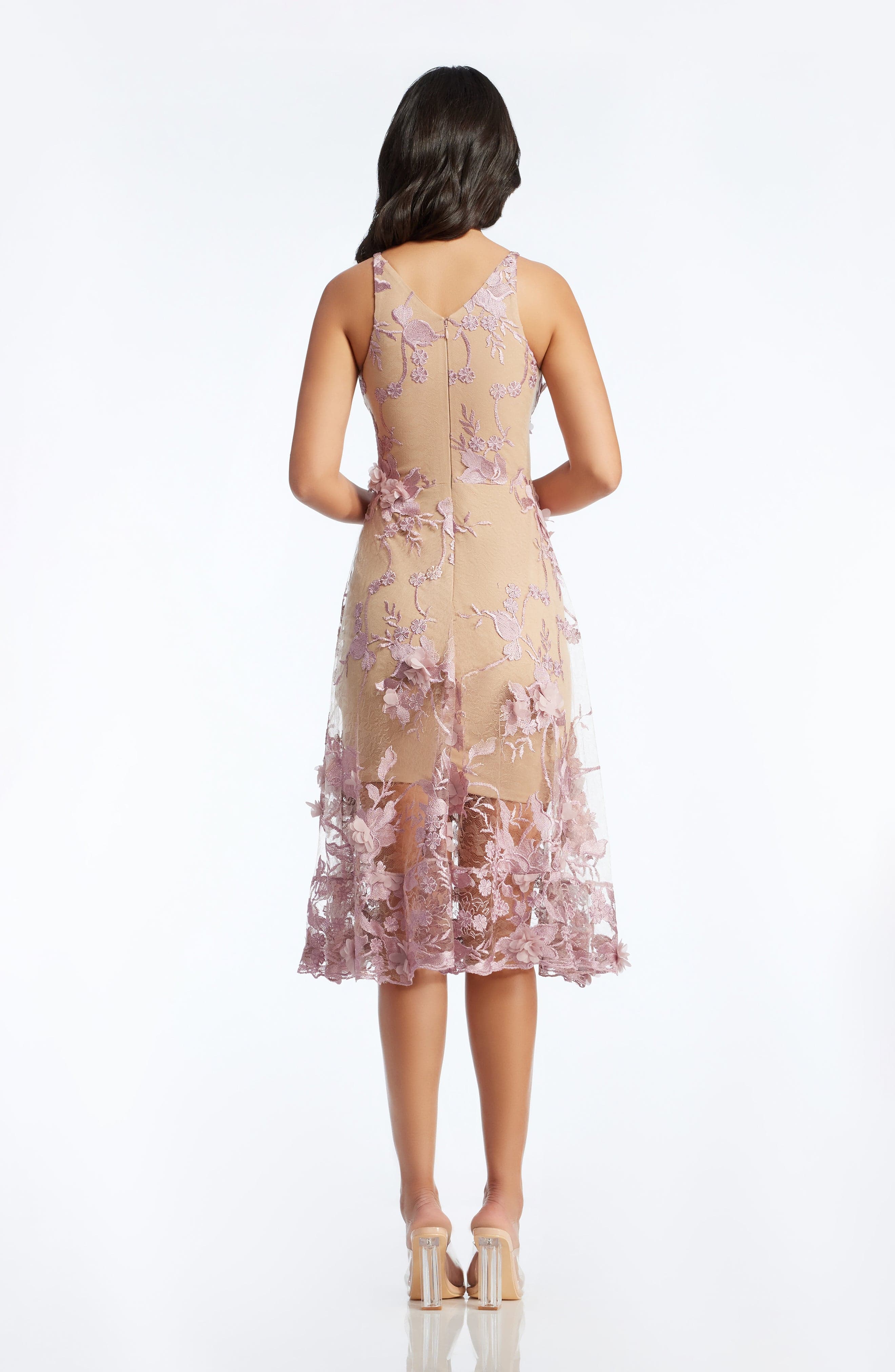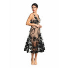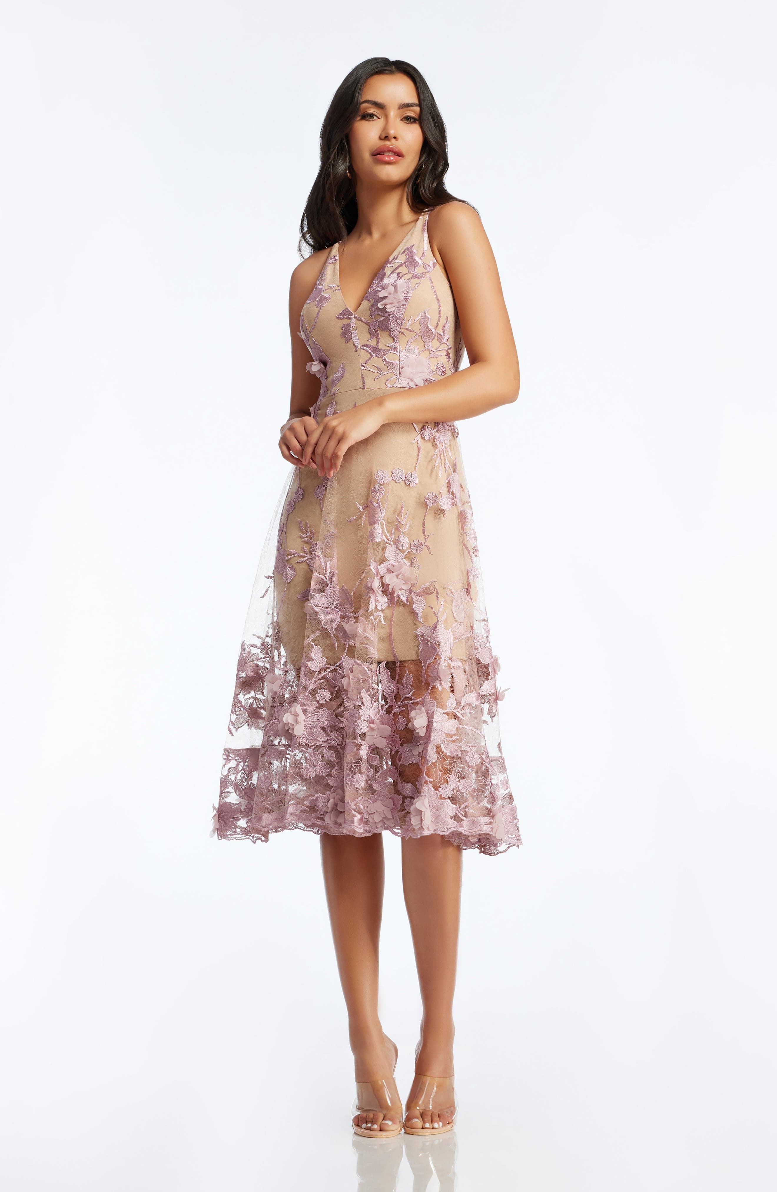 A lush garden is created with beautiful floral embellishments on this one-of-a-kind dress. This spectacular dress has a sleeveless bodice and mini skirt underneath a mesh-lace overlay. The sheer overlay is heavily adorned with floral embroidery and applique and has a flowy midi-length A-line skirt. Thin straps and a matching v-neck and back make the Audrey dress a perfect option for dressy springtime events.